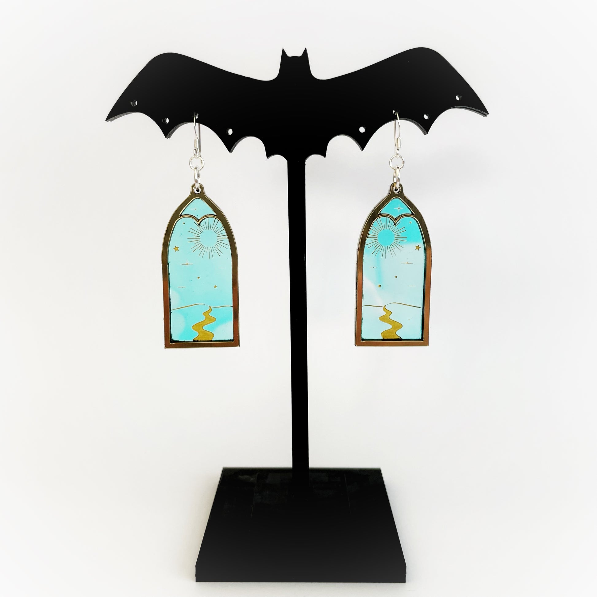 These beauties are an original design by the minds at "Apothecurius" and are made from Lasercut Iridescent and Brushed Gold 2-ply acrylic. The designs are laser engraved and infilled using gold acrylic paint.