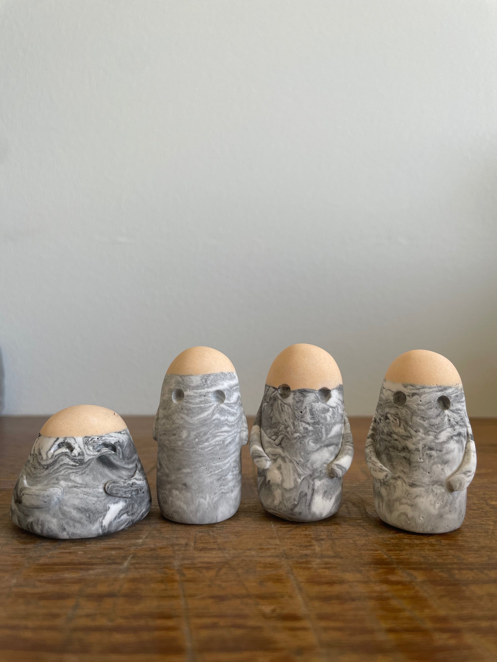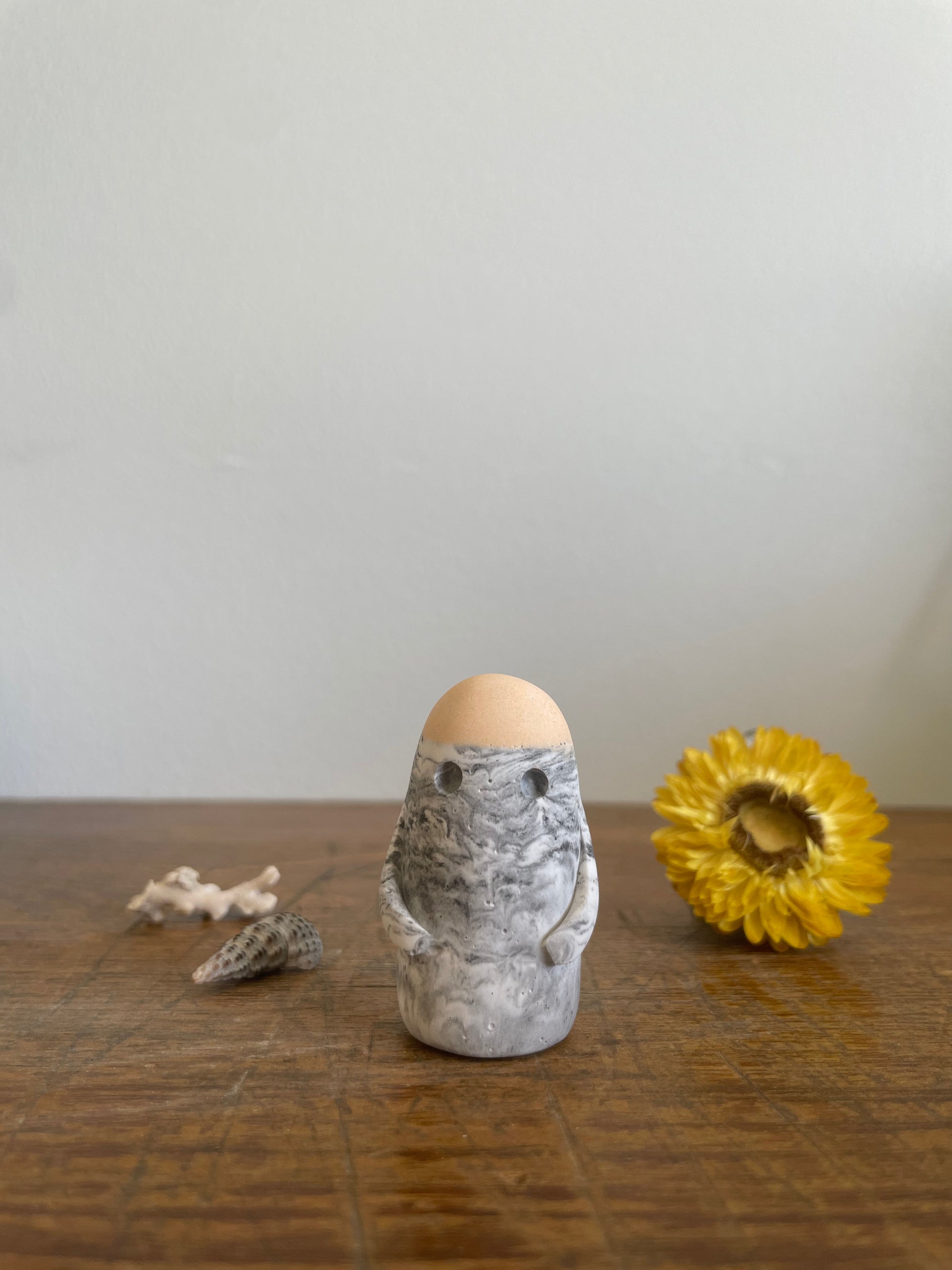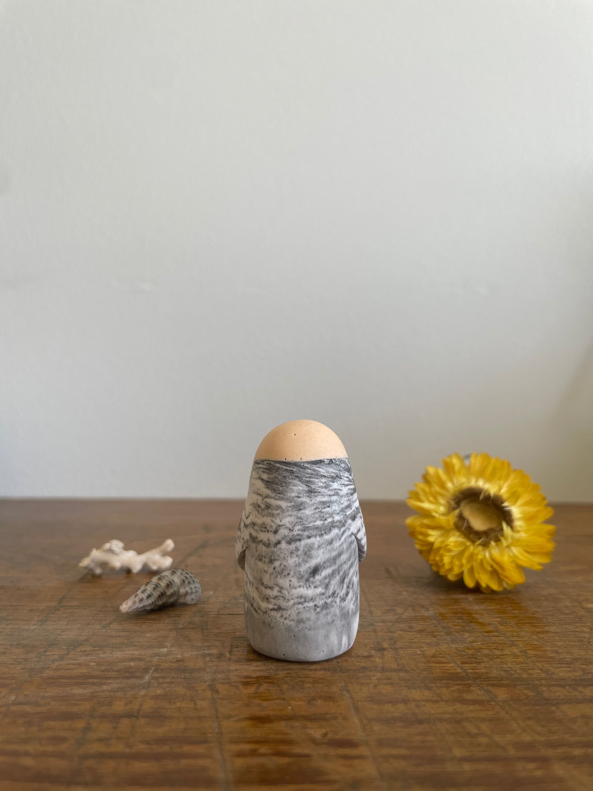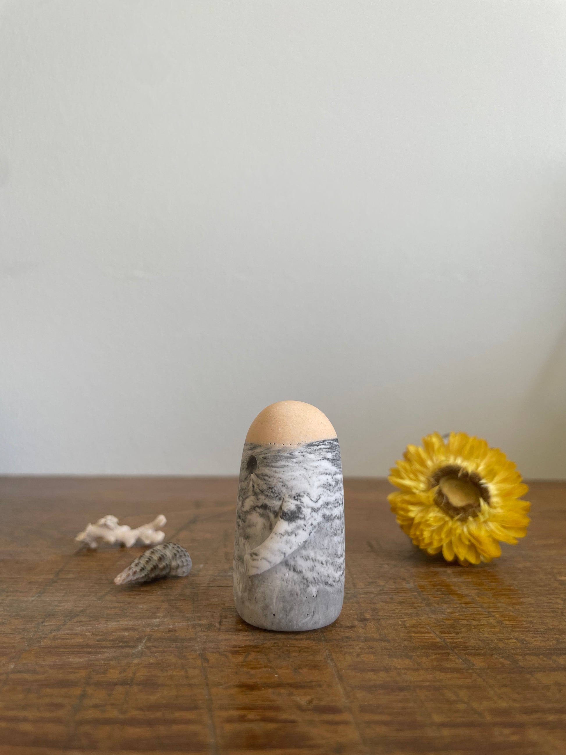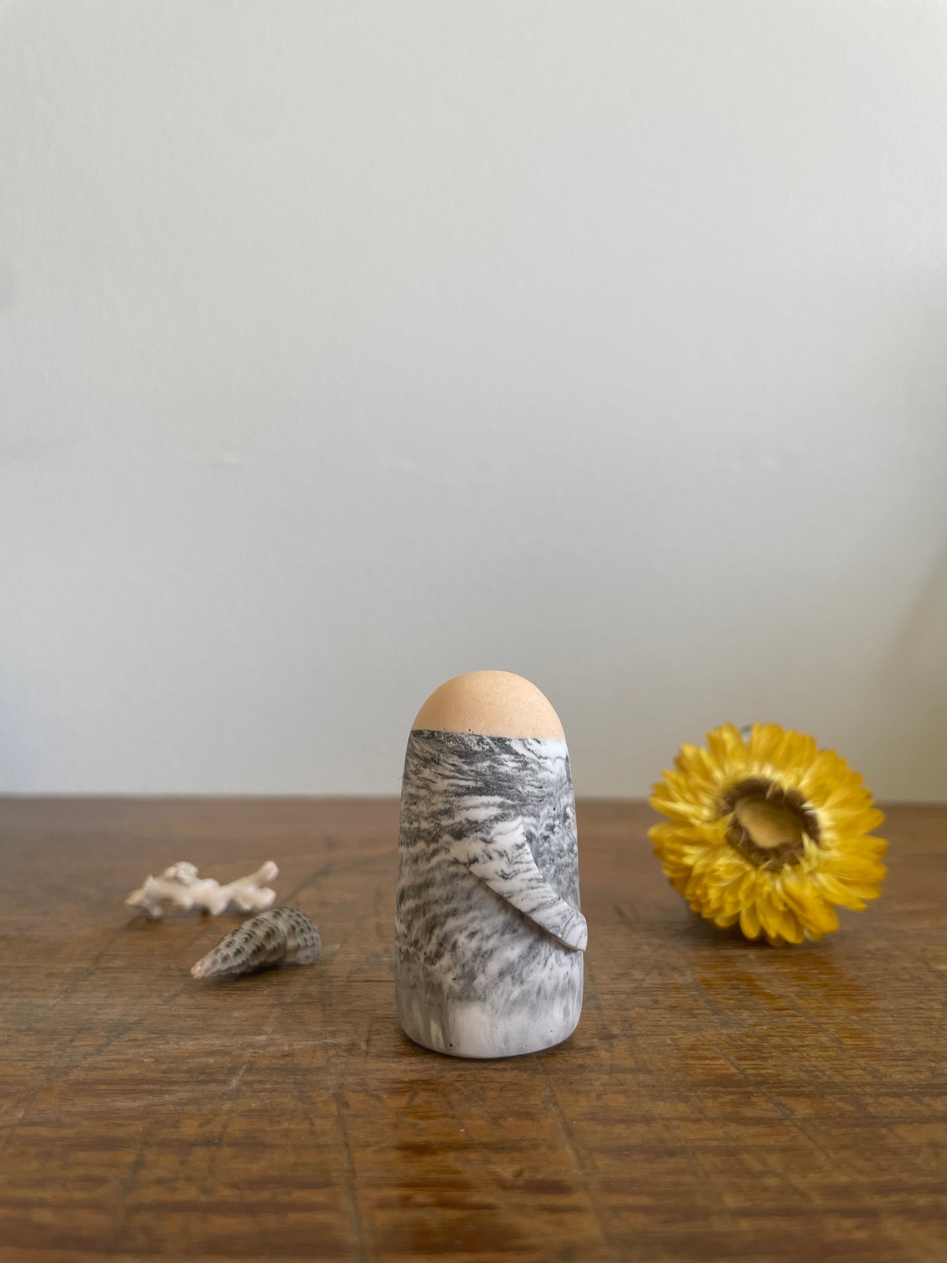 This Domie pictured features a grey/silver and white marbling colour on the body with a peach crown and long arms. It is approximately 4.9 cm tall.