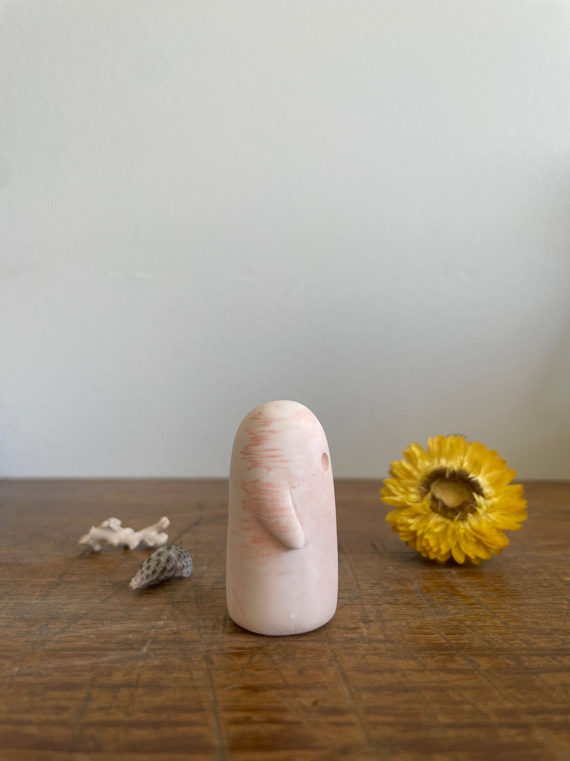 This Domie pictured features a very slight burnt orange and white marbling colour on the body with short, stumpy arms. It is approximately 4.7 cm tall.
