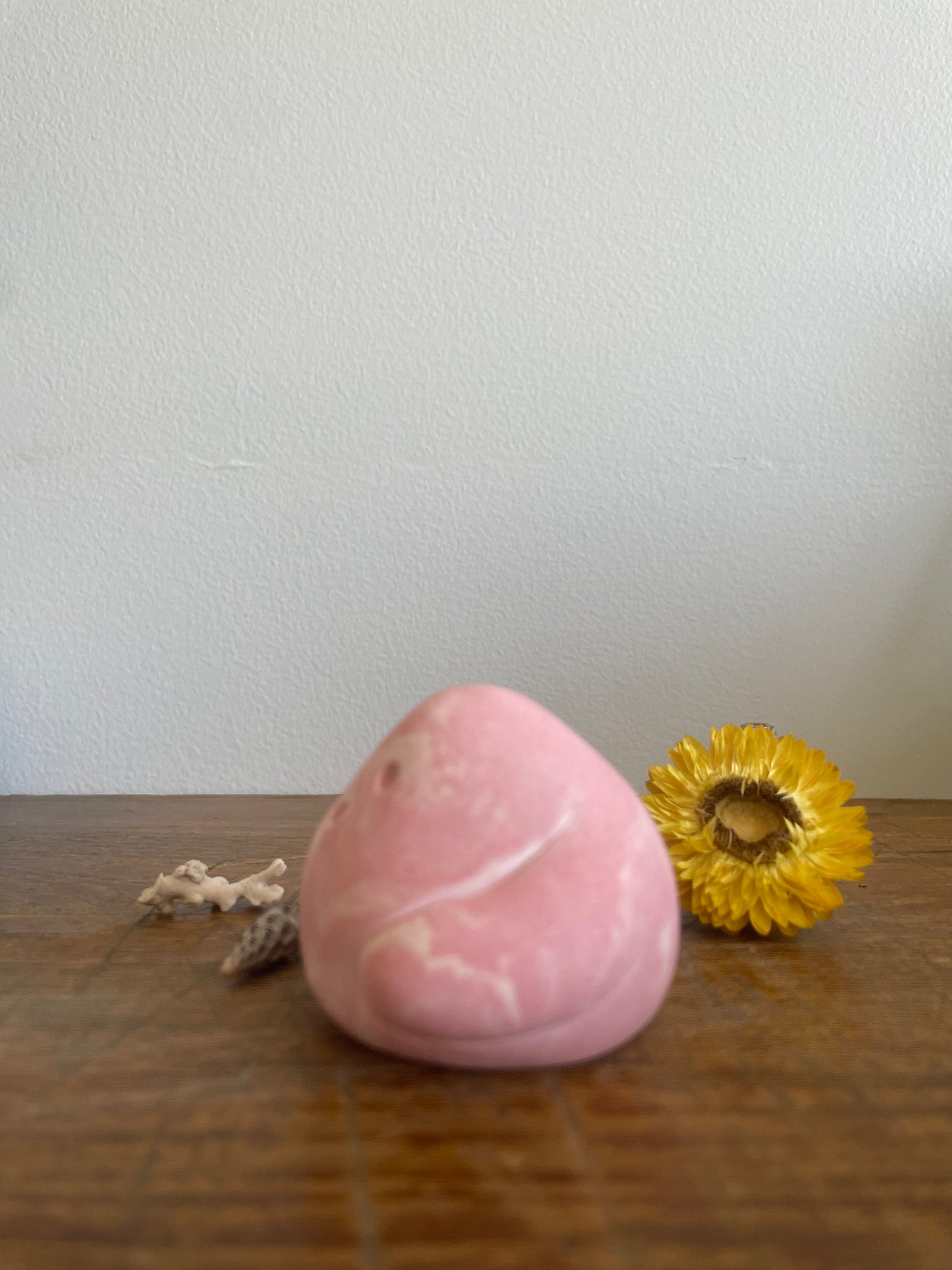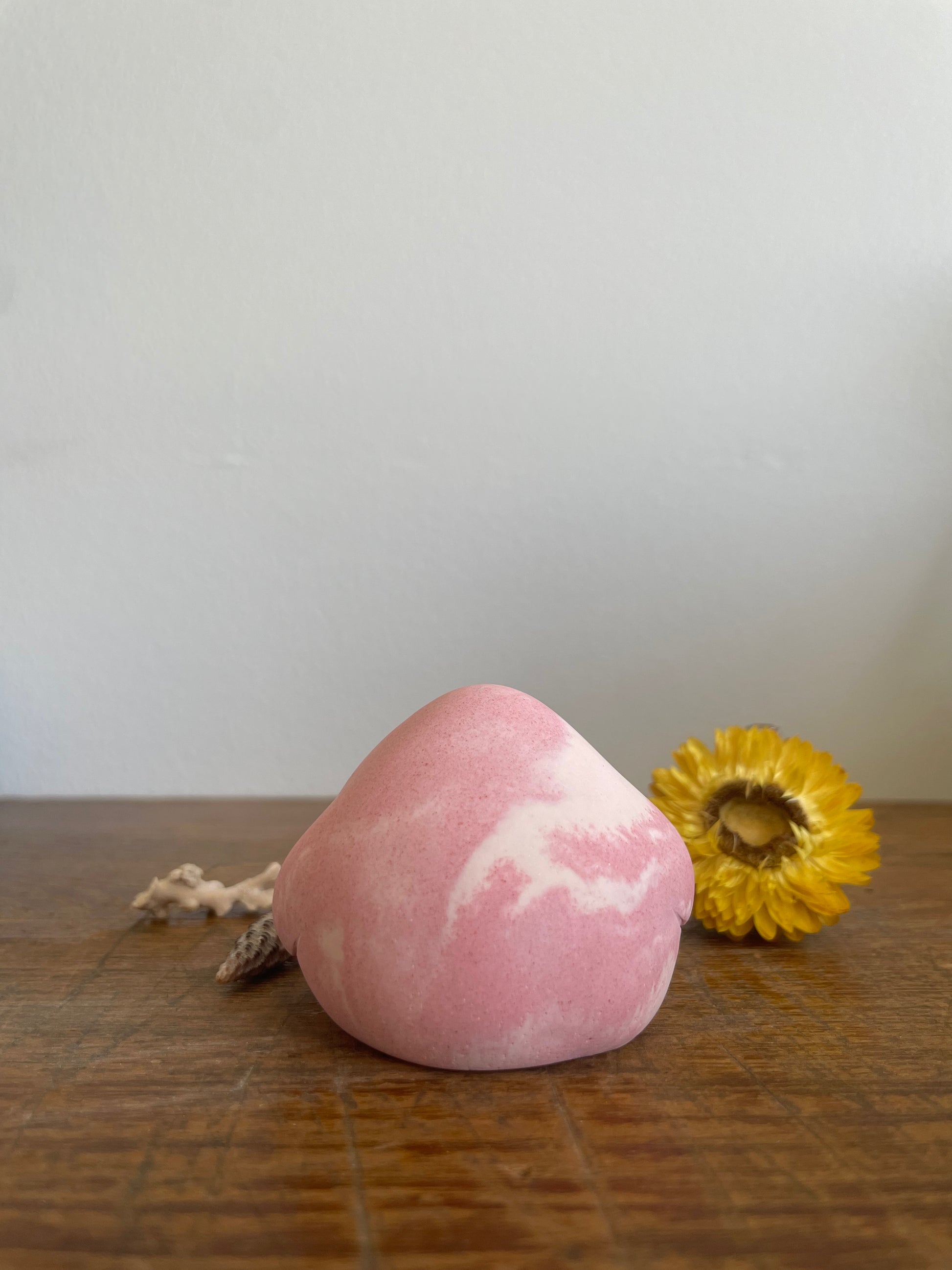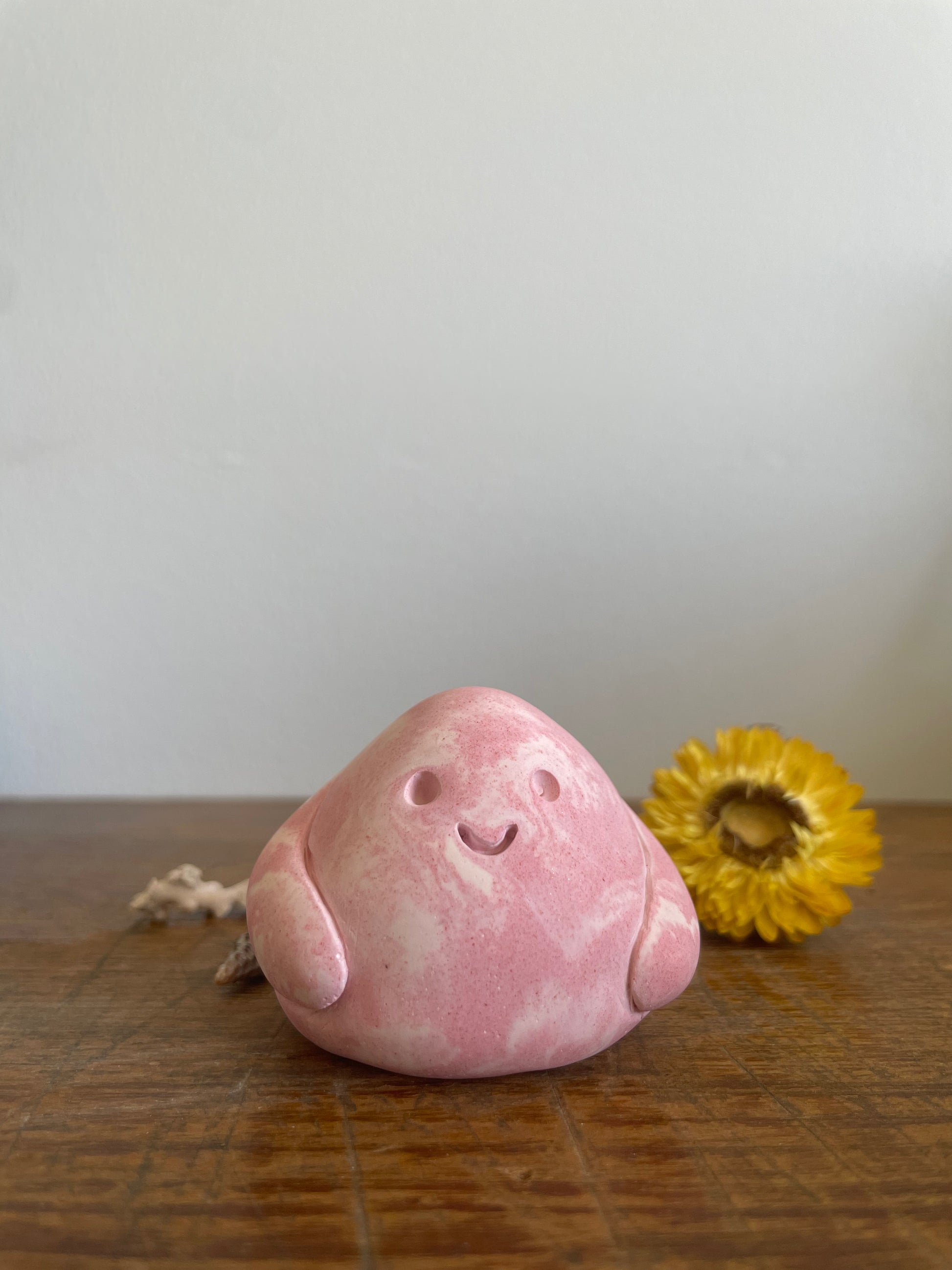 This Domie pictured features a pink and white marbling colour all over its large, dumpling-like body with long, wide arms resting at its side. It is approximately 5cm tall.