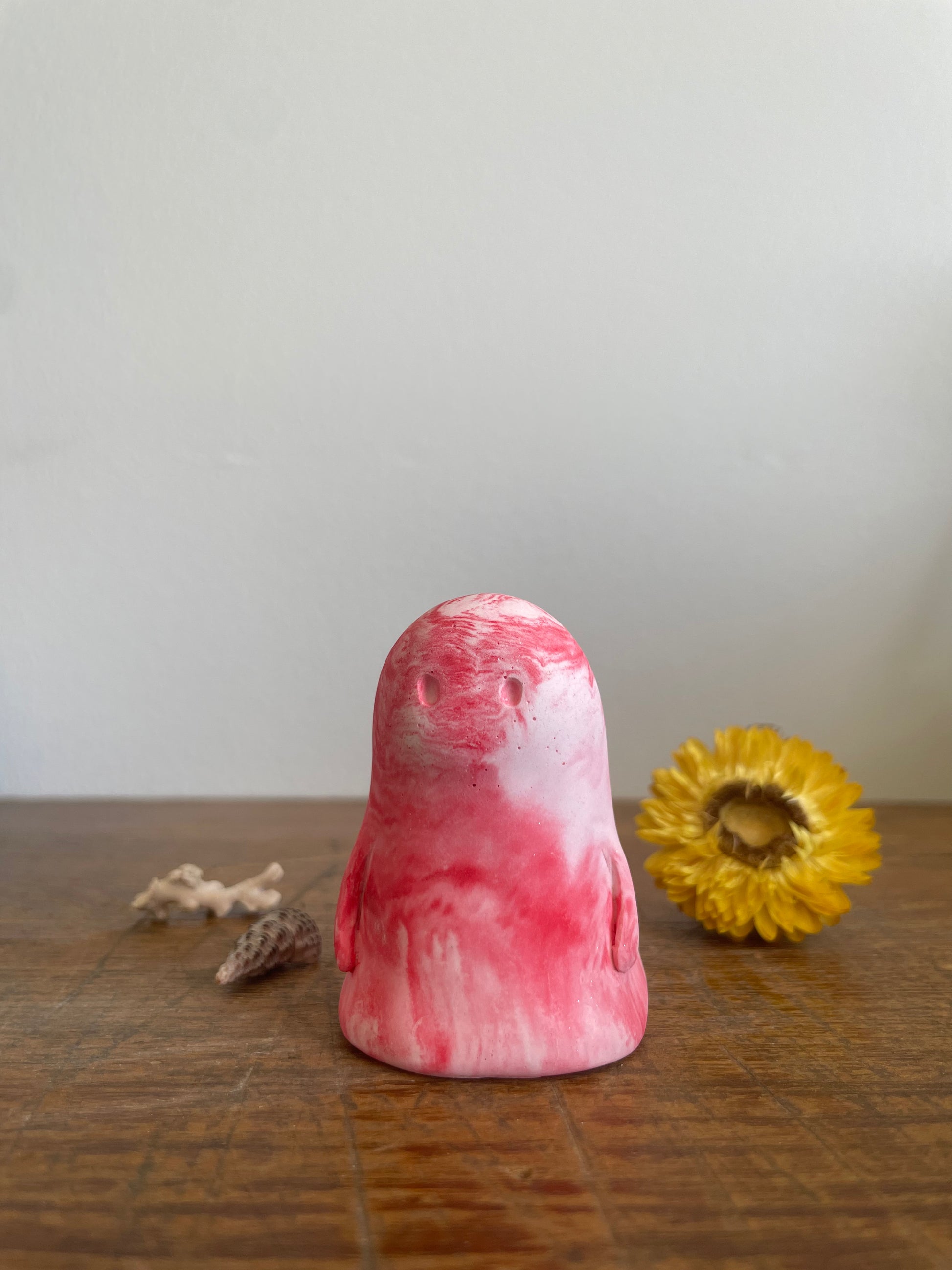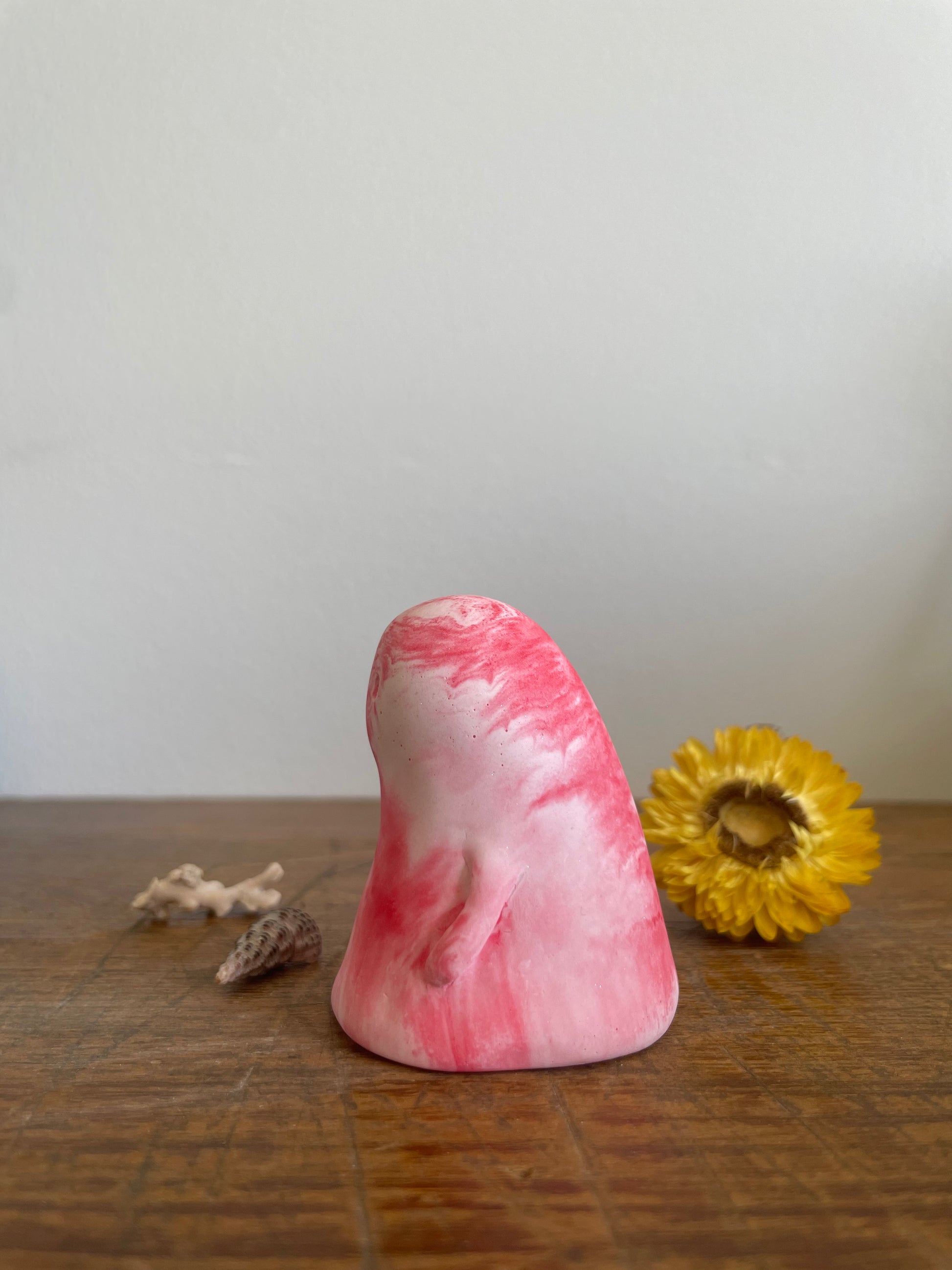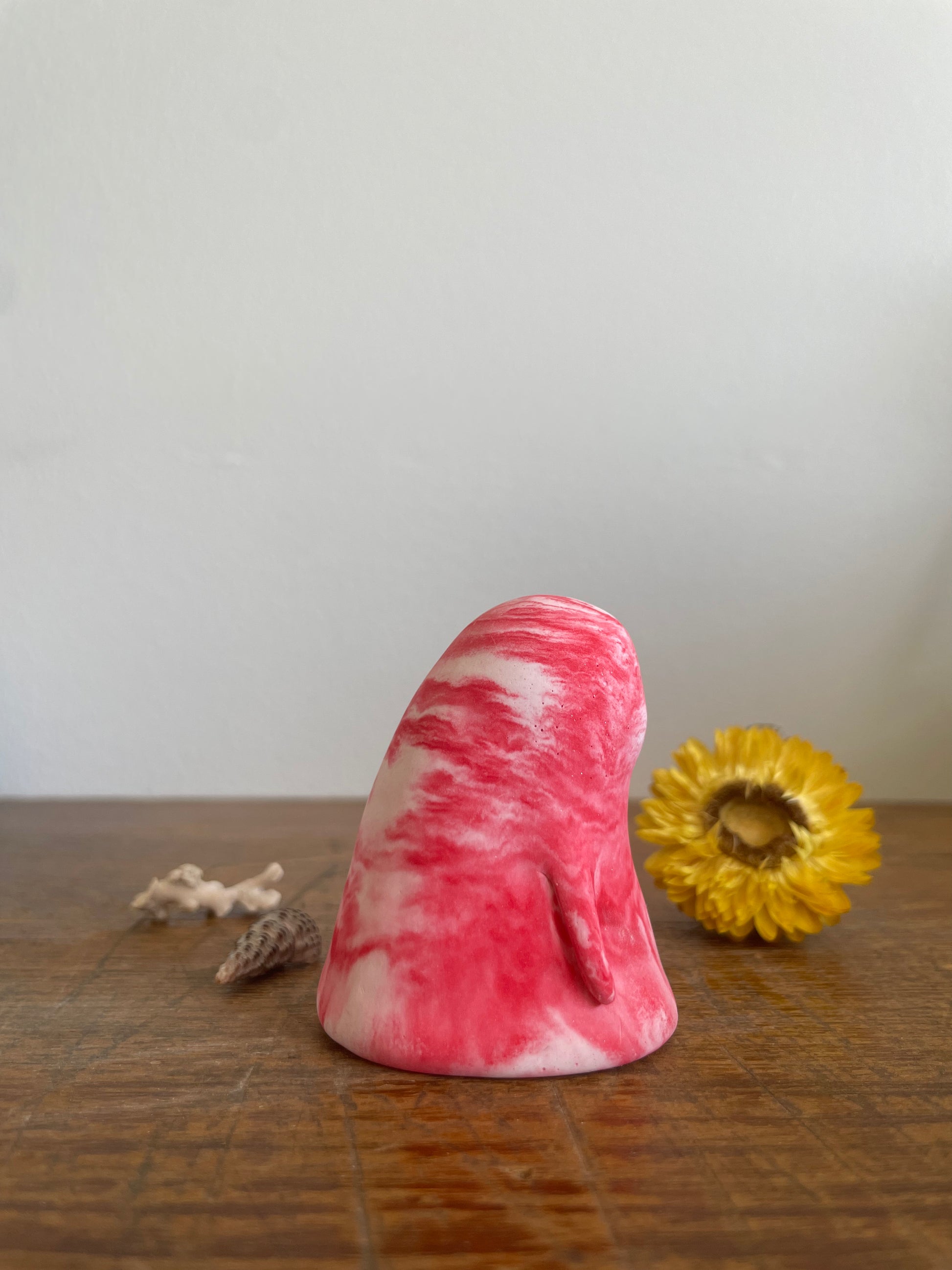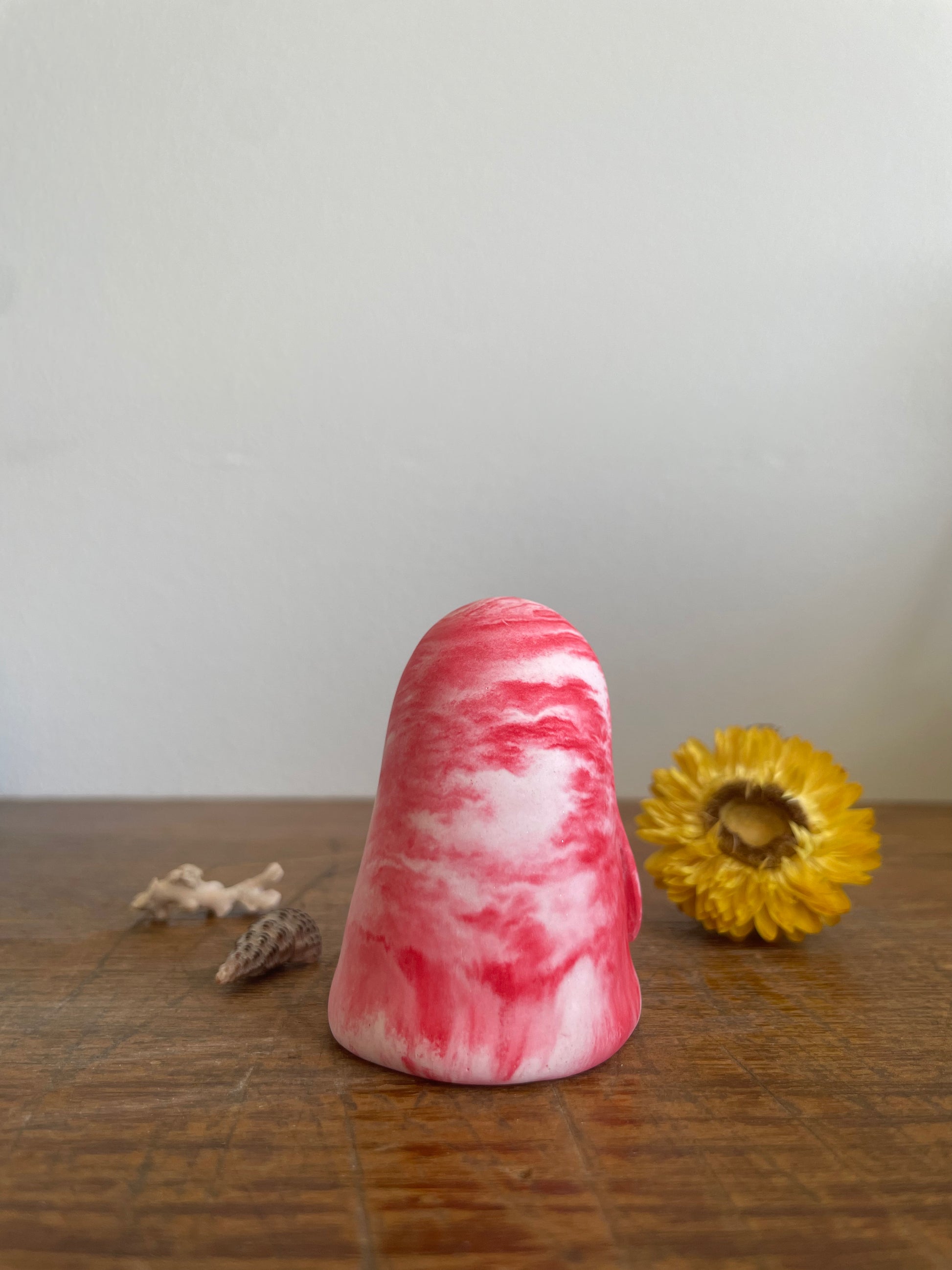 This Domie pictured features a red and white marbling colour with medium arms resting at its side. It is approximately 6cm tall.
