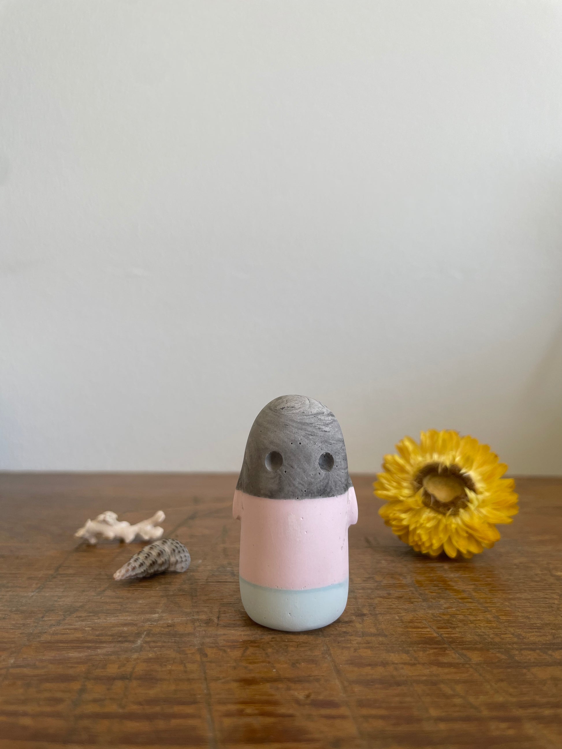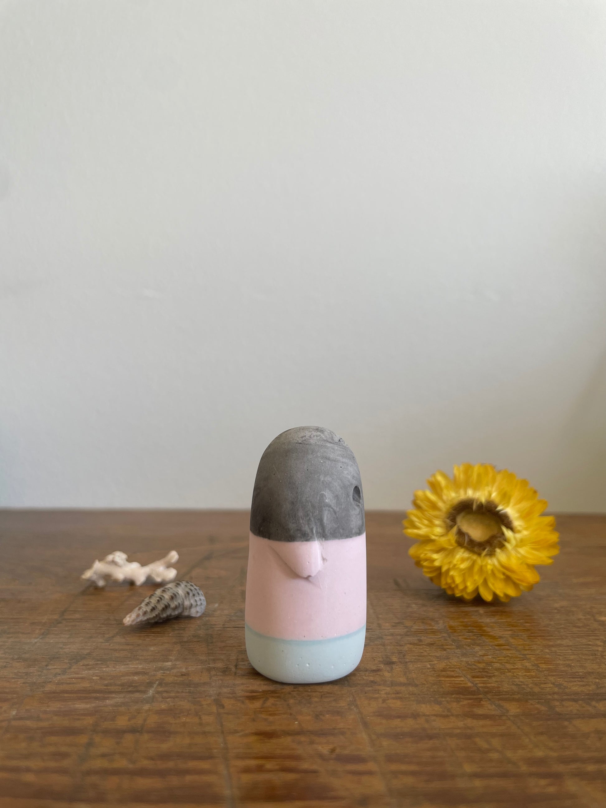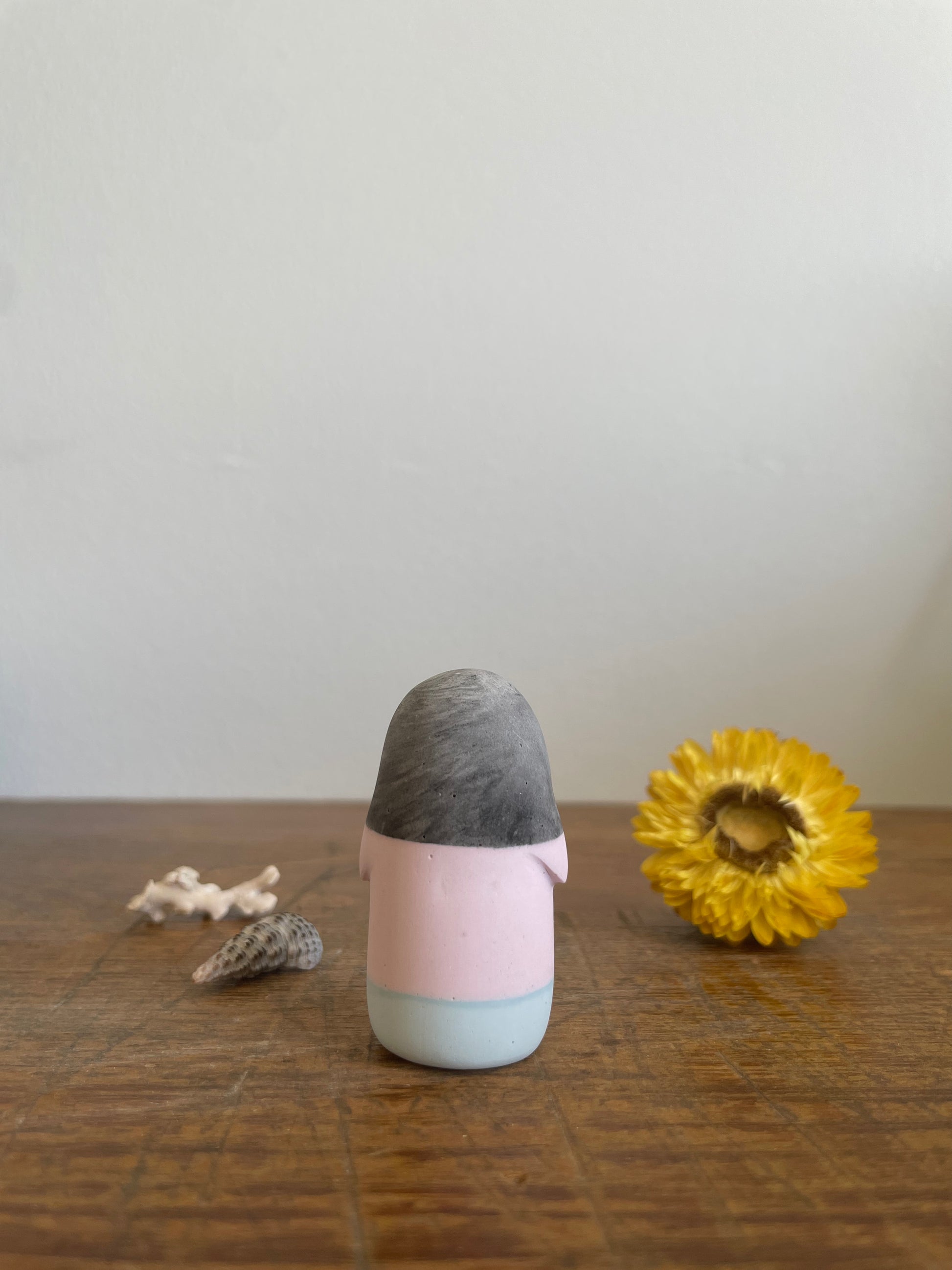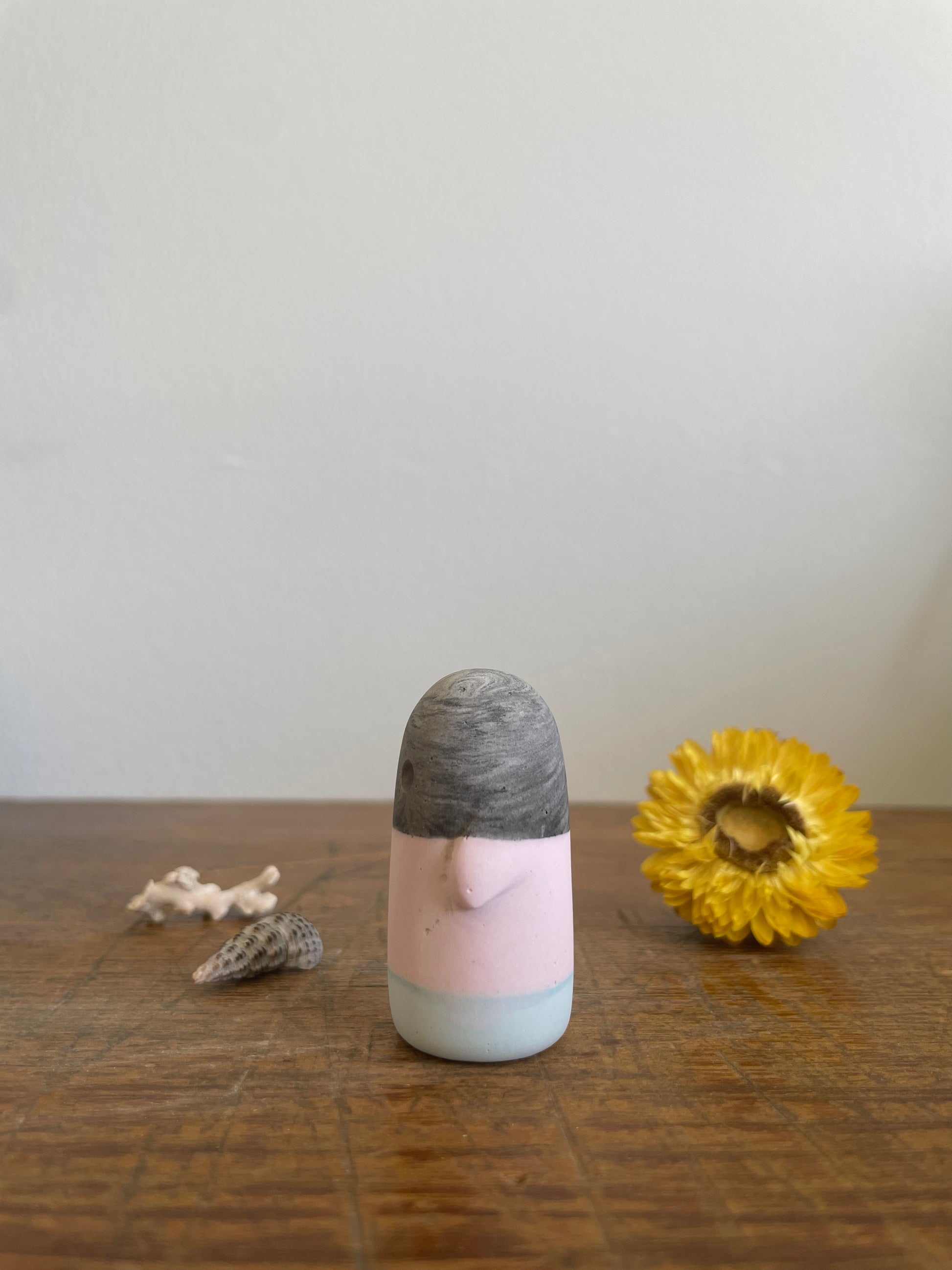 This Domie pictured features a grey/black marbling colour on the head, a pale pink body and light blue base with short, stumpy arms resting at its side. It is approximately 4.9 cm tall.