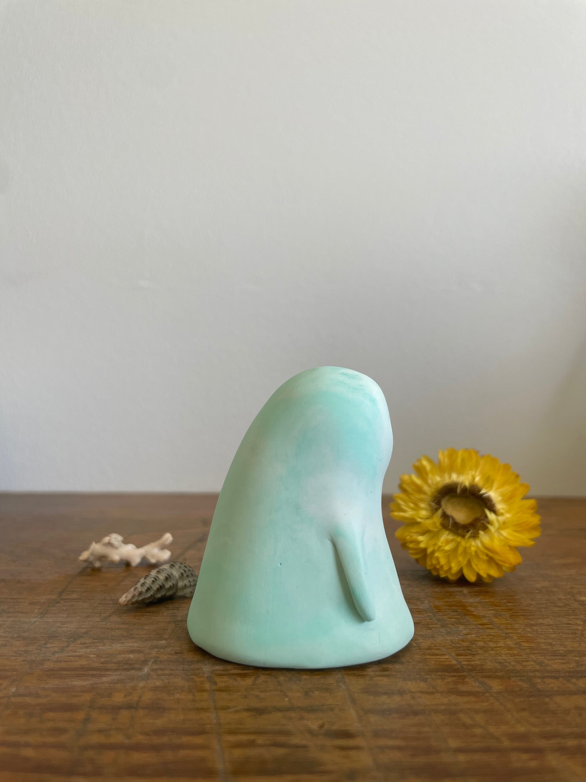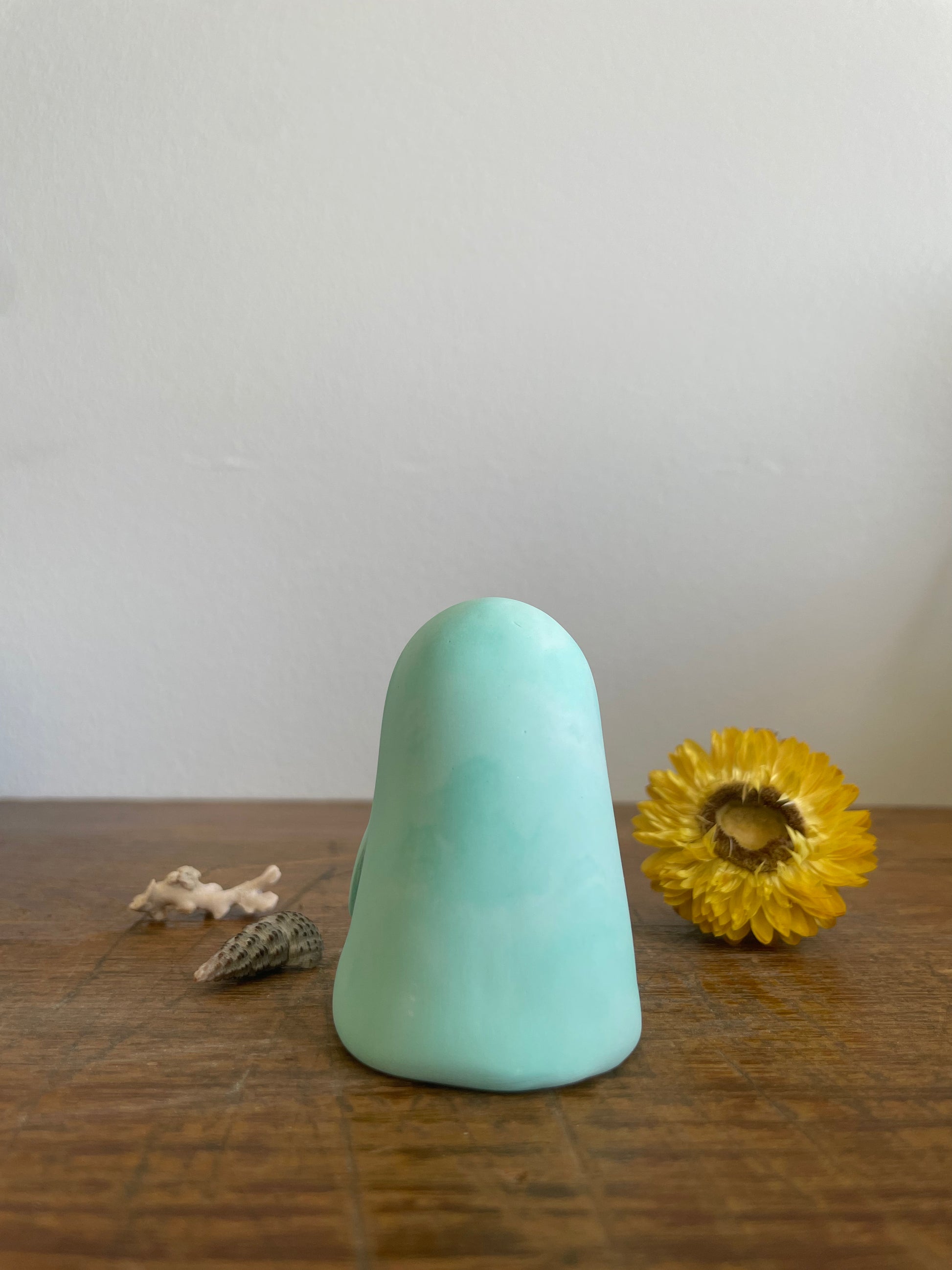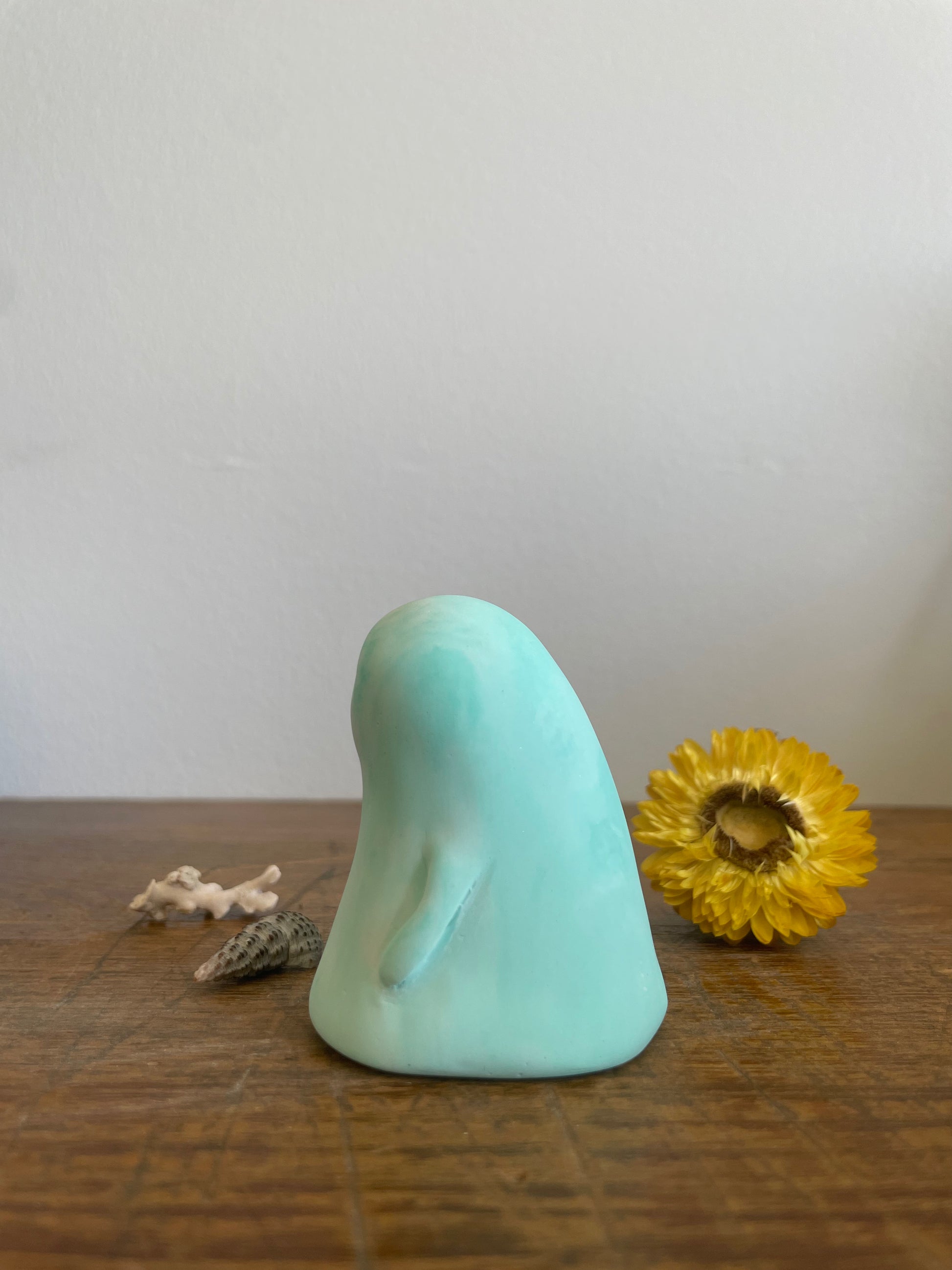 This Domie pictured features a pastel green and white marbling colour all over with medium arms resting at its side. It is approximately 6cm tall.