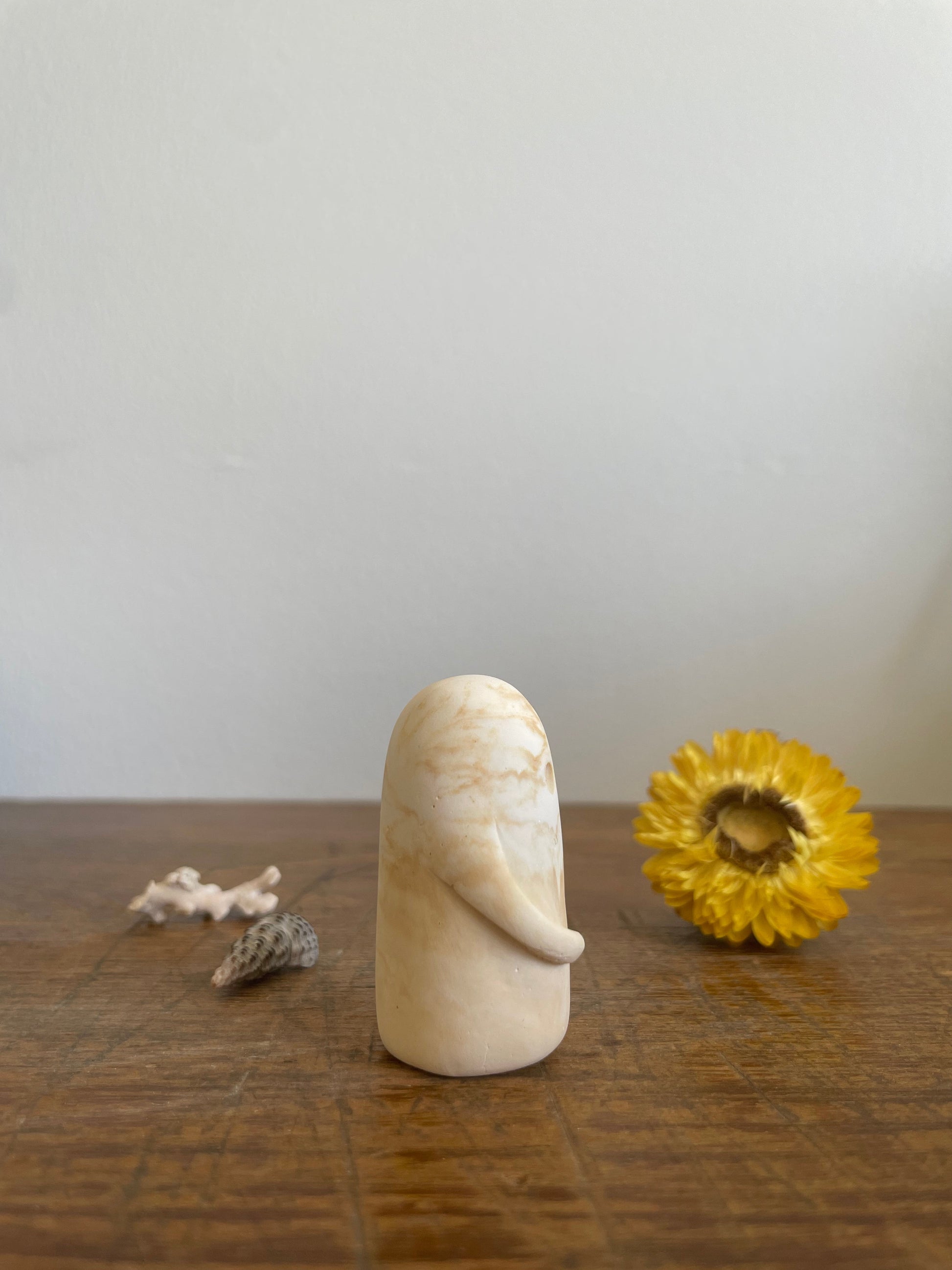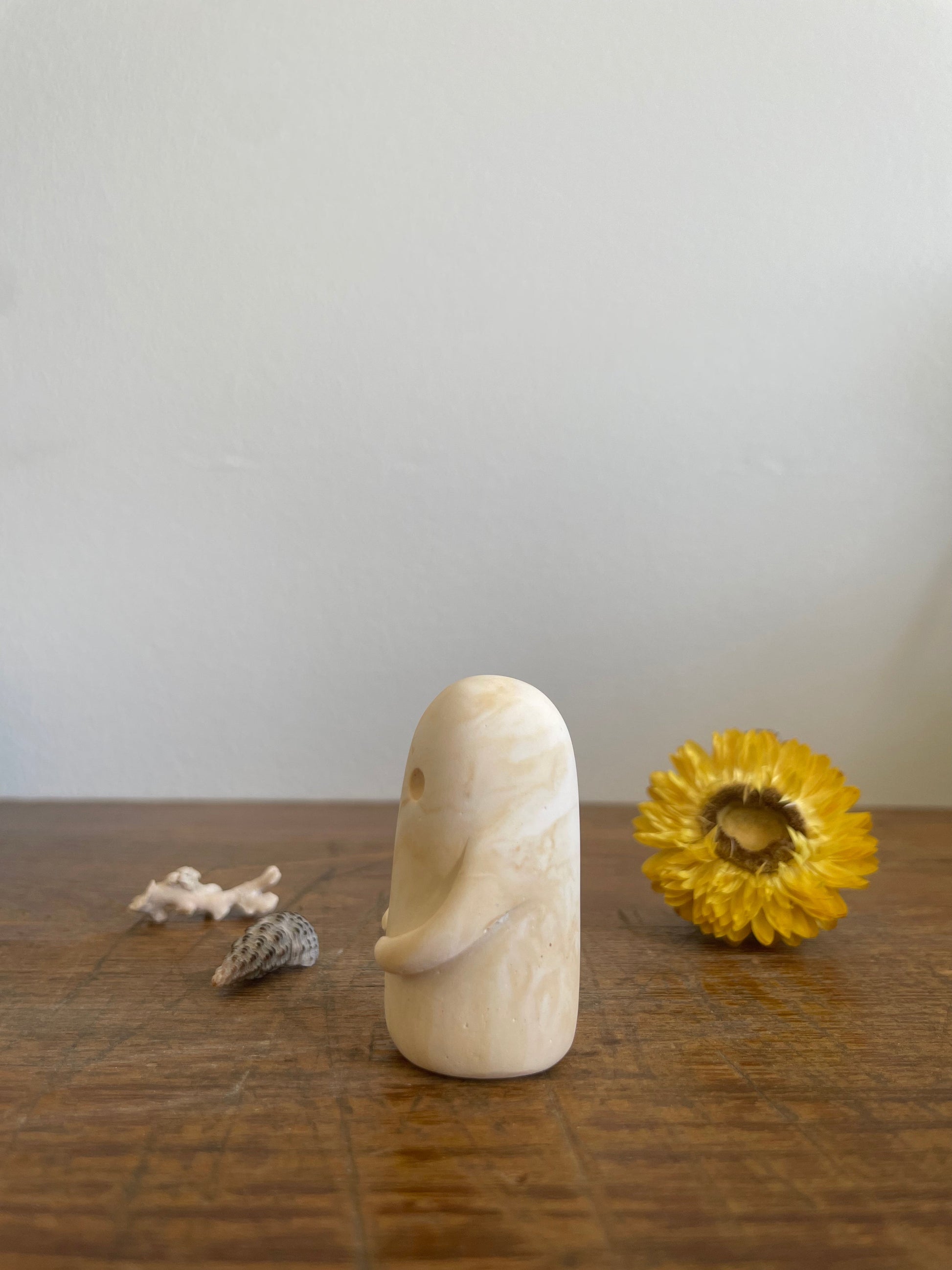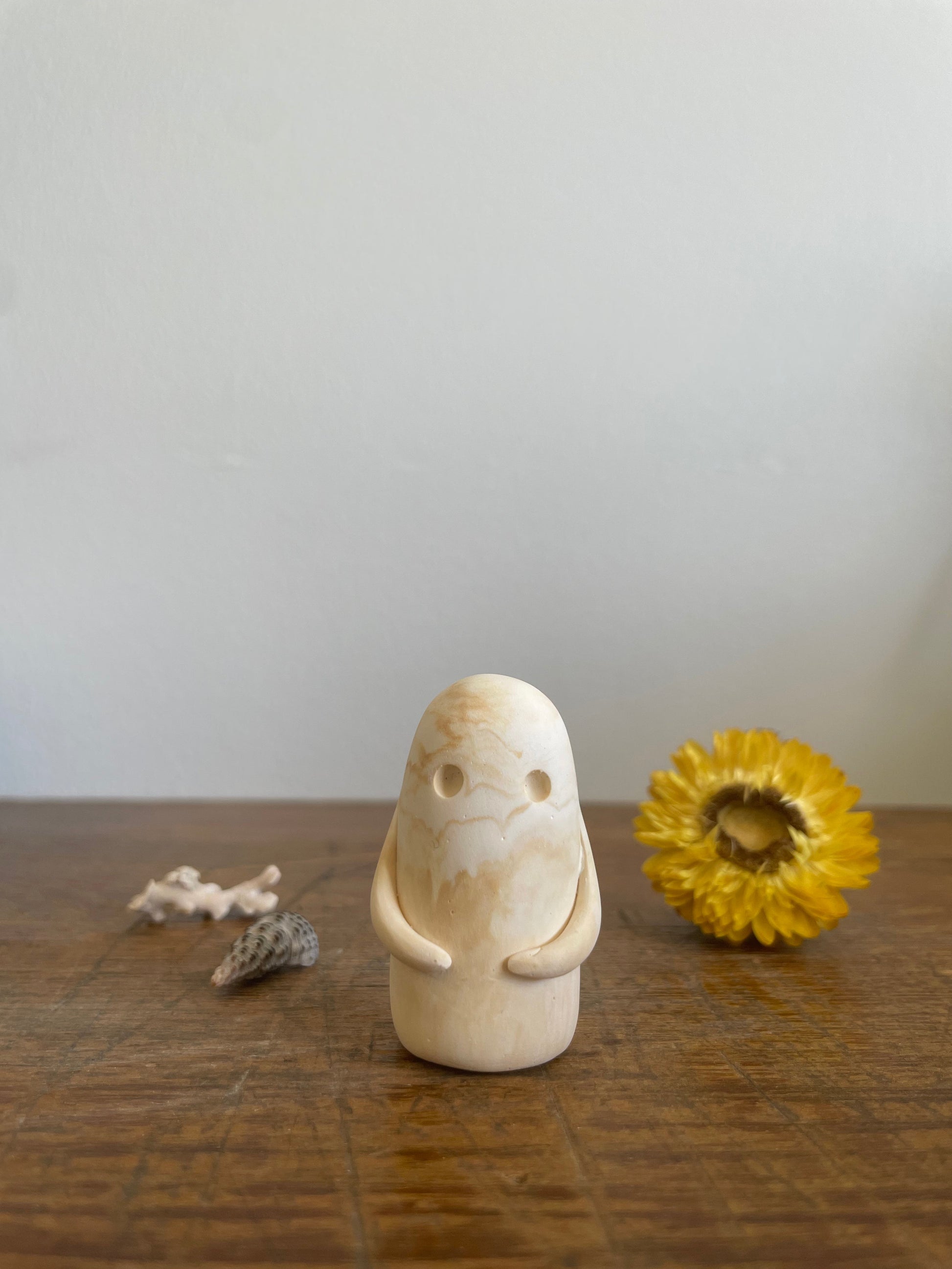 This Domie pictured features a tan and white marbling colour on its body and long arms that wrap around its belly. It is approximately 4.9 cm tall.