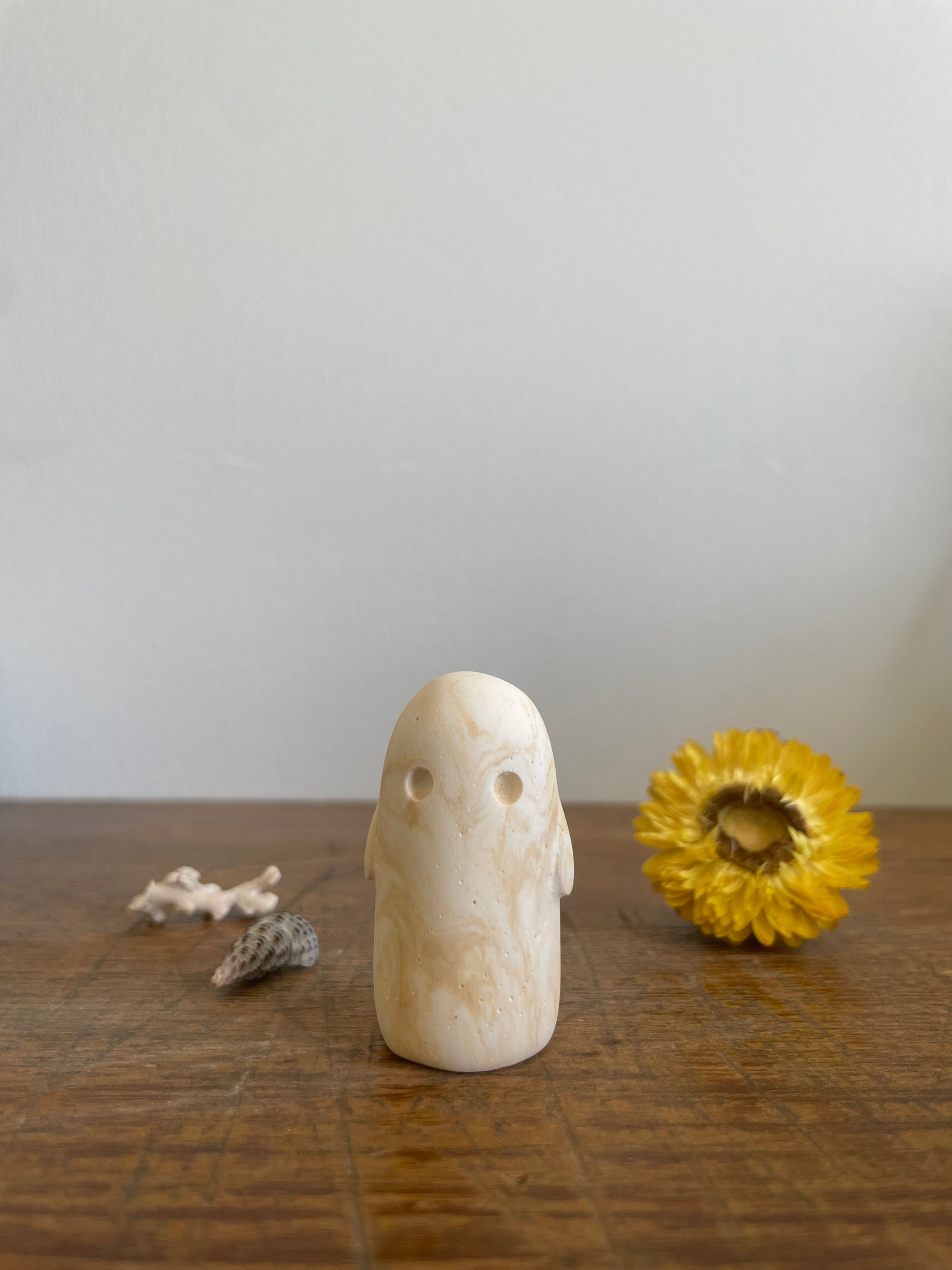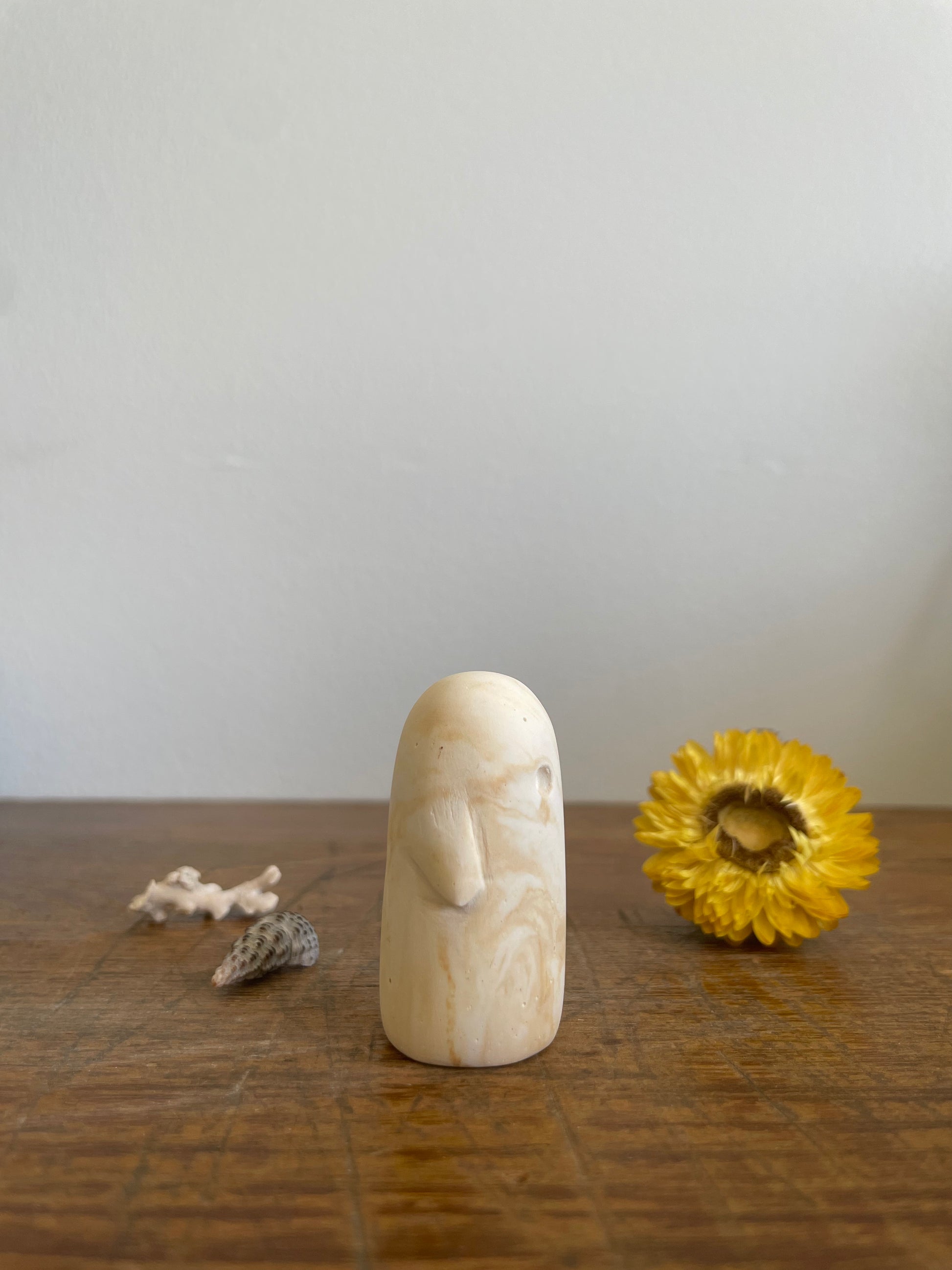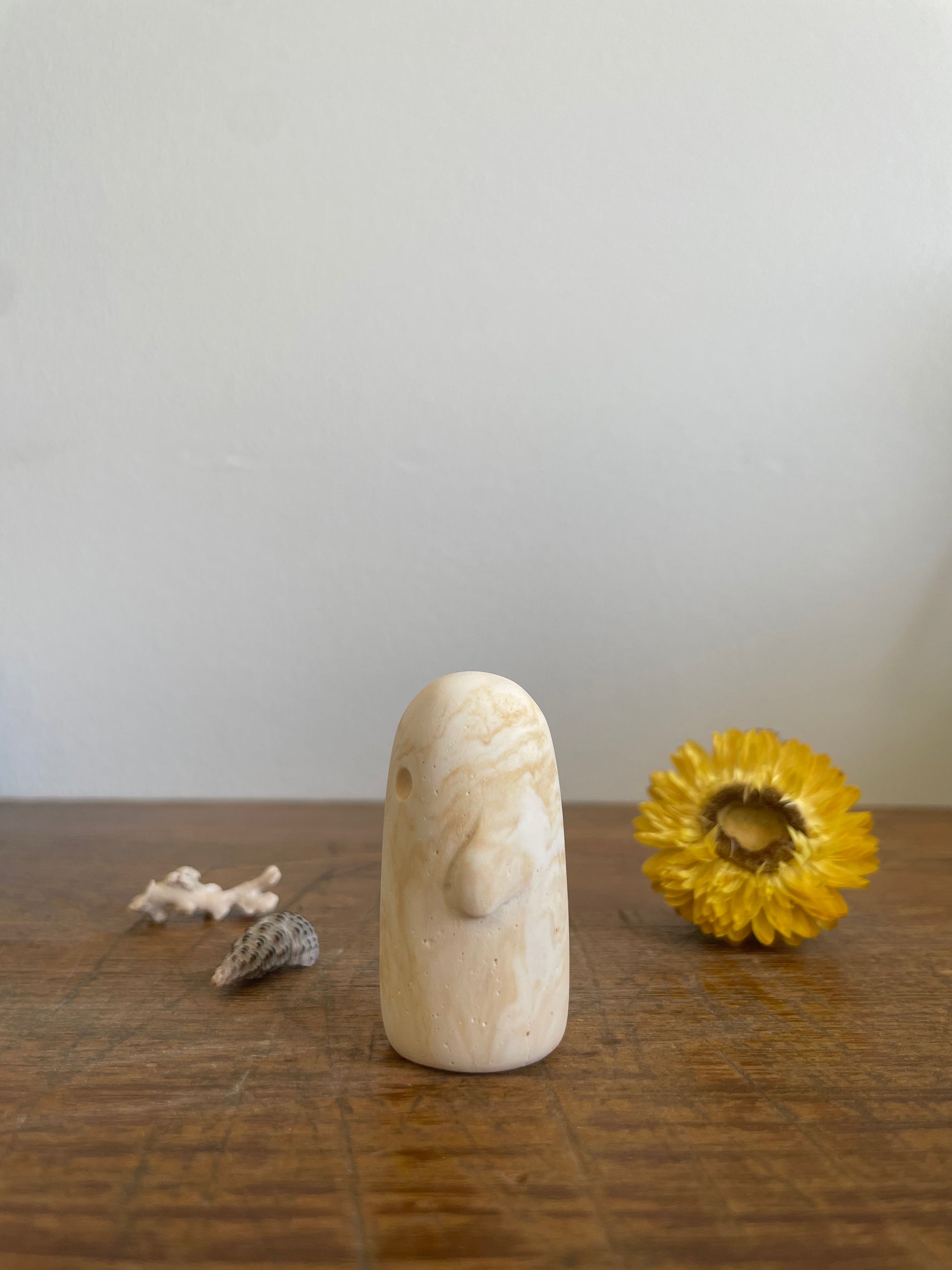 This Domie pictured features a tan and white marbling colour on its body and short, stumpy arms that fall to its side. It is approximately 4.9 cm tall.