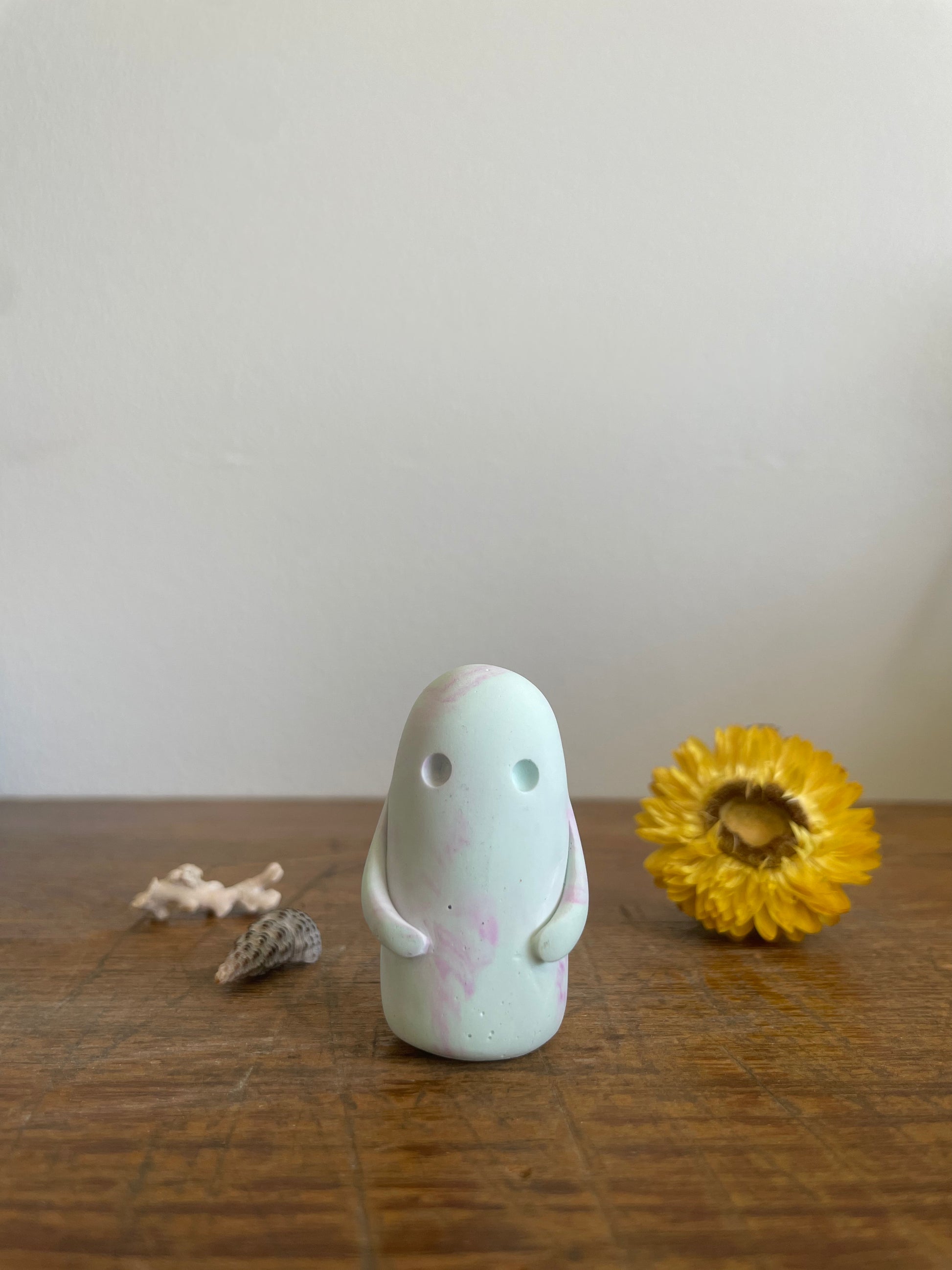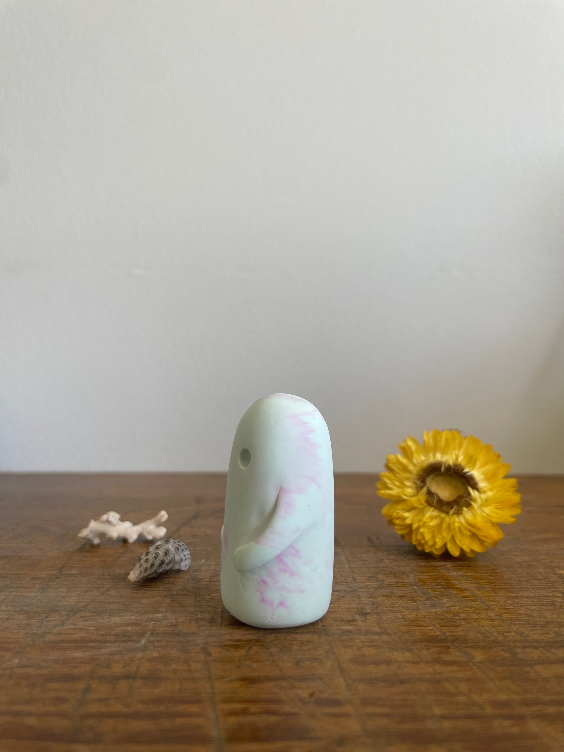 This Domie pictured features a pastel green and purple marbling colour and long arms that wrap around its belly. It is approximately 4.7 cm tall.