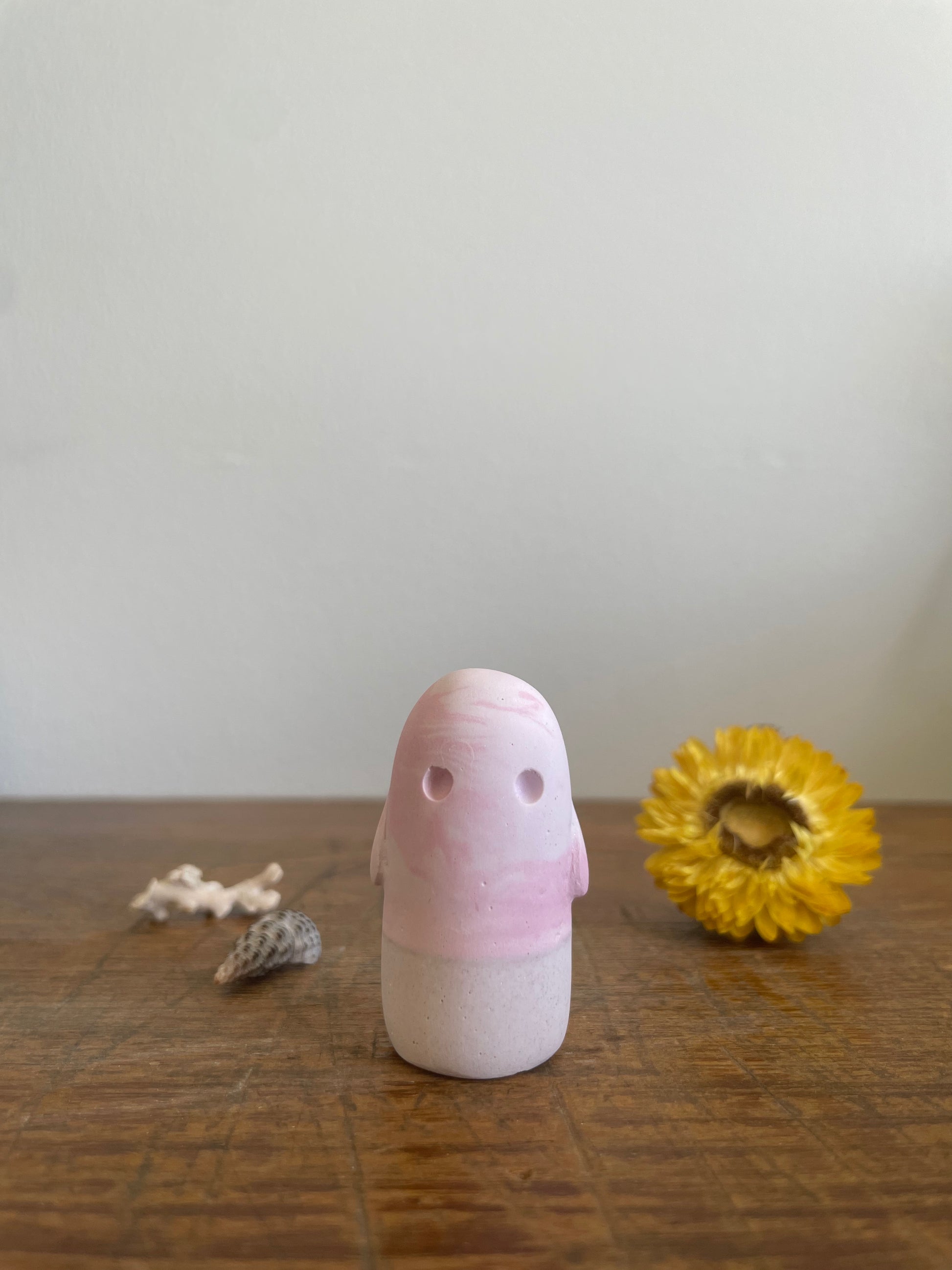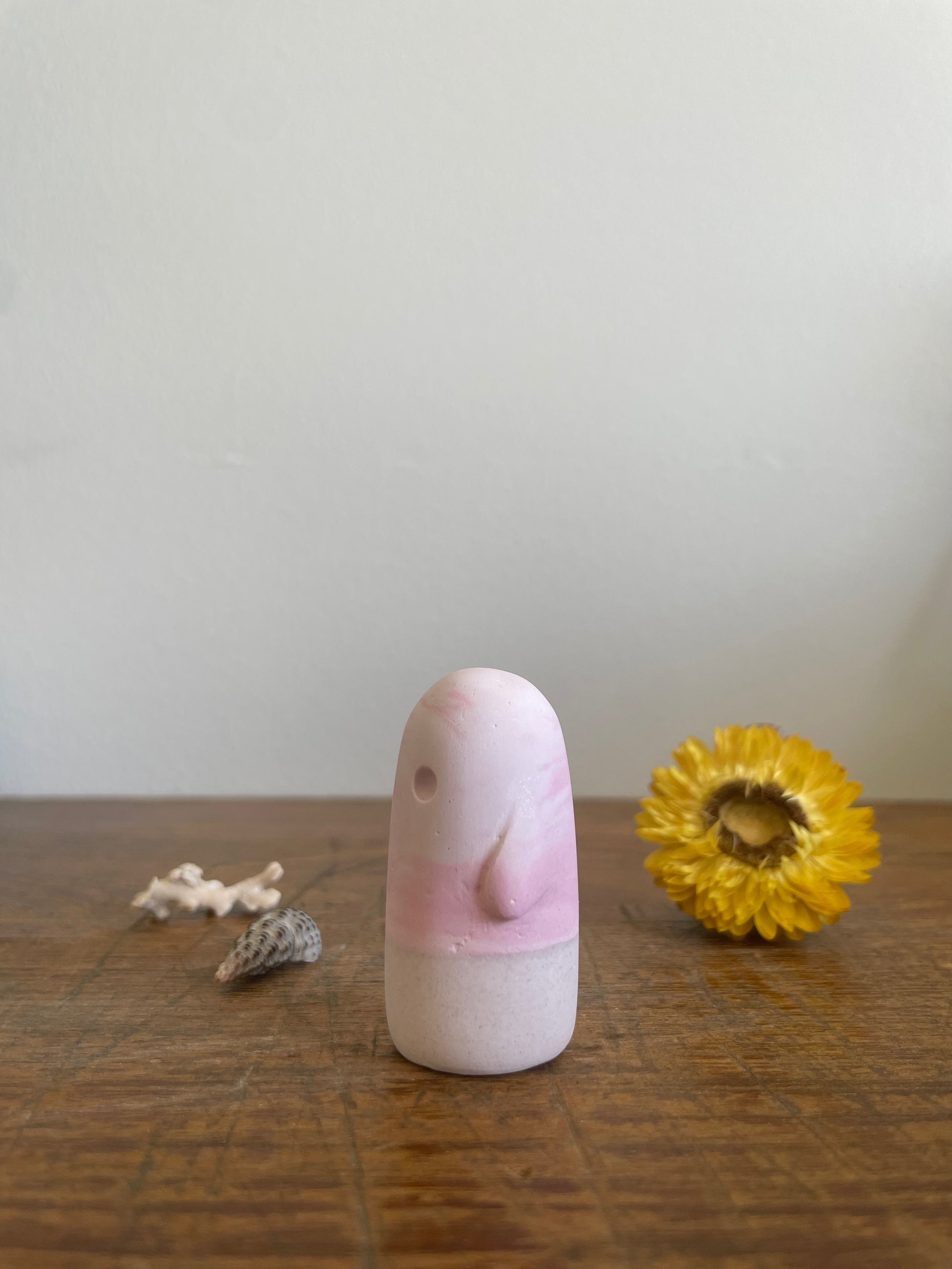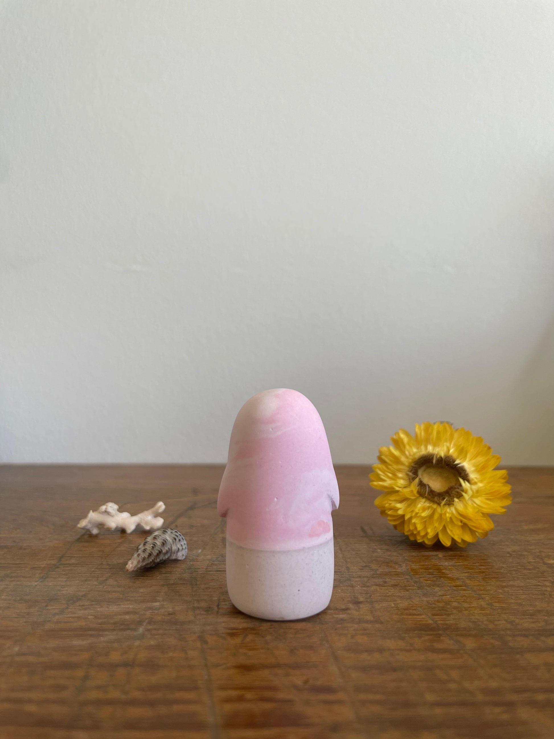 This Domie pictured features a pink and white marbling colour on the body and light grey base with short, stumpy arms. It is approximately 4.8 cm tall.