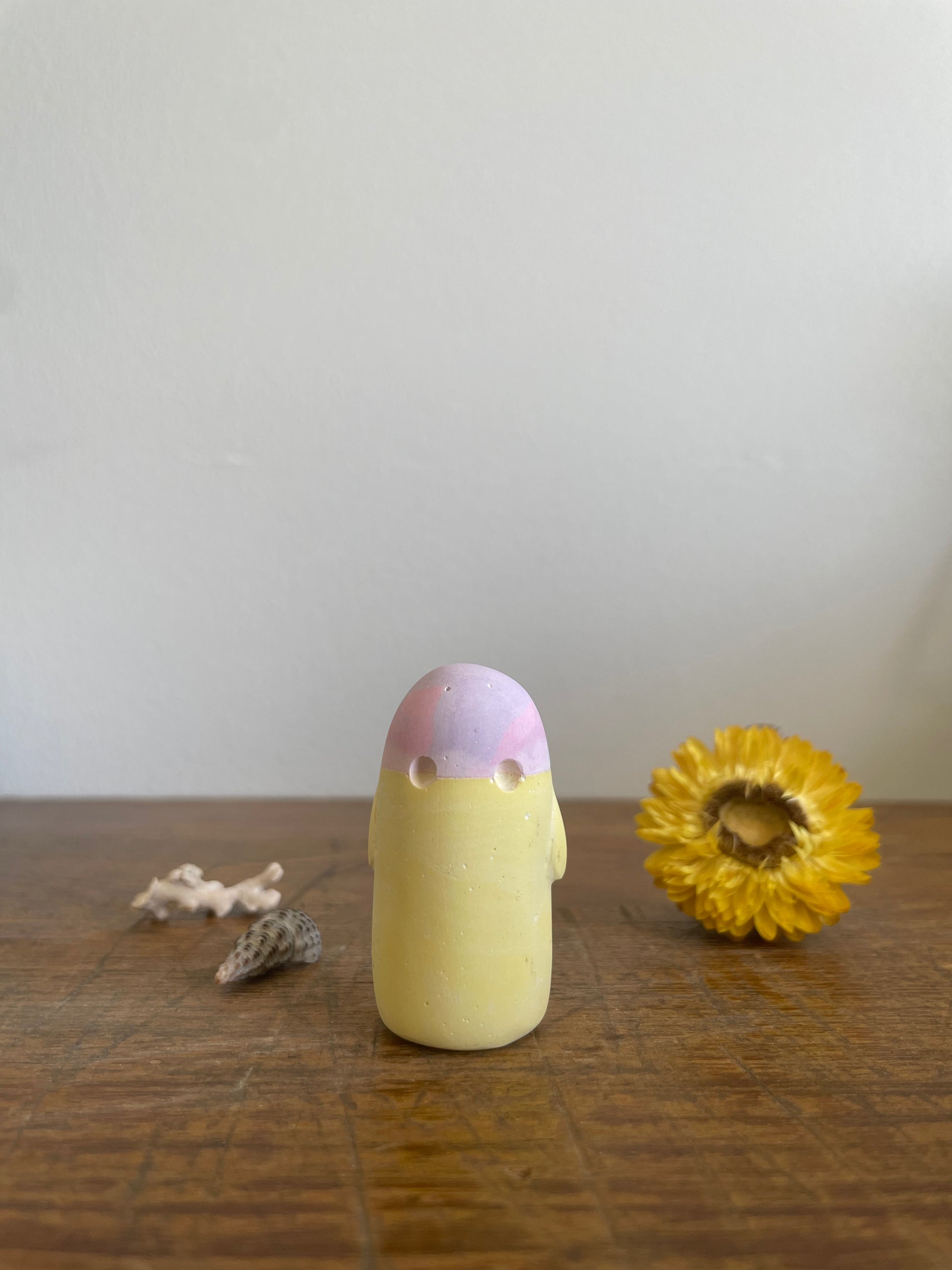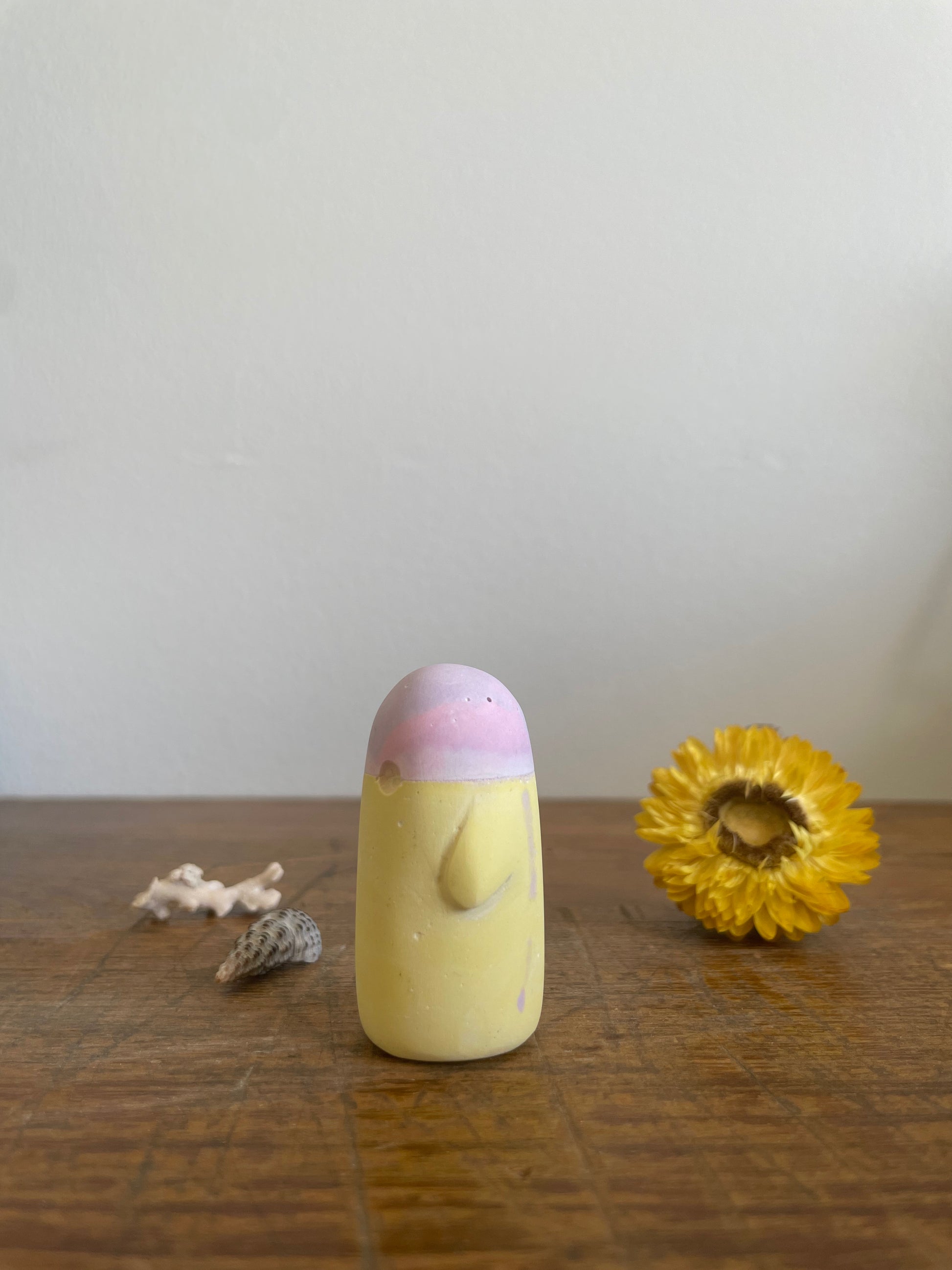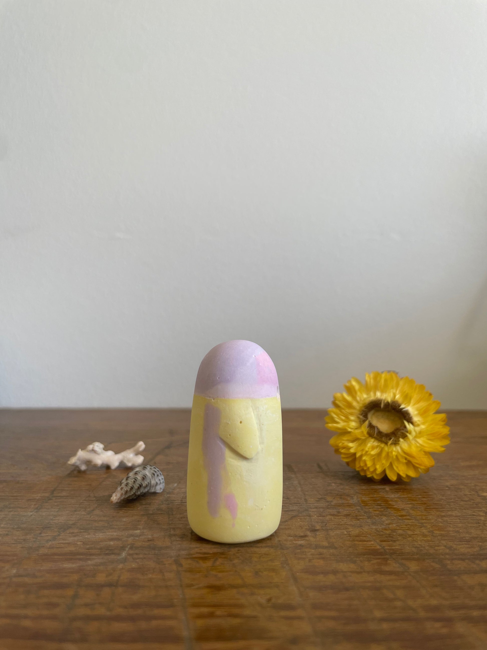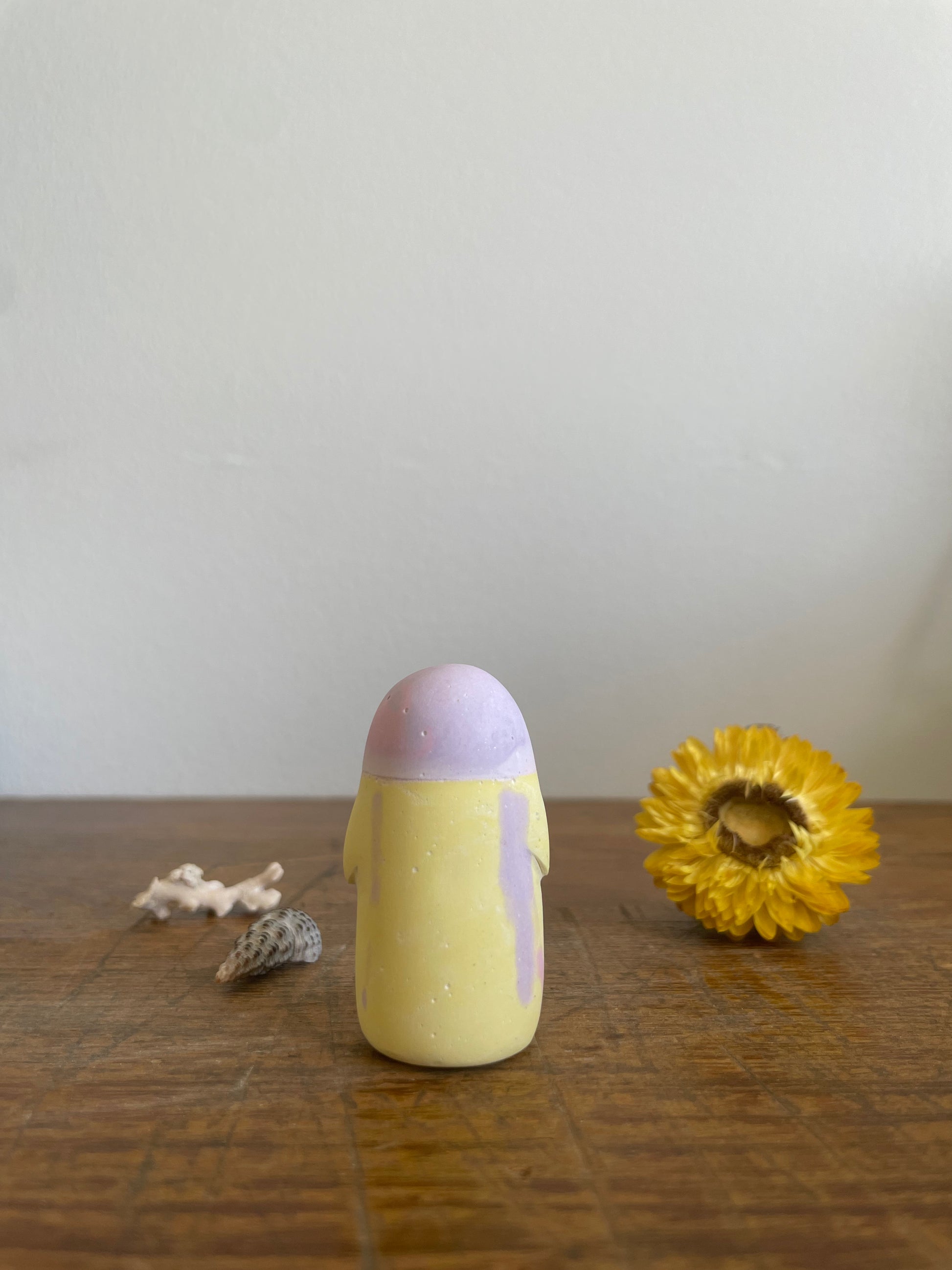 This Domie pictured features a pink and purple marbling colour on the head with drip down its yellow body and two short, stumpy arms. It is approximately 4.8 cm tall.