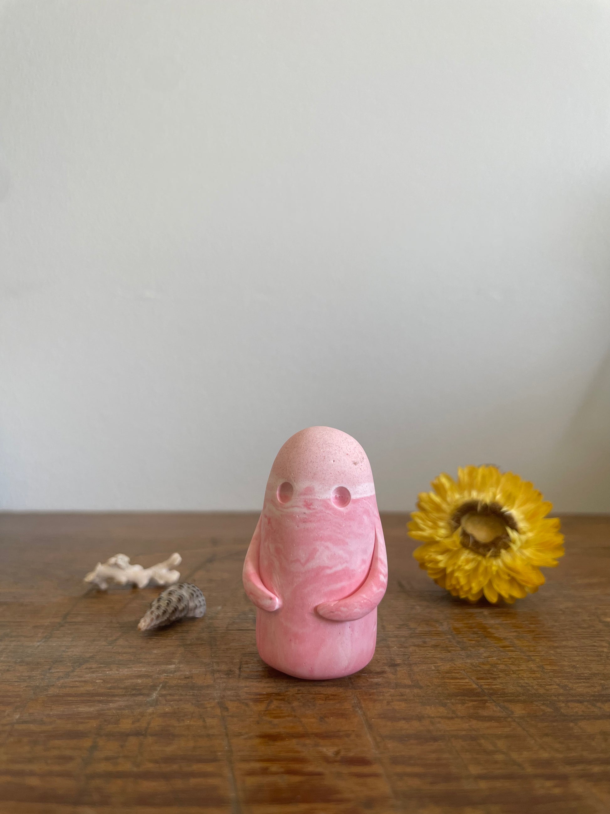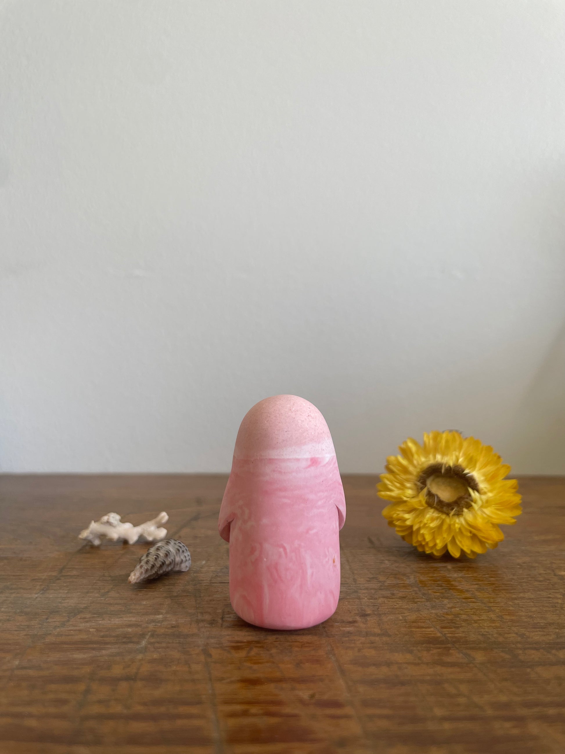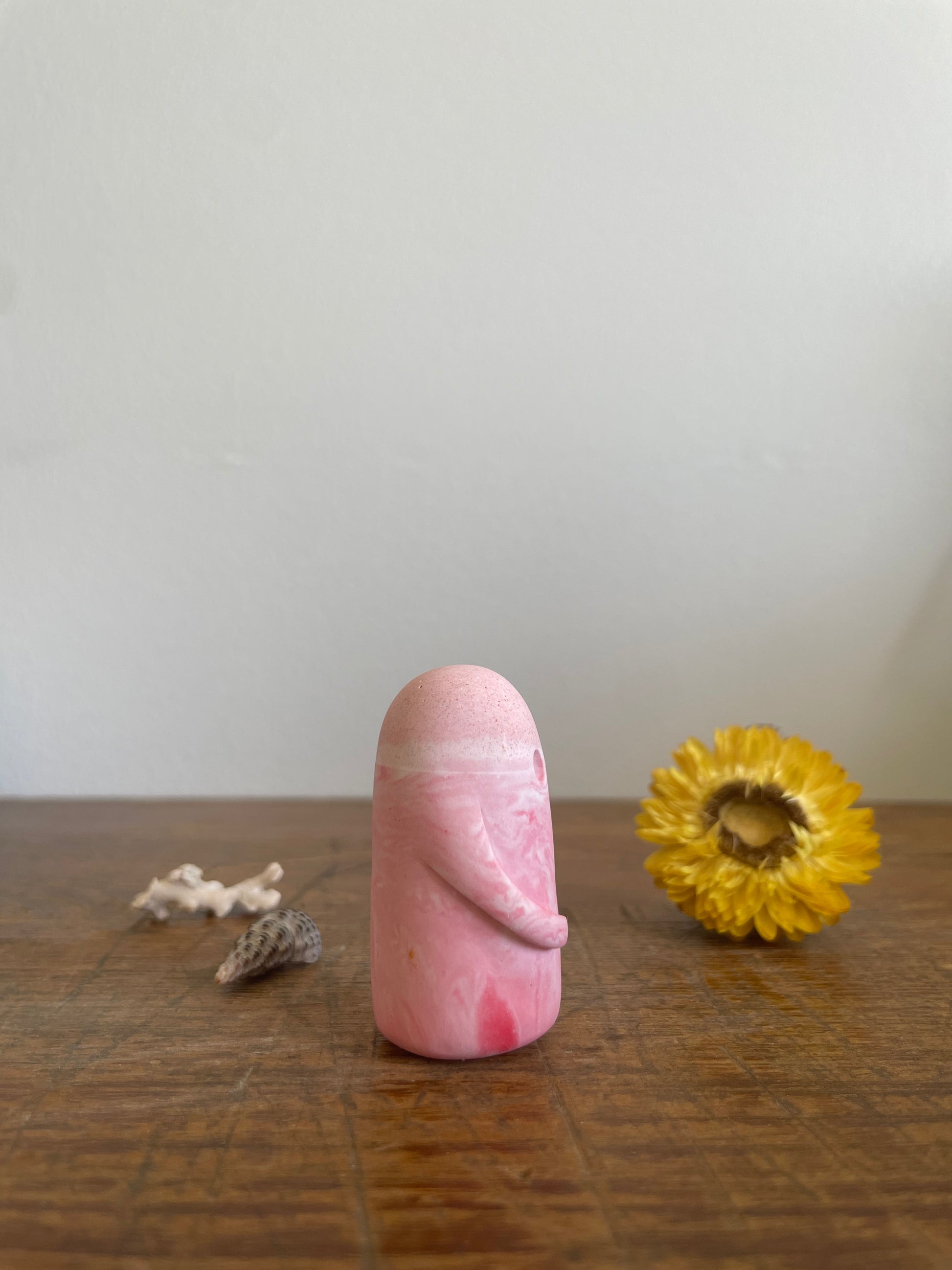 This Domie pictured features a solid pink colour on the head with marbled light and dark pink/red over the body and two long arms wrapping around its body. It is approximately 4.8 cm tall.