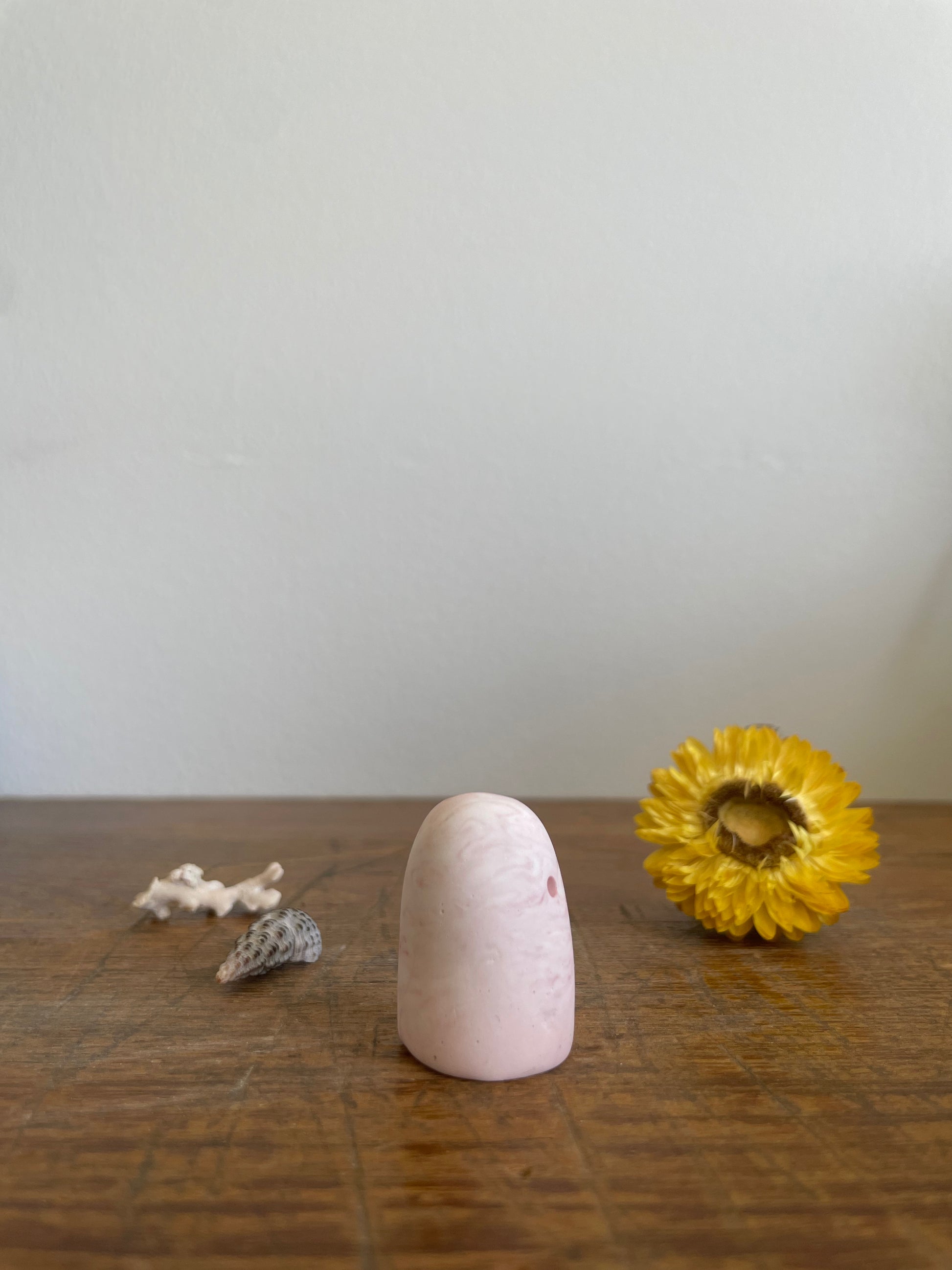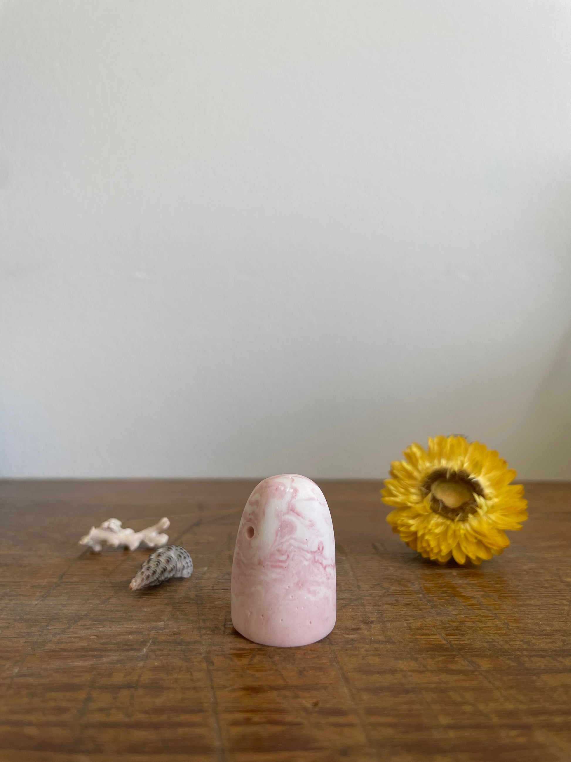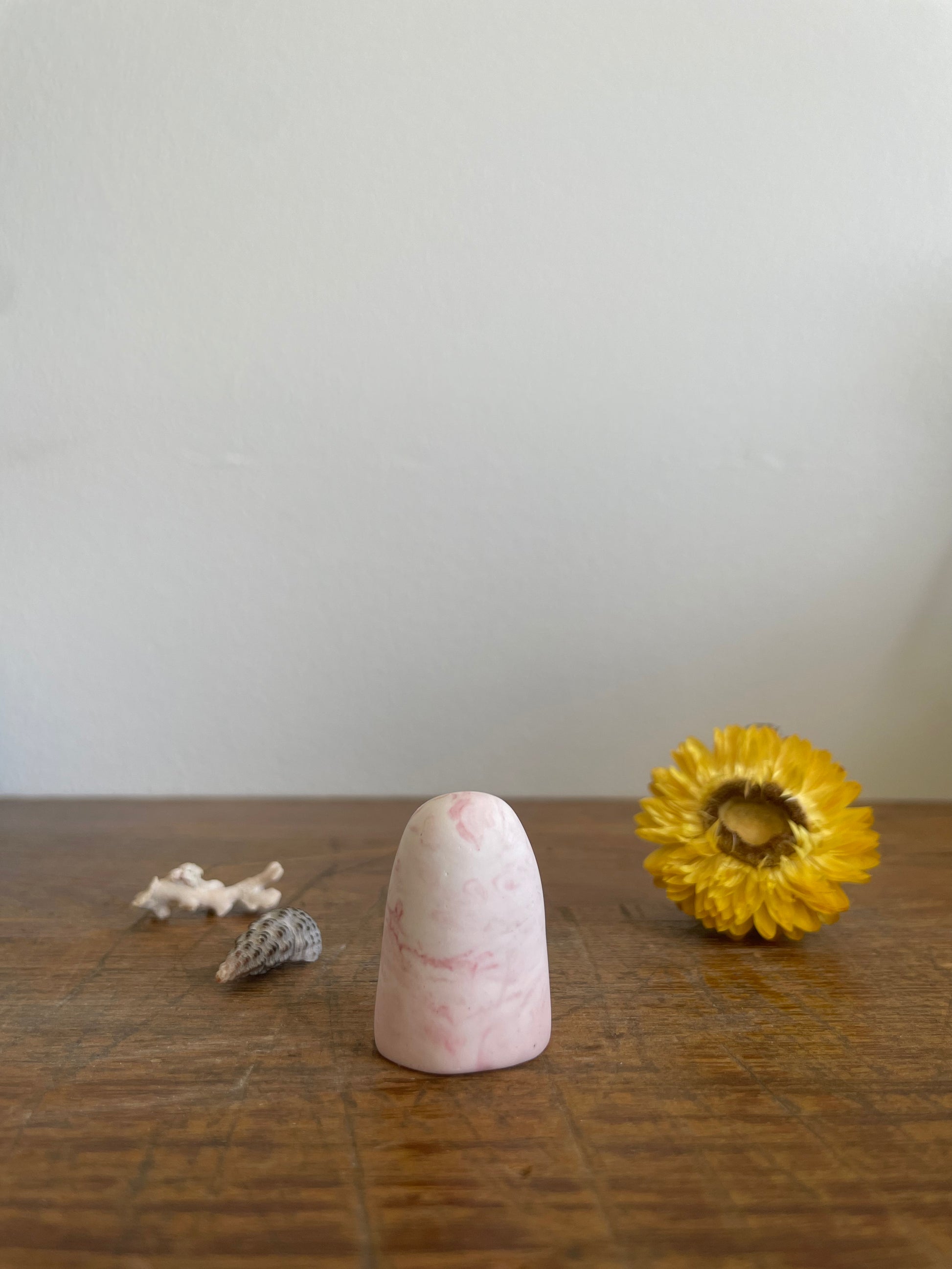 This Domie pictured features a marbled mulberry and white armless body. It is just over 3 cm tall.