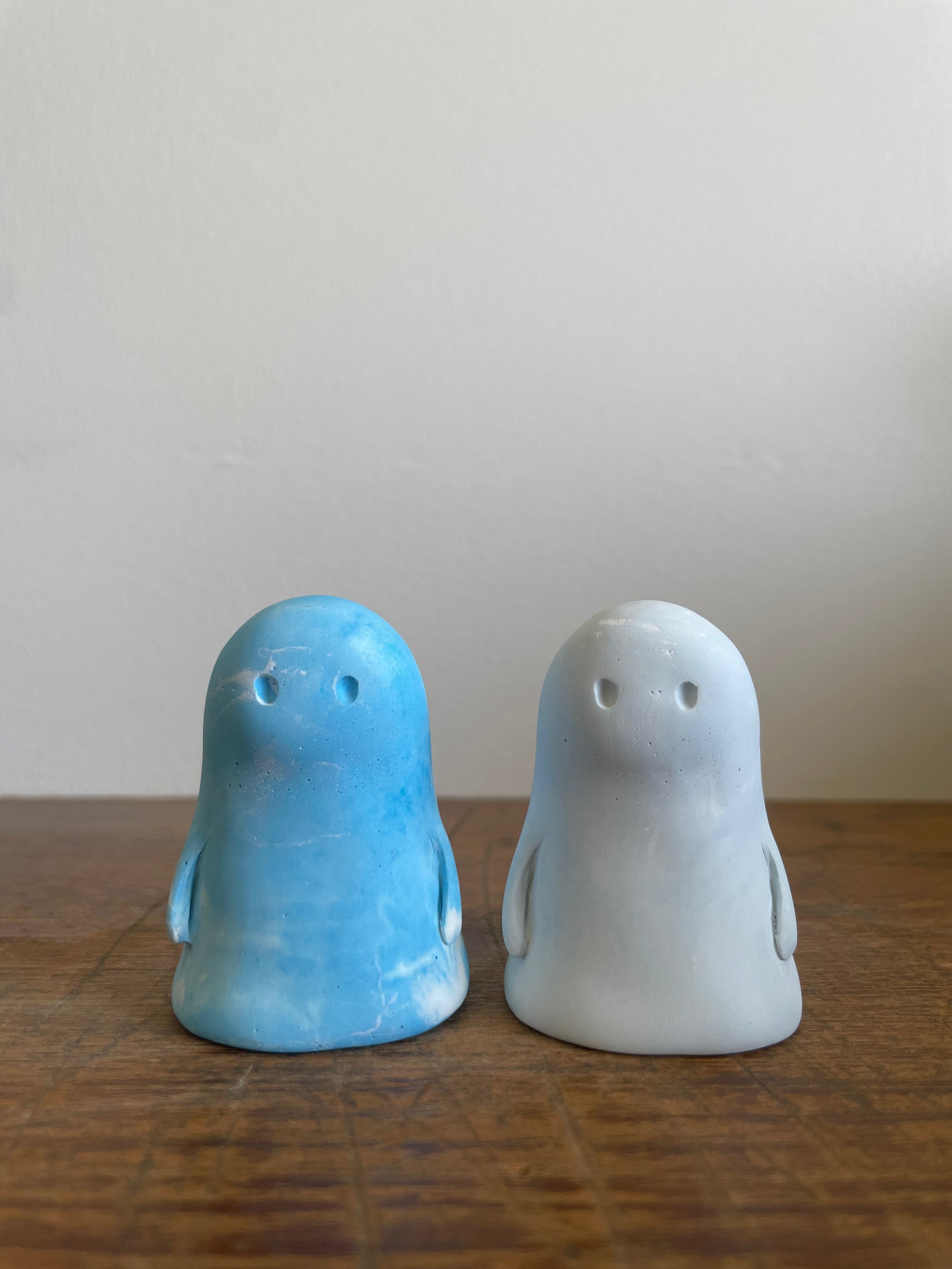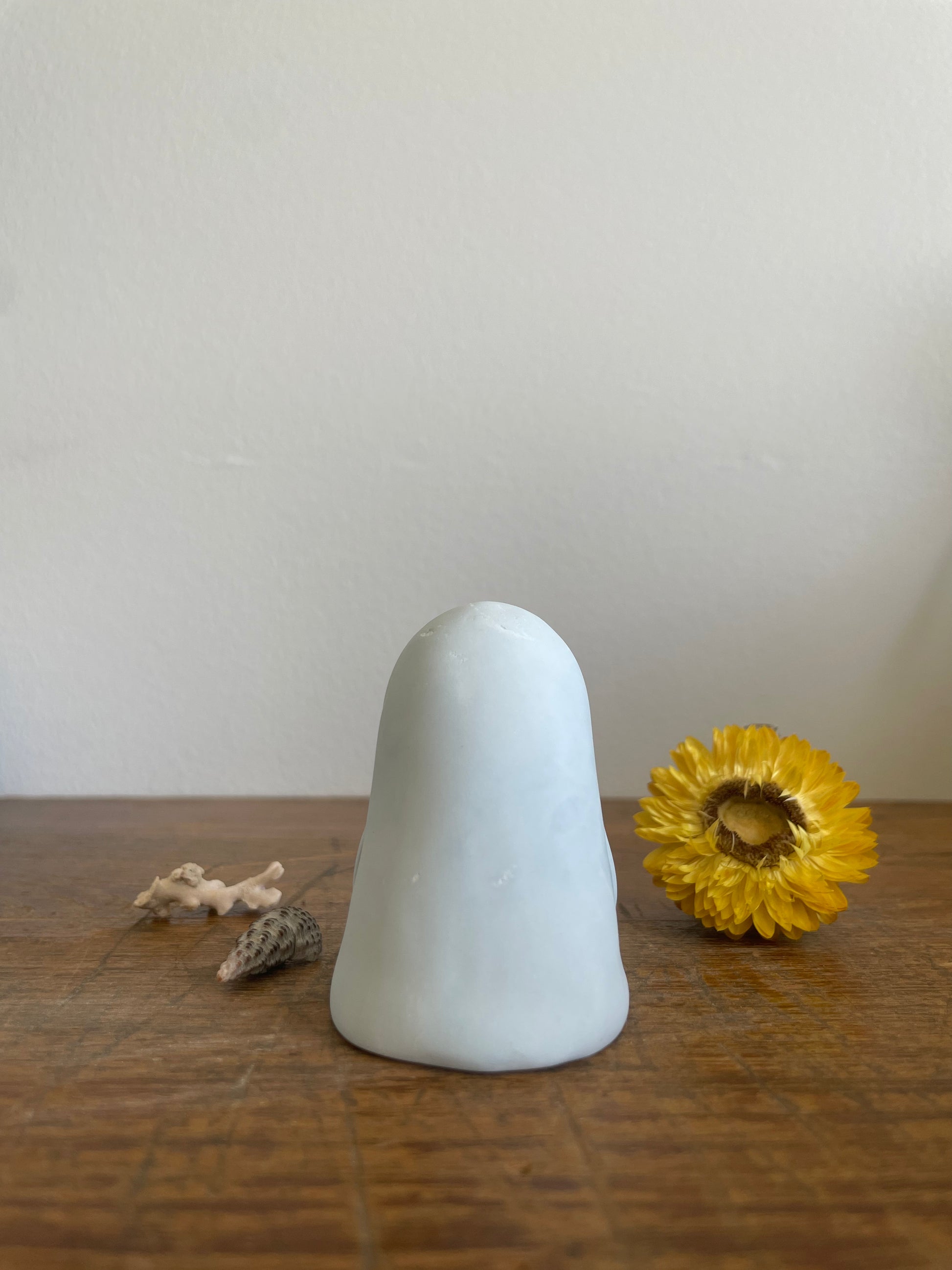 This Domie pictured features a marbled light blue and white body with medium arms resting at its side. It is just under 6cm tall.
