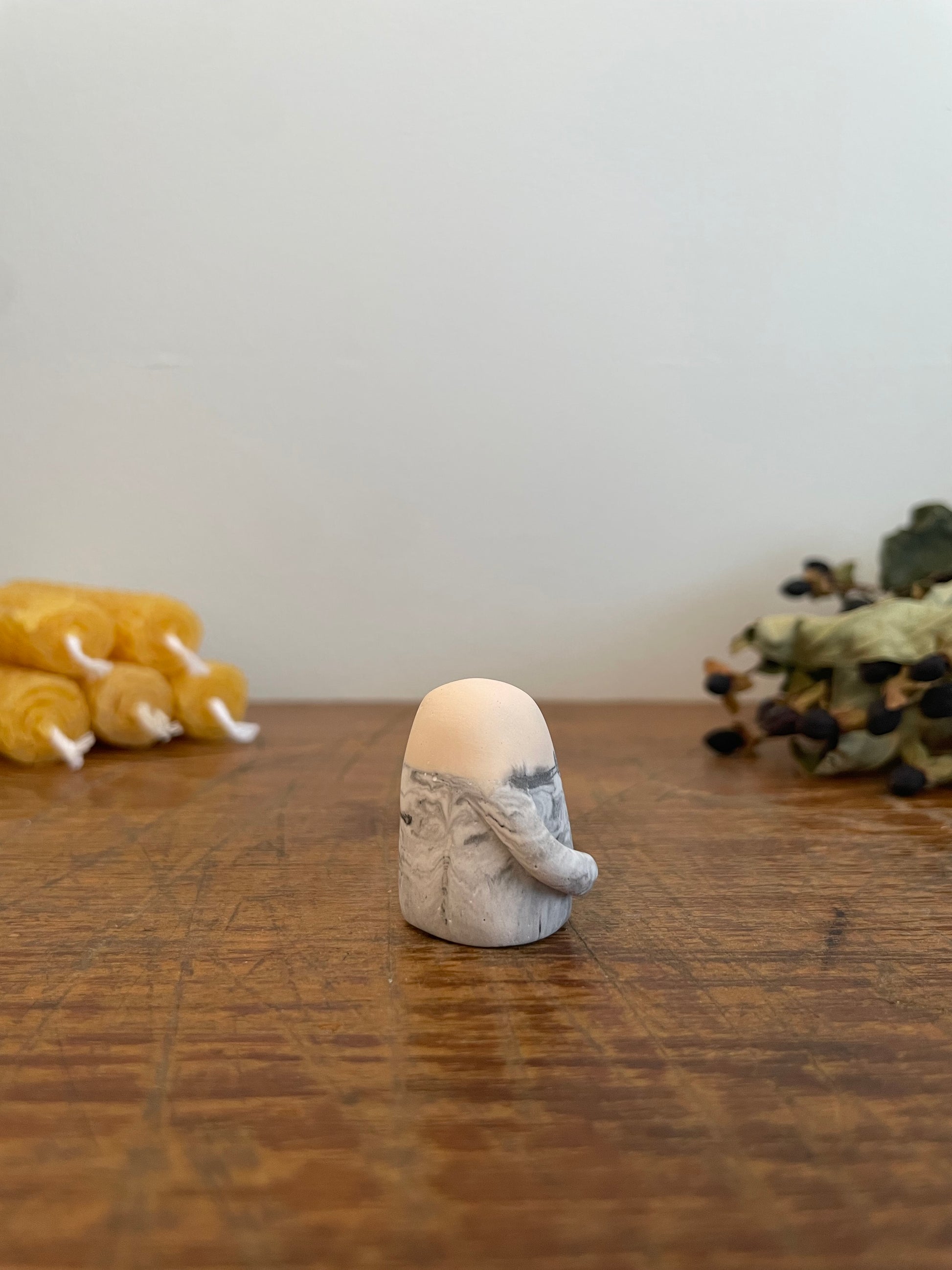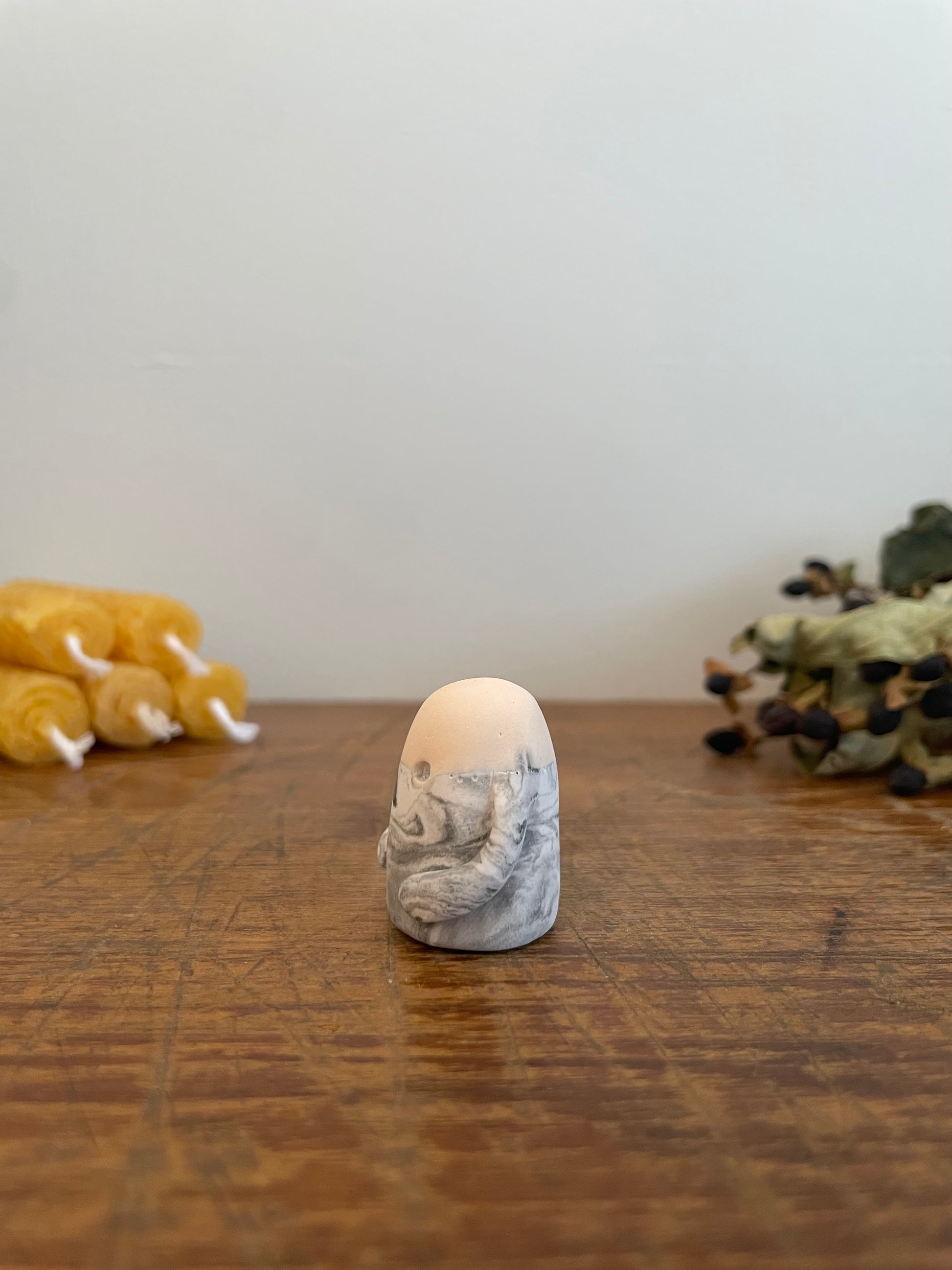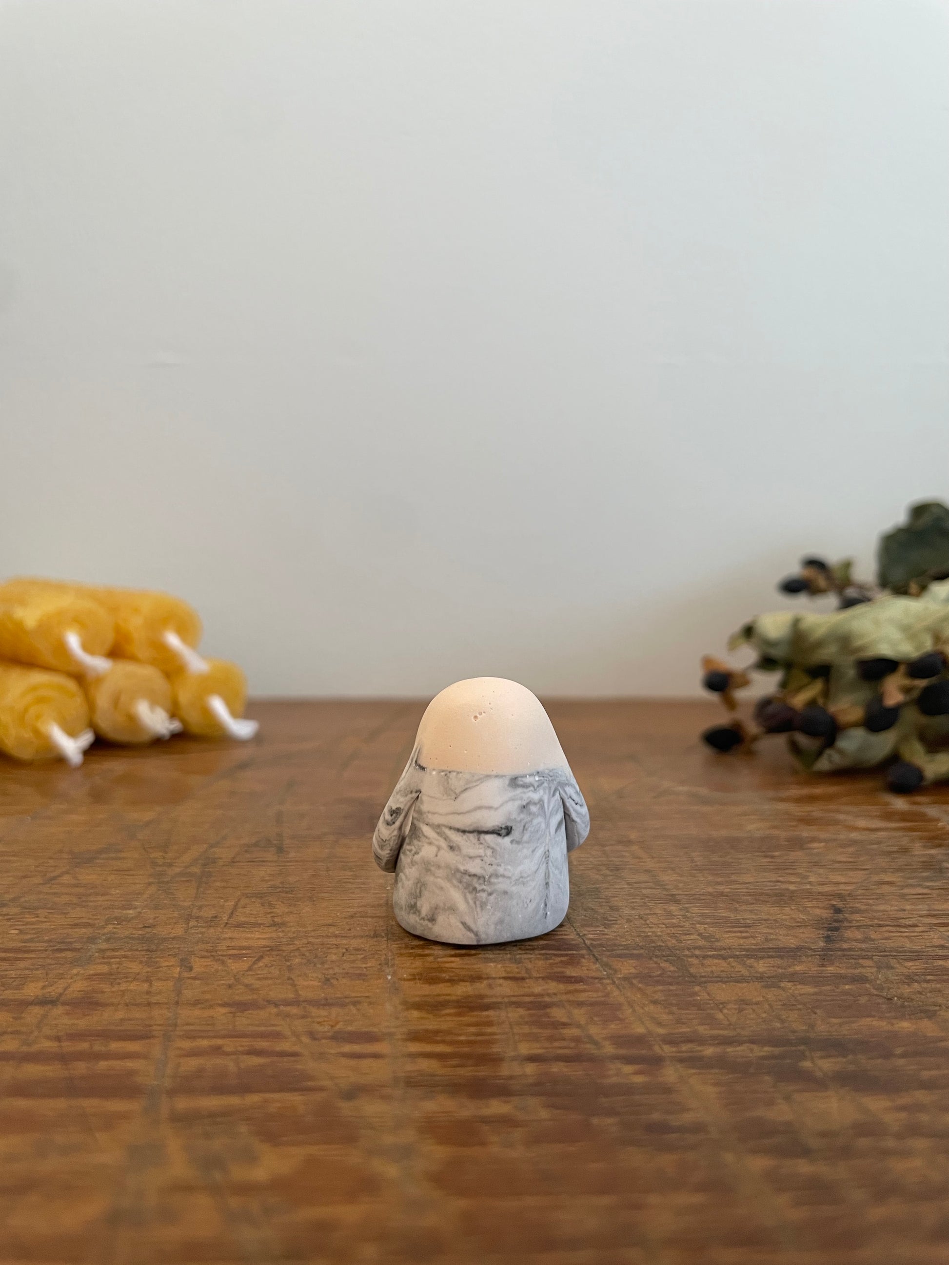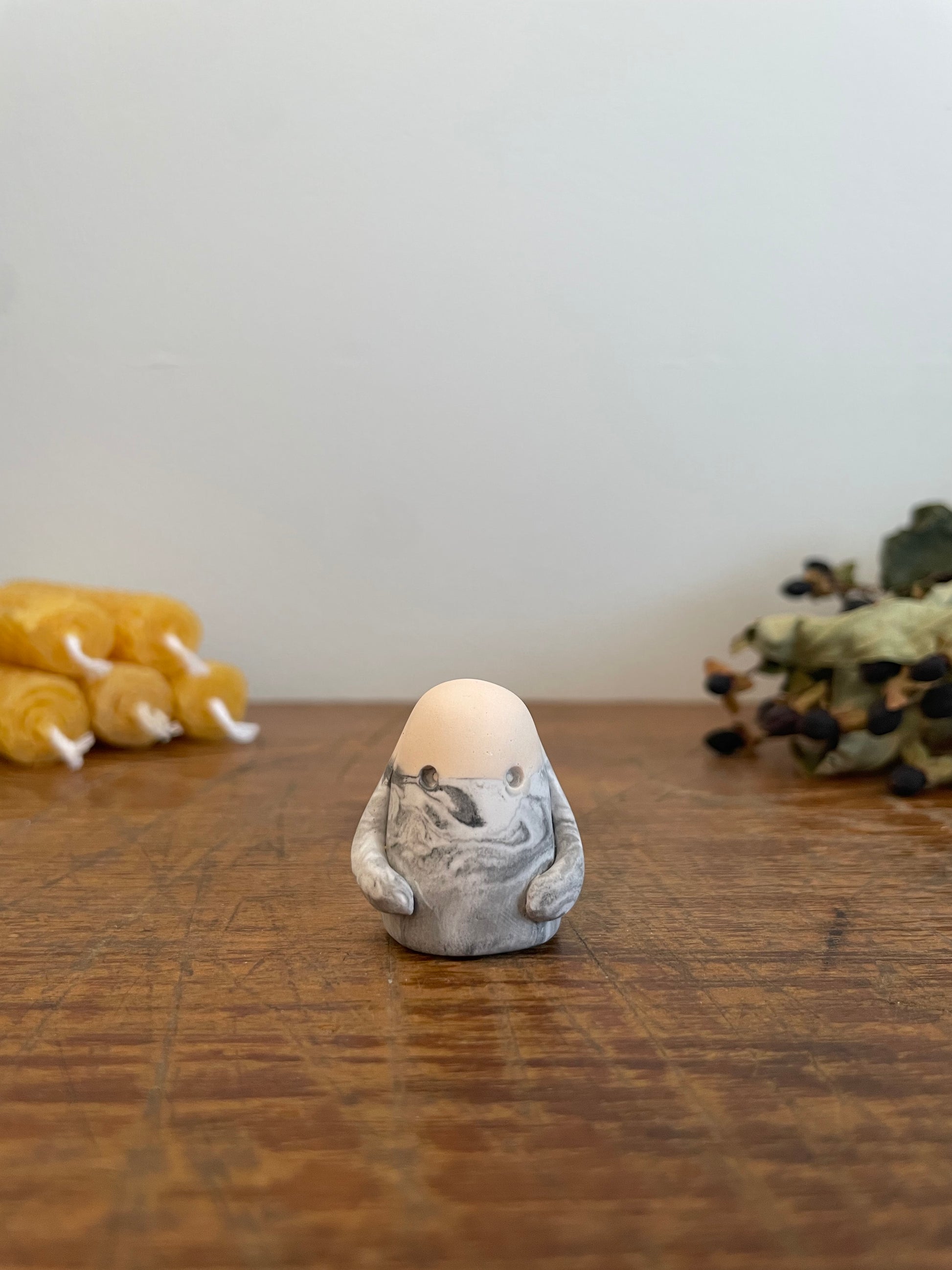 This Domie pictured features a cream head and black and white marbling on its body with long arms that hug its side. It is approximately 3.3 cm tall.