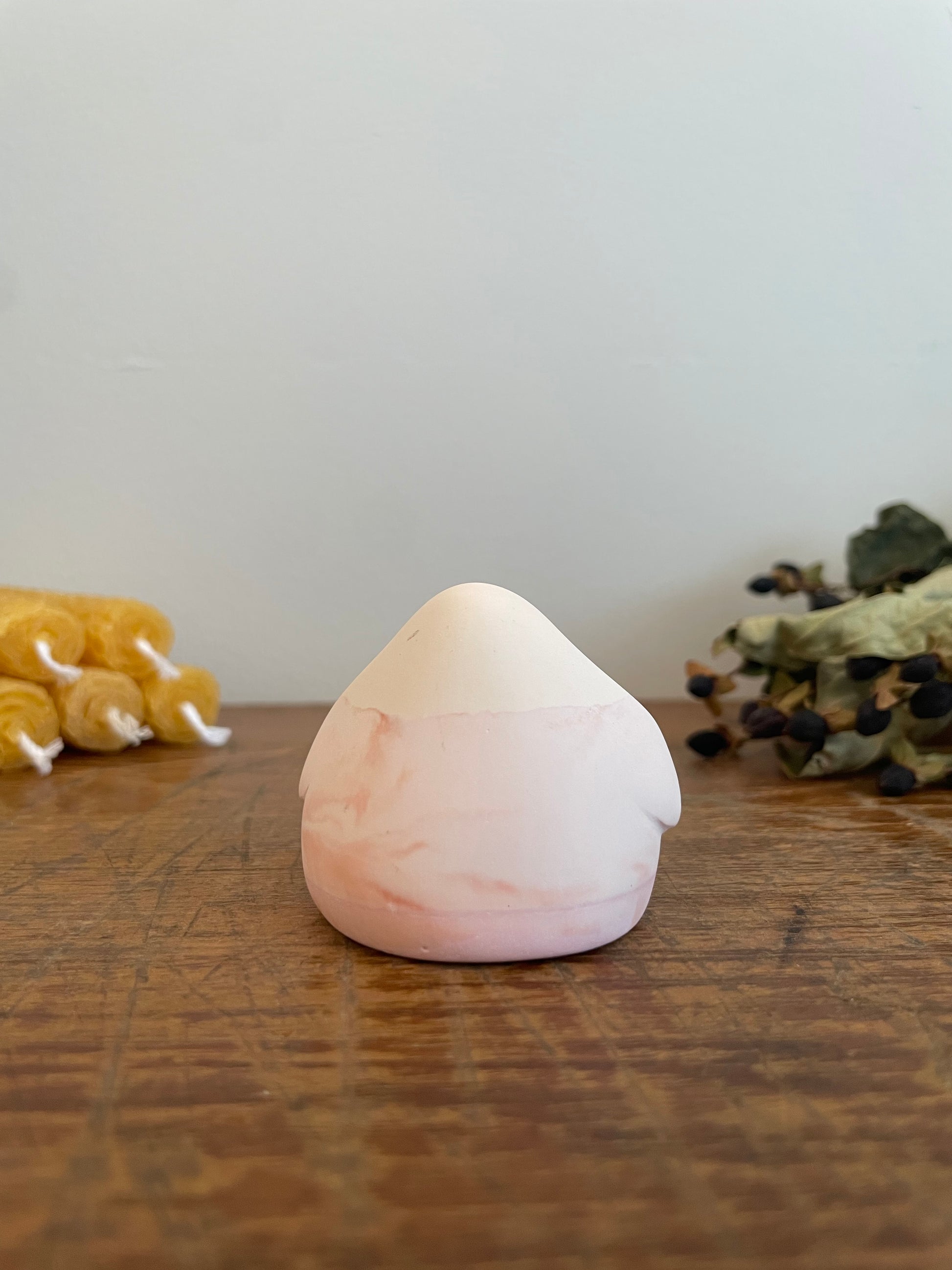 This Domie pictured features a layered solid light peach, marbled apricot and light pink body with long, wide arms resting at its side. It is approximately 4.5cm tall.