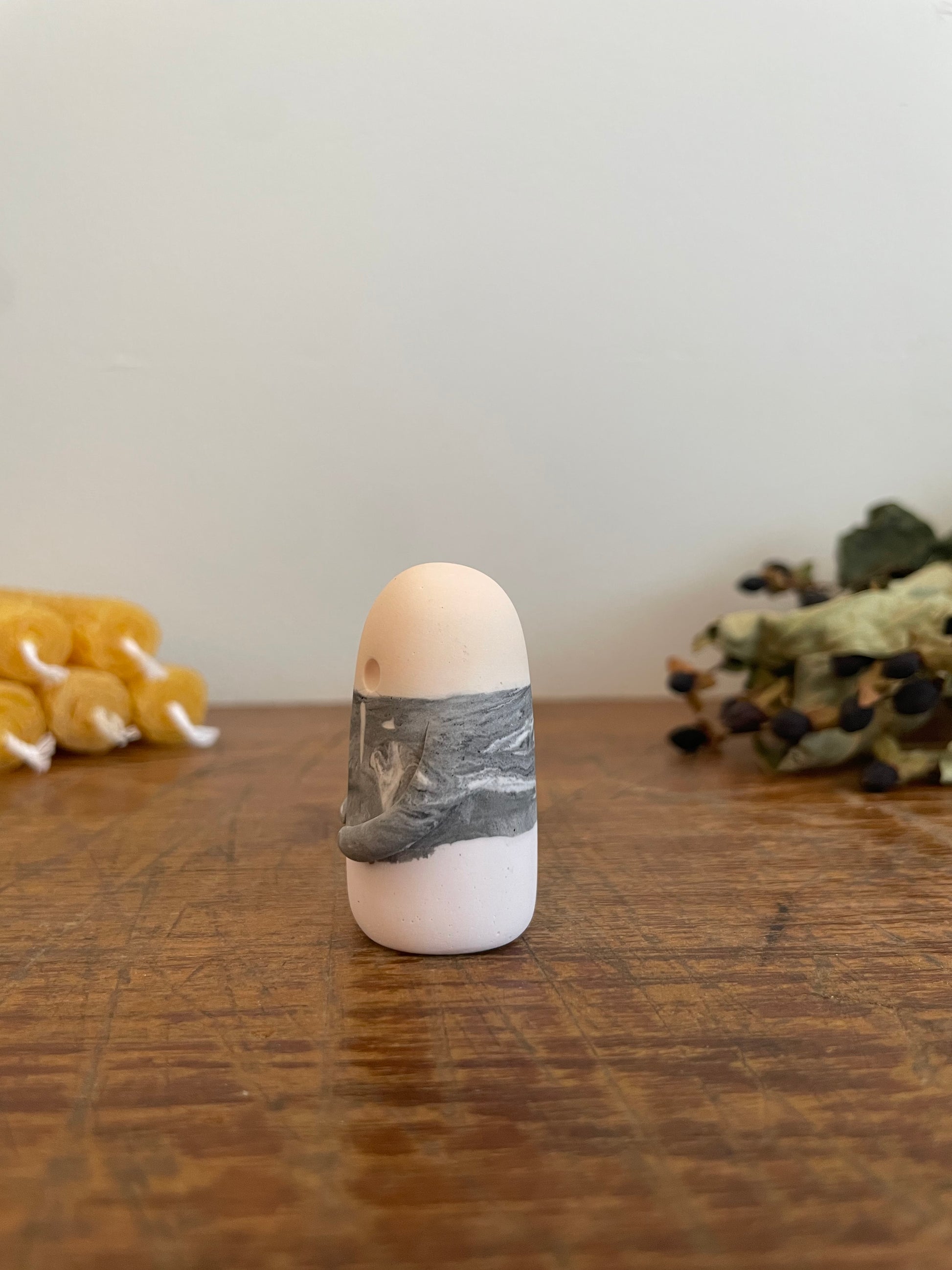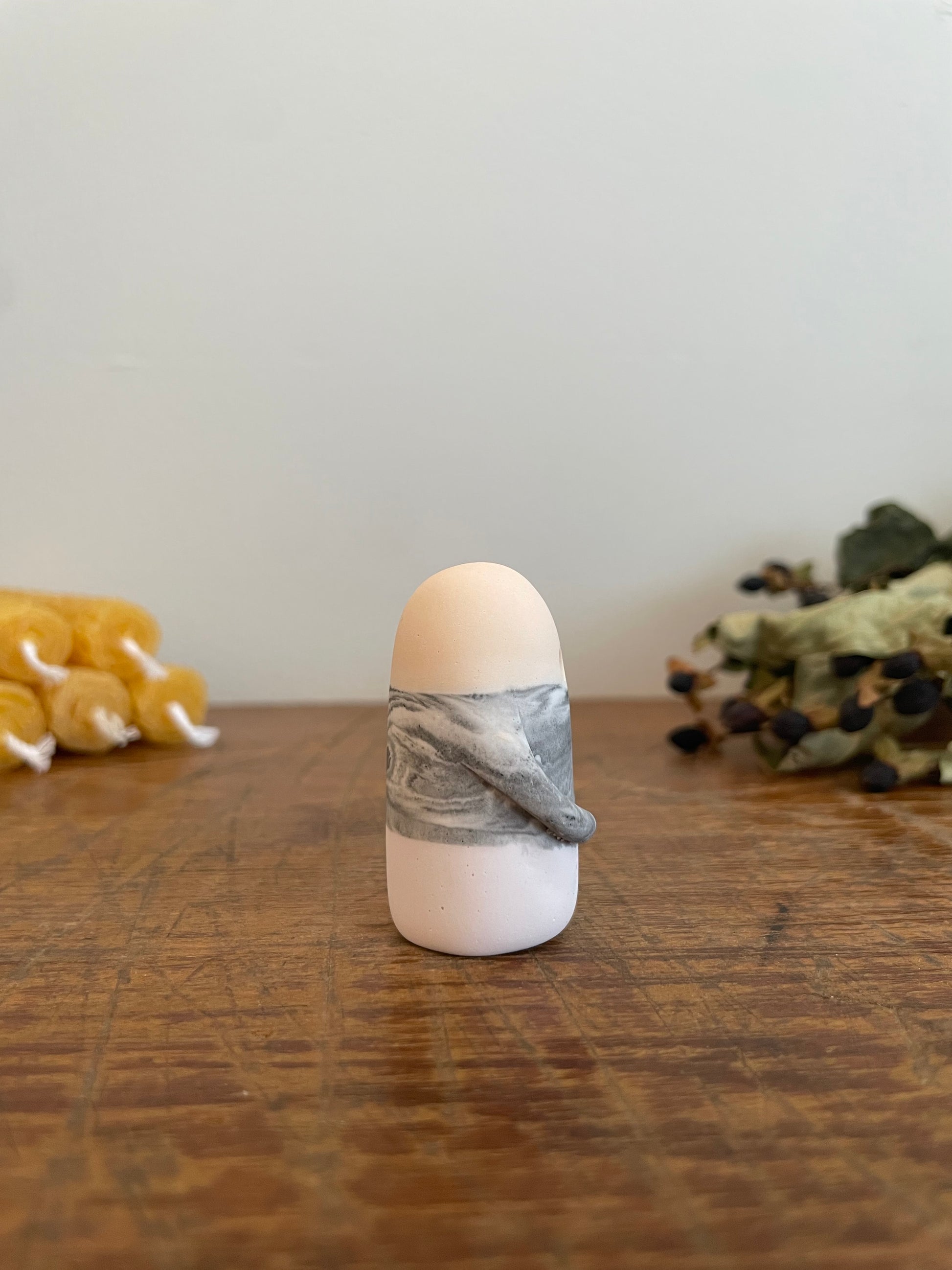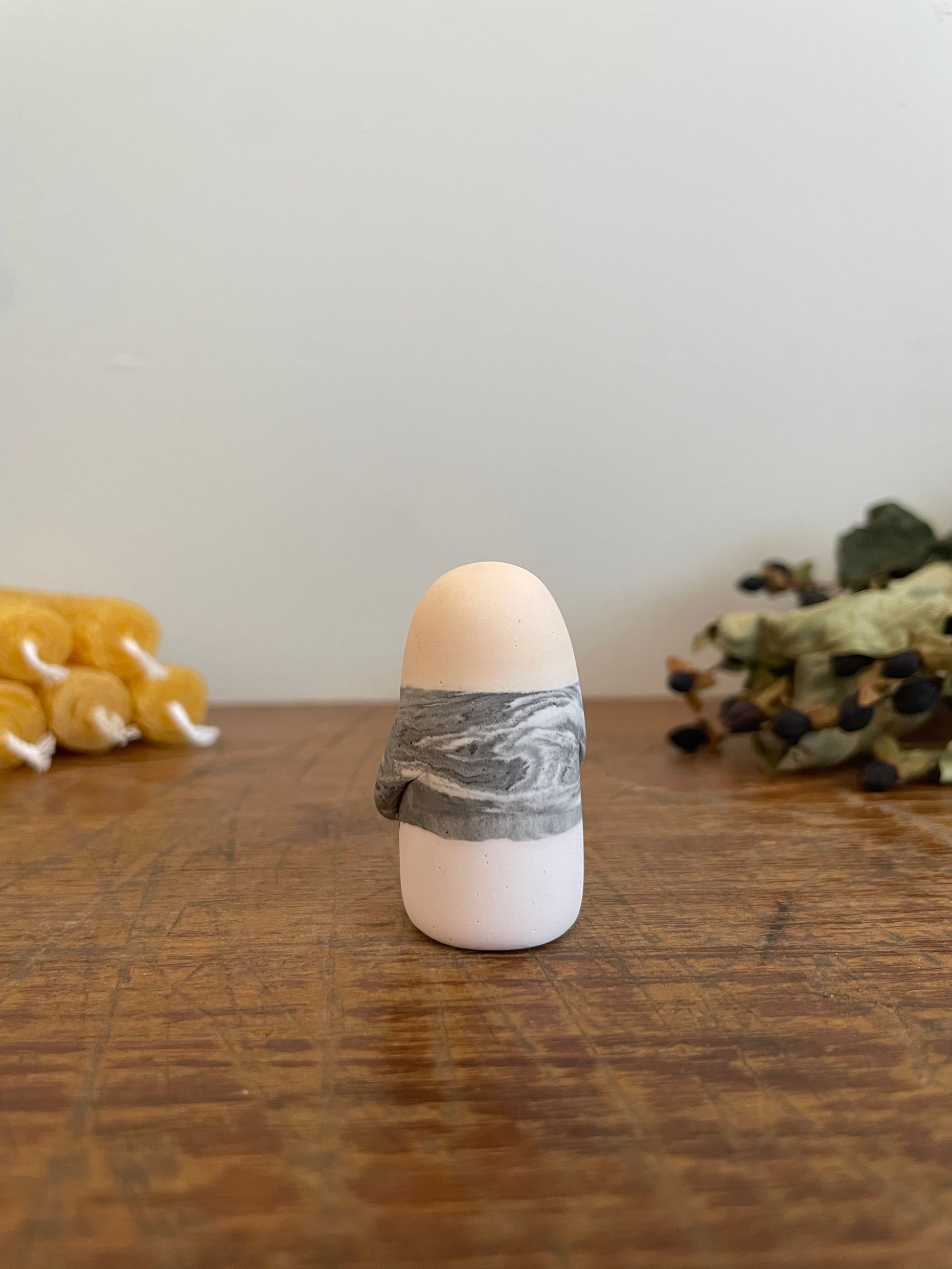 This Domie pictured features a layered solid light peach, marbled grey and the lightest lilac imaginable body and long arms wrapped around its belly. It is approximately 4.7 cm tall.