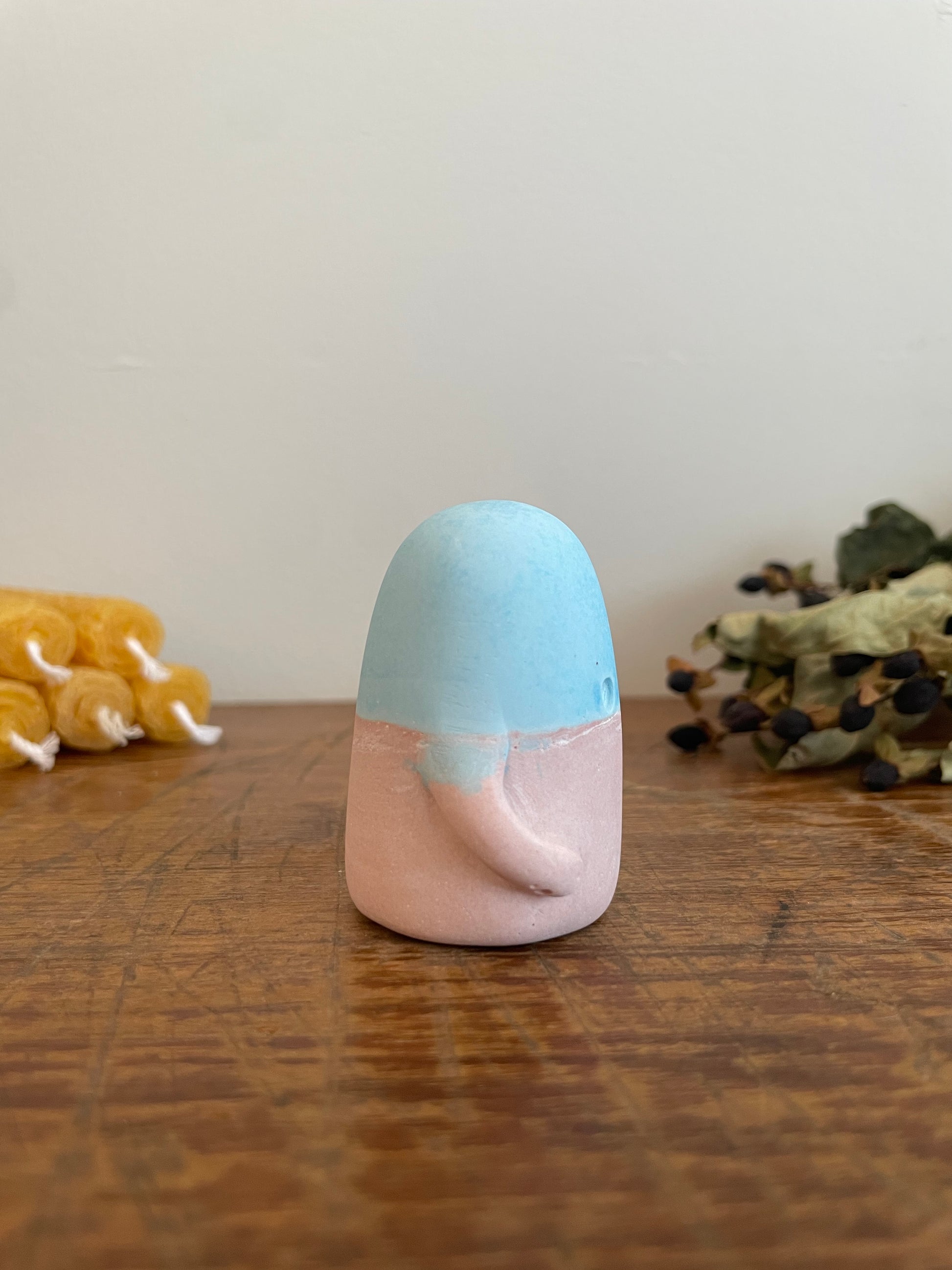 This Domie pictured features a cornflower blue head and a dusty pink body with medium arms resting around its side. It is just under 5.4cm tall.