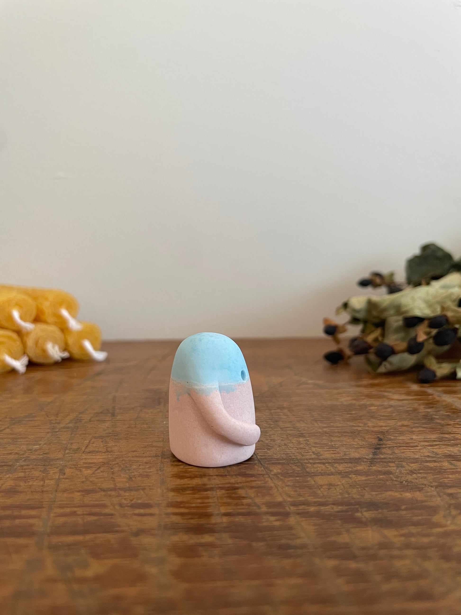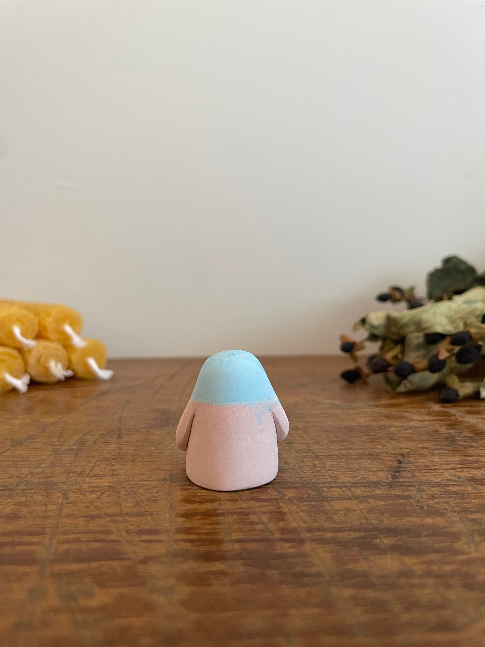 This Domie pictured features a cornflower blue head and a dusty pink body with long arms that hug its side. It is approximately 3.1 cm tall.