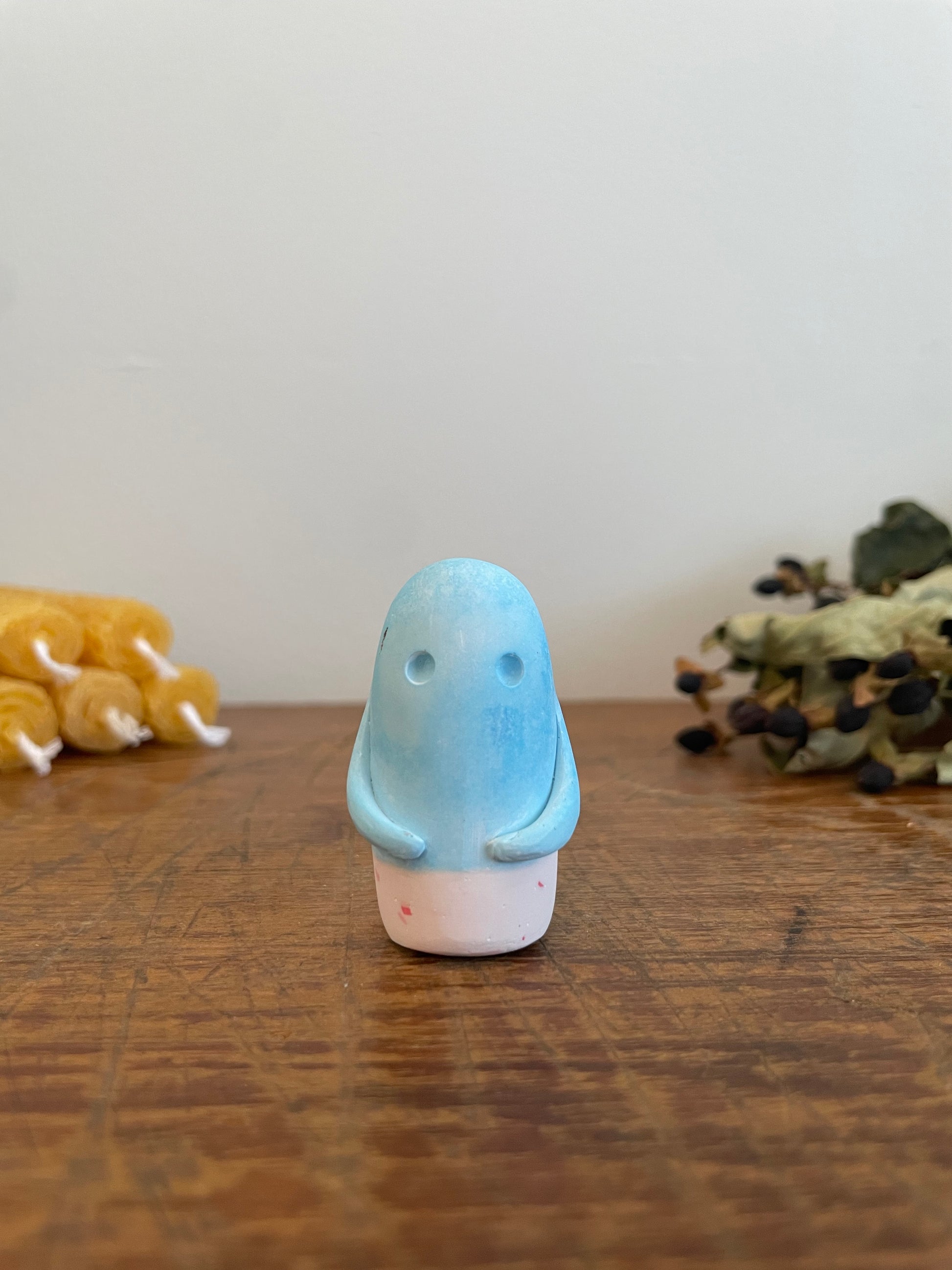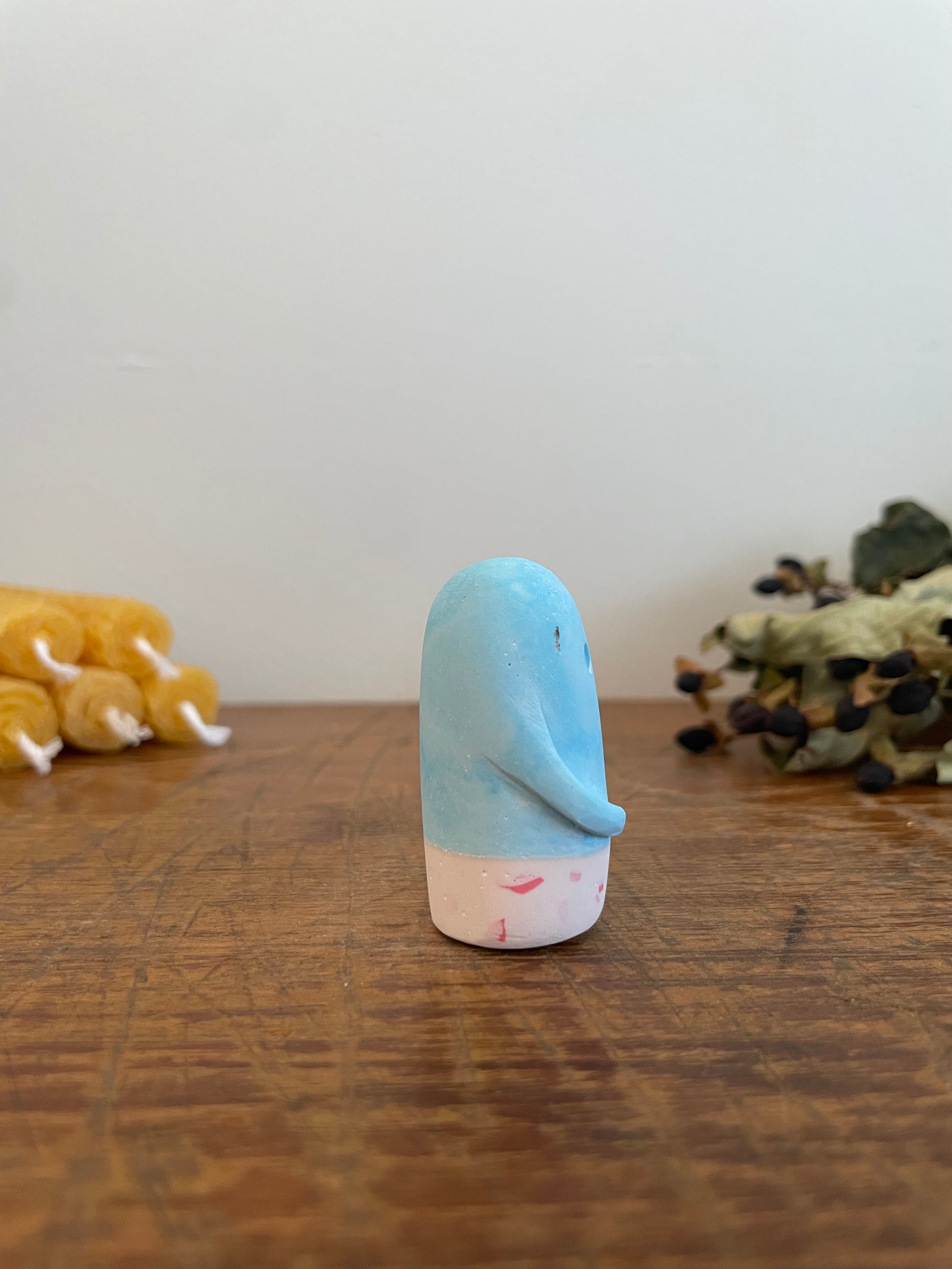 This Domie pictured features a cornflower blue head and a pale pink, speckled body and long arms wrapped around its belly. It is approximately 4.7 cm tall.