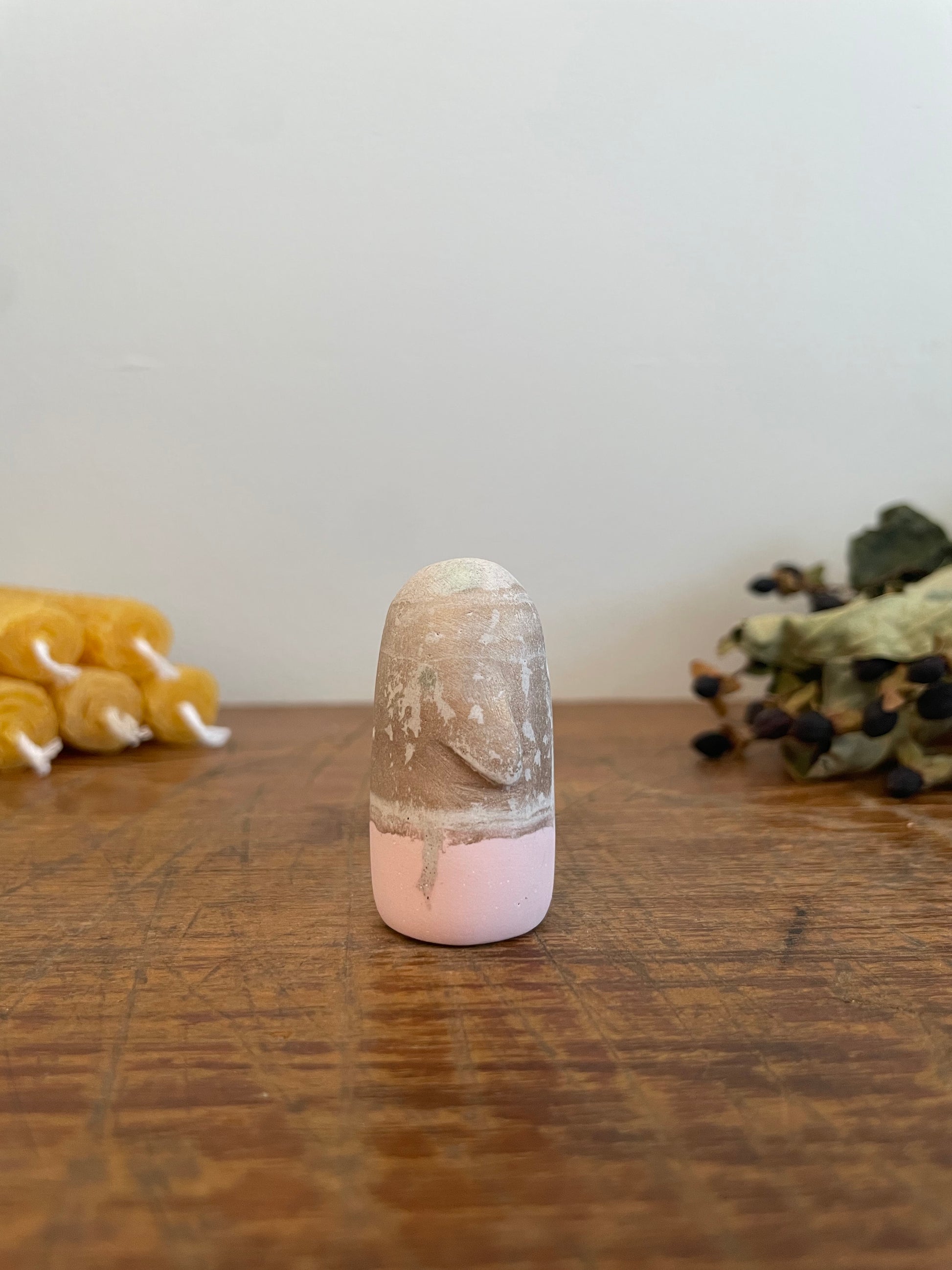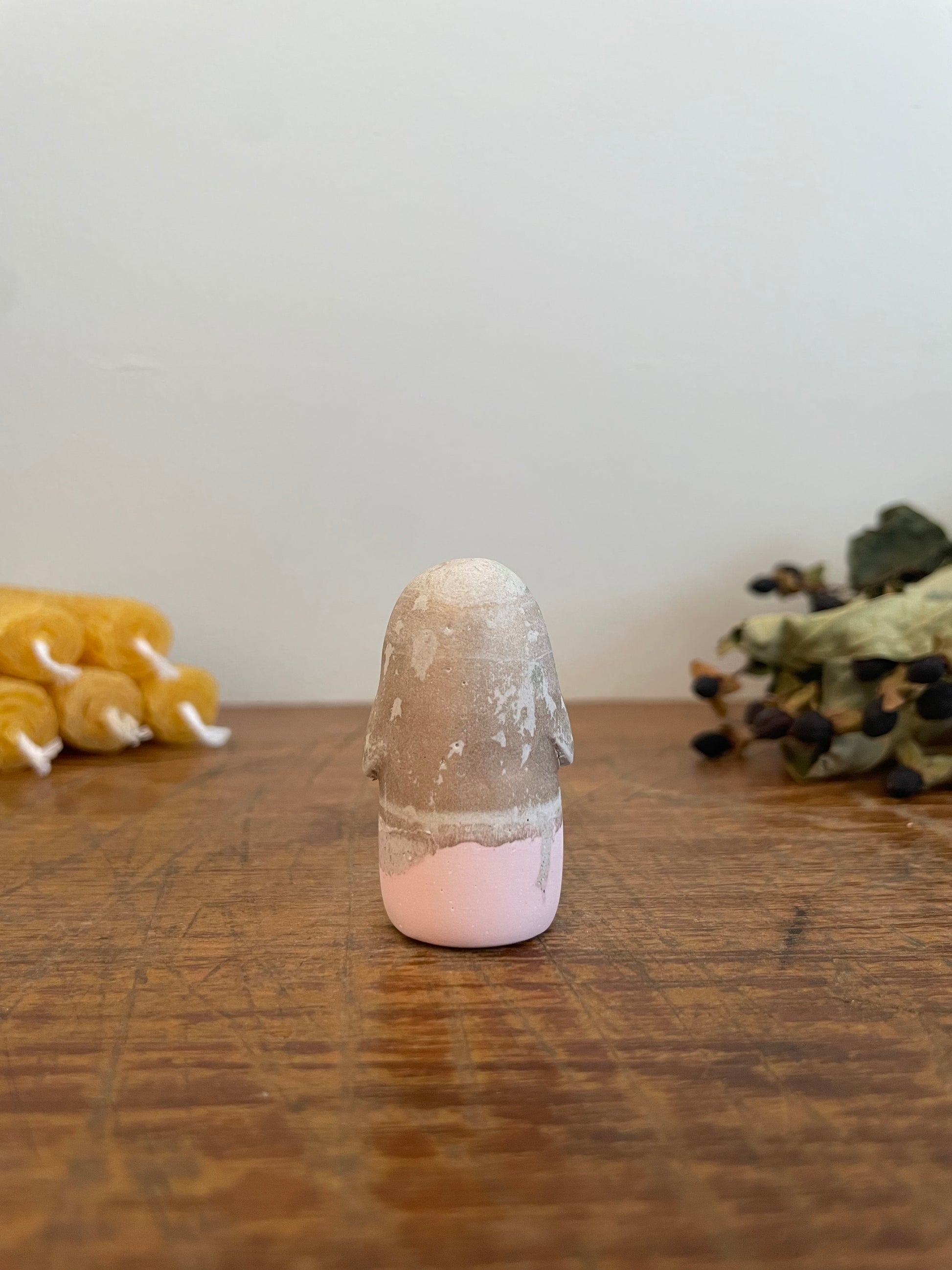 This Domie pictured features a pink base and a gold and stone look upper body and stumpy arms. It is approximately 4.7 cm tall.