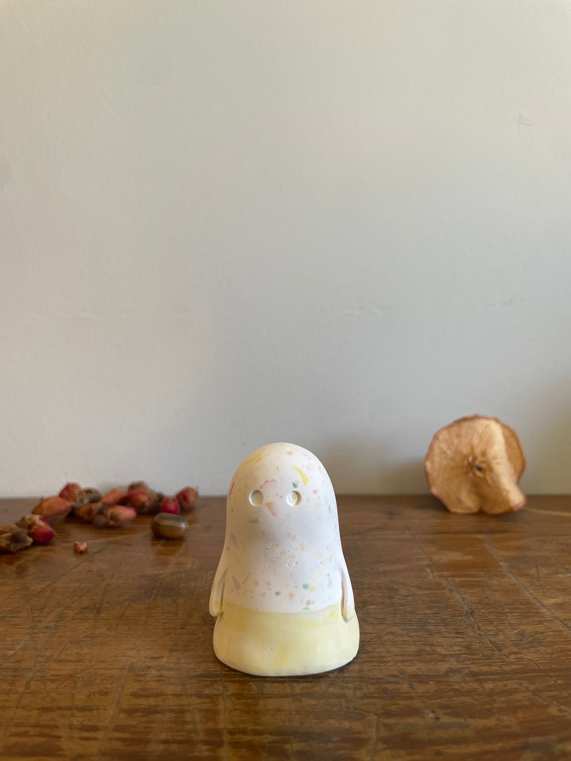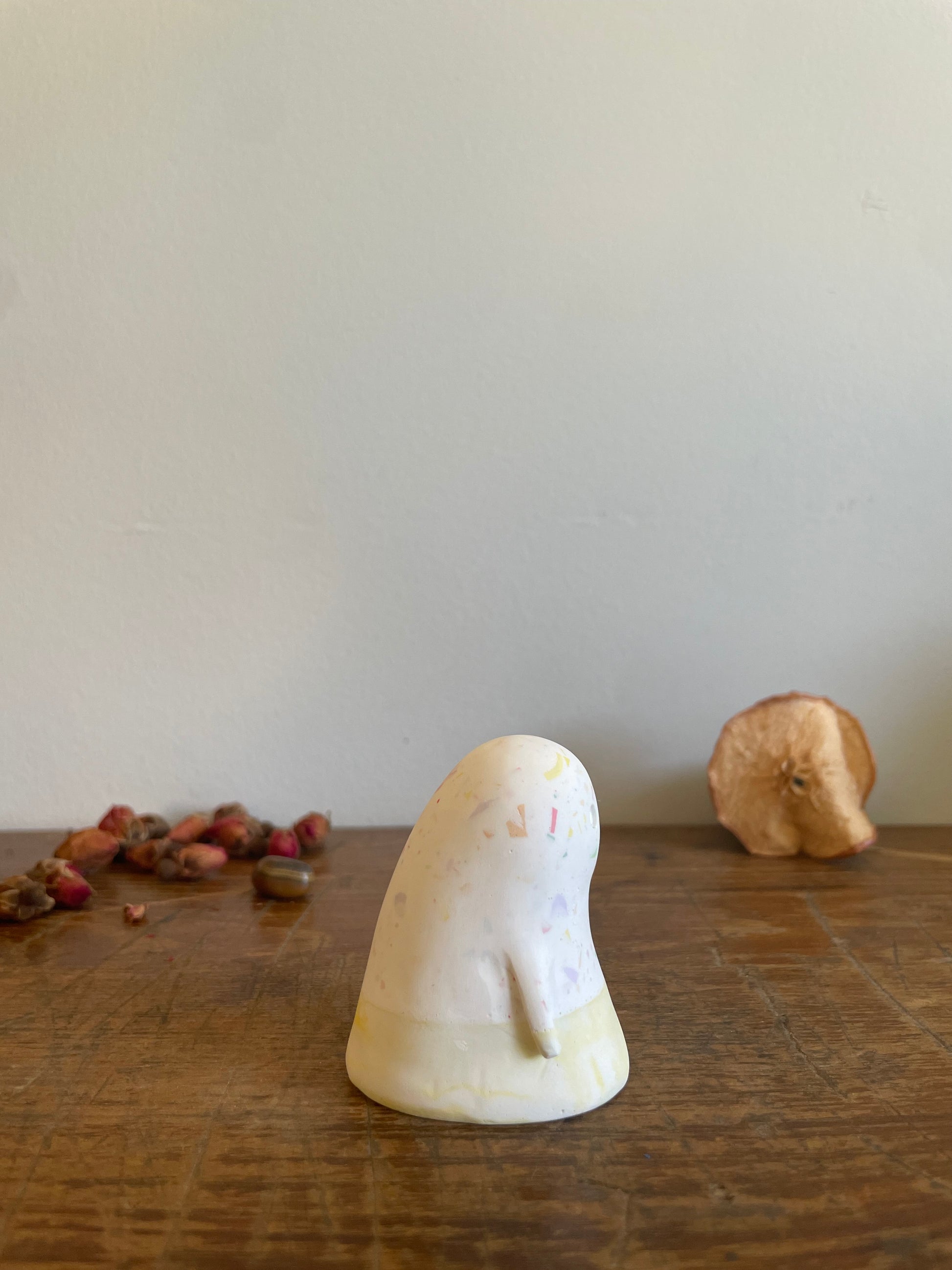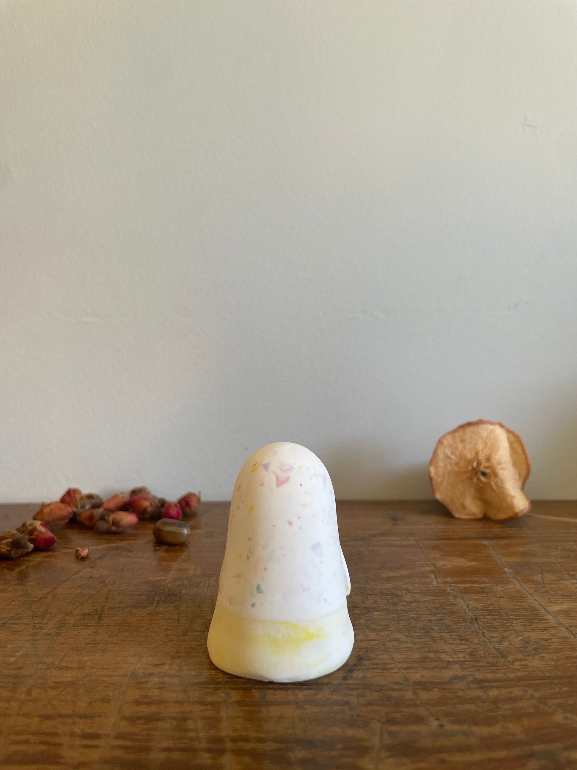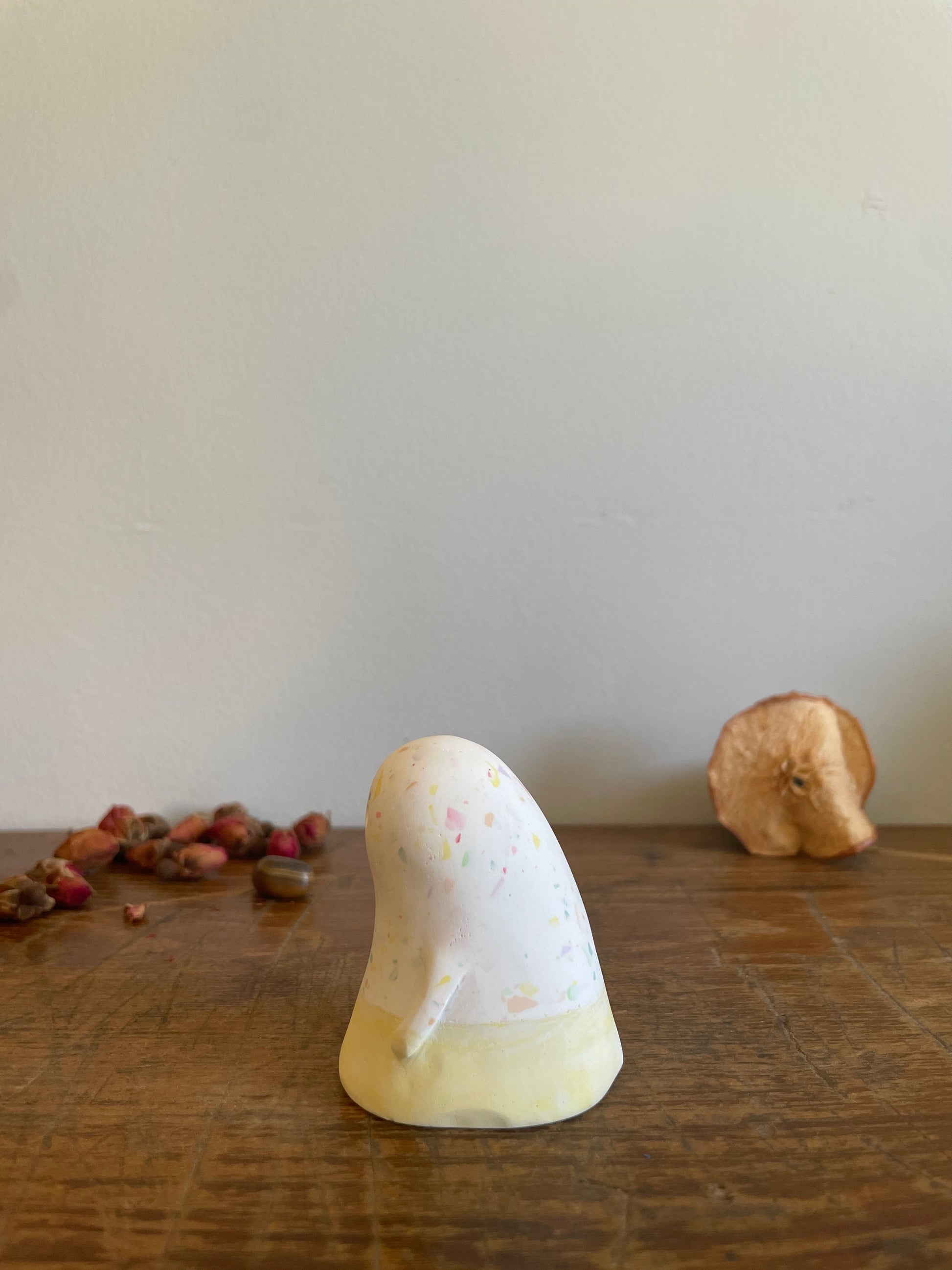 This Domie pictured features a white upper body that has a multi-coloured speckle effect that looks as good as candy. The base (Waist down) is a light and dark marbled yellow with short thin arms that hang by it's body. It is approximately 6cm tall.
