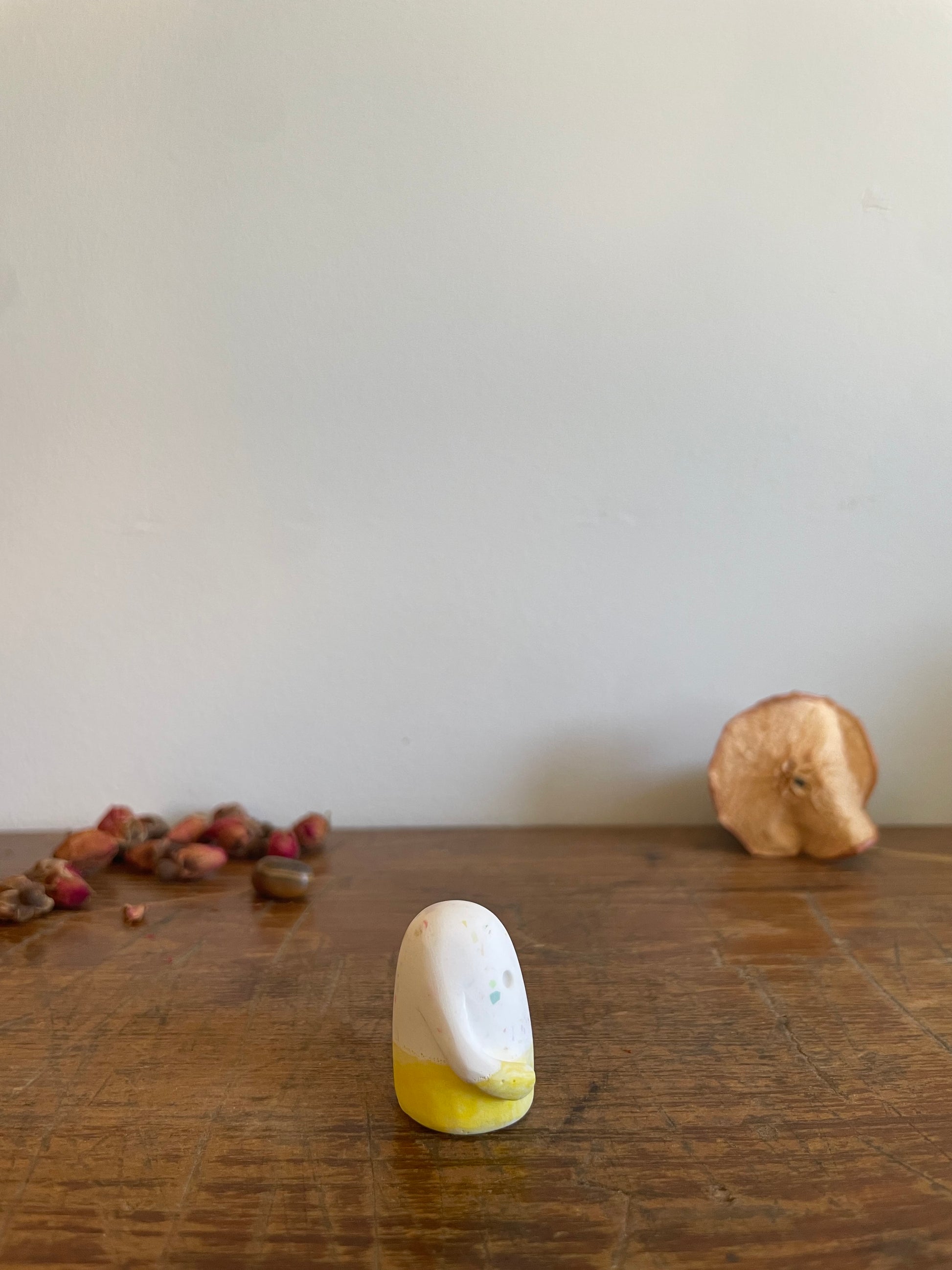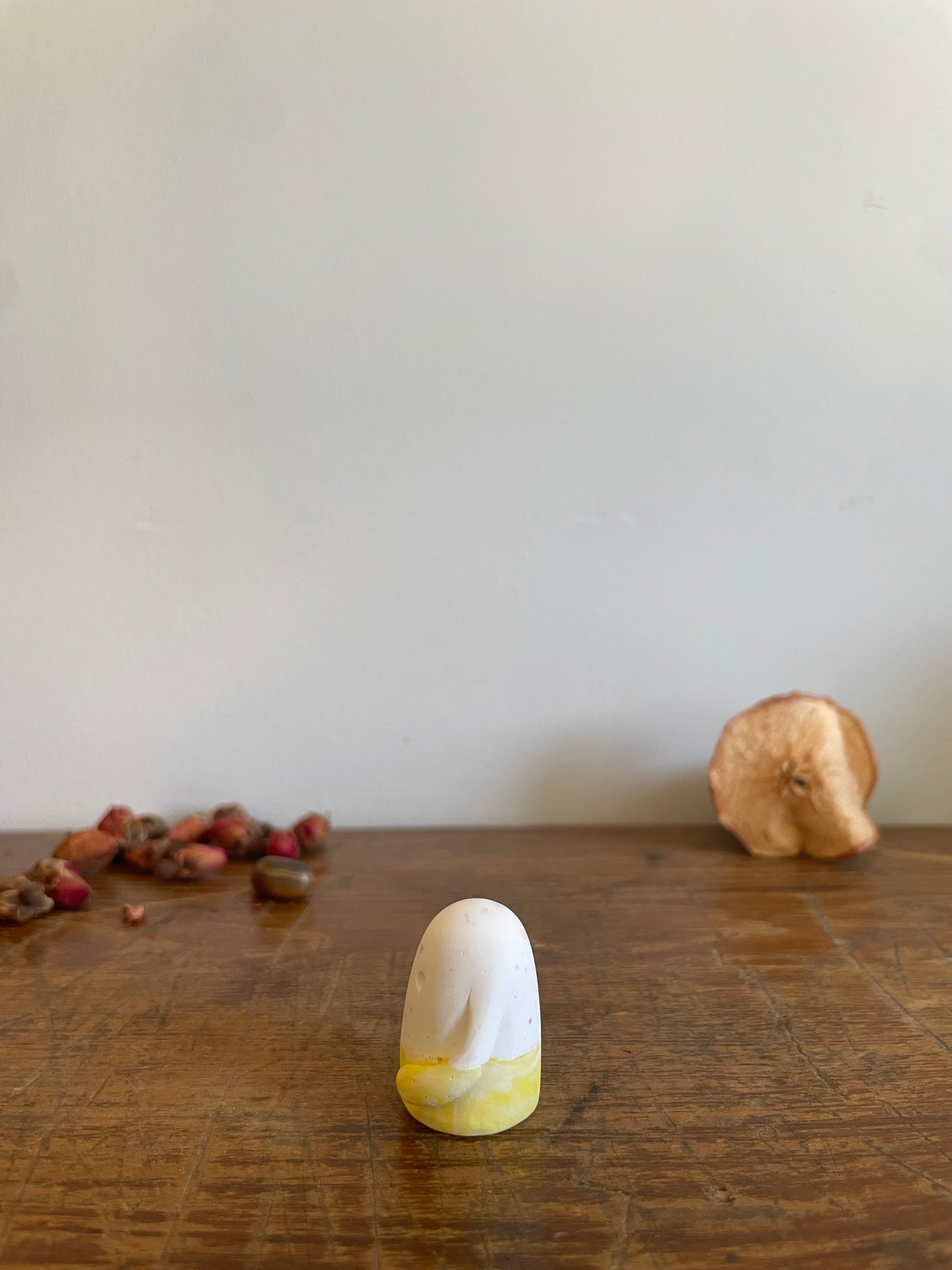 This Domie pictured features a white upper body that has a multi-coloured speckle effect that looks as good as candy. The base (Waist down) is a light and dark marbled yellow with thin arms that wrap around it's body. It is approximately 3.1cm tall.