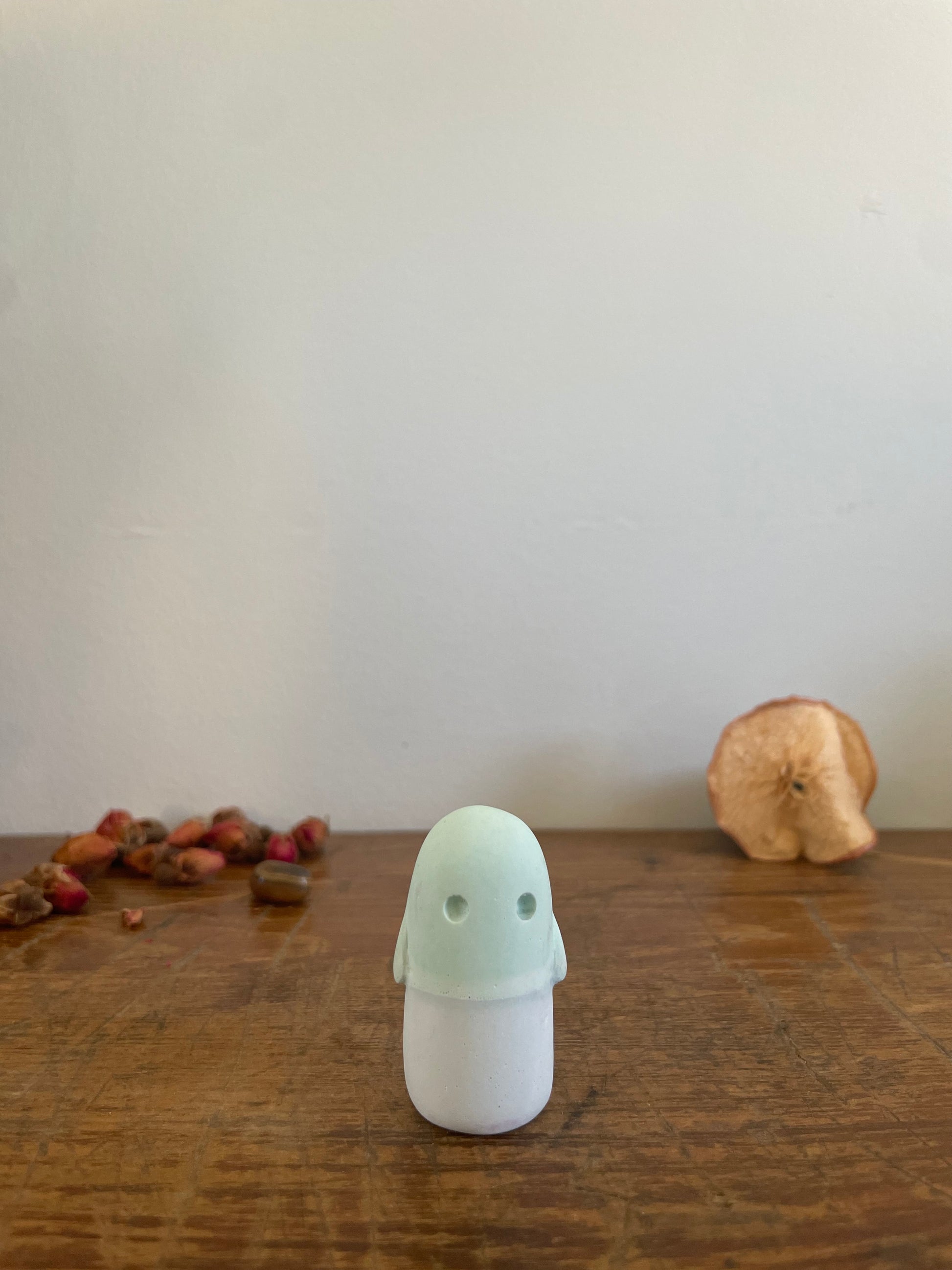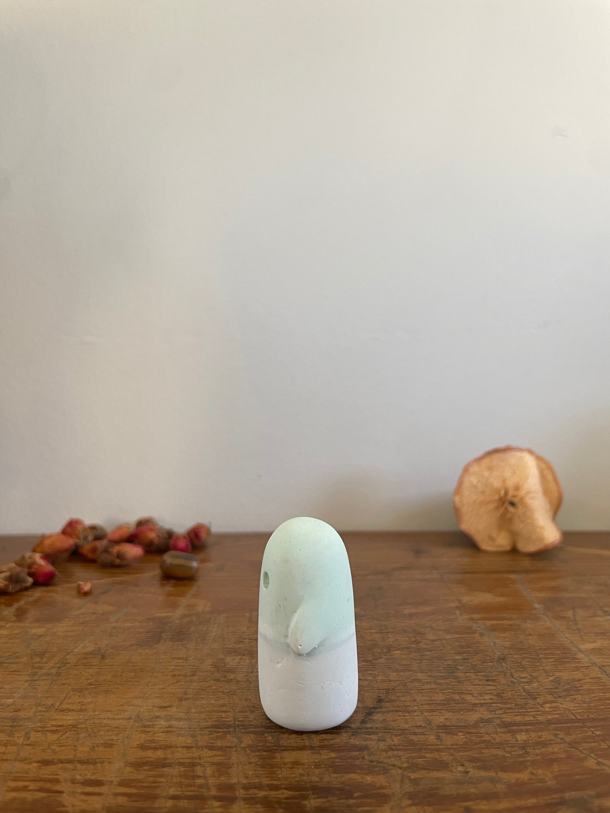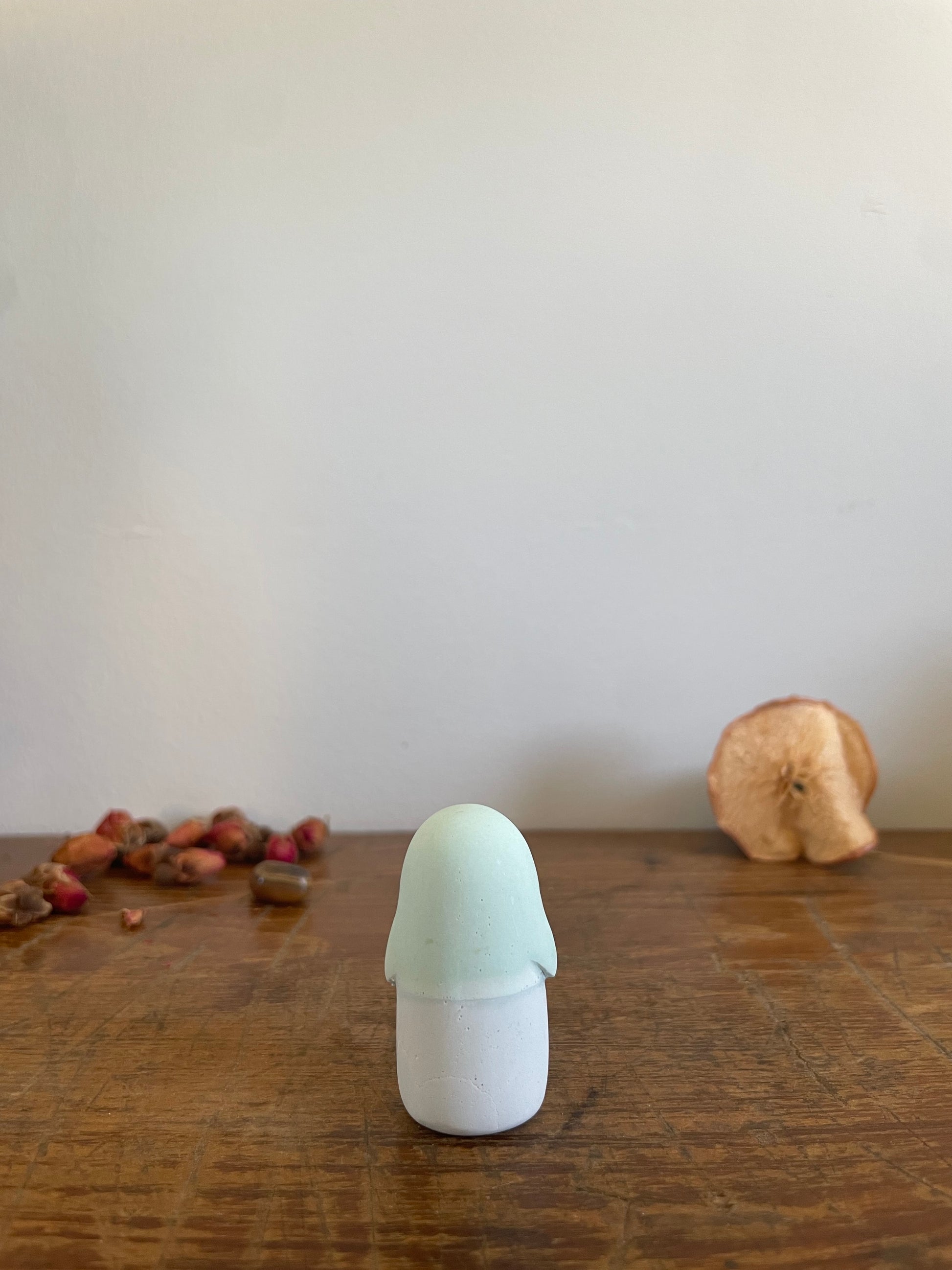 This Domie pictured features 2 colours, the top (from waist up) is a pastel spearmint green, the base is a pastel light blue with stumpy arms that hang by it's body. It is approximately 4.7cm tall.