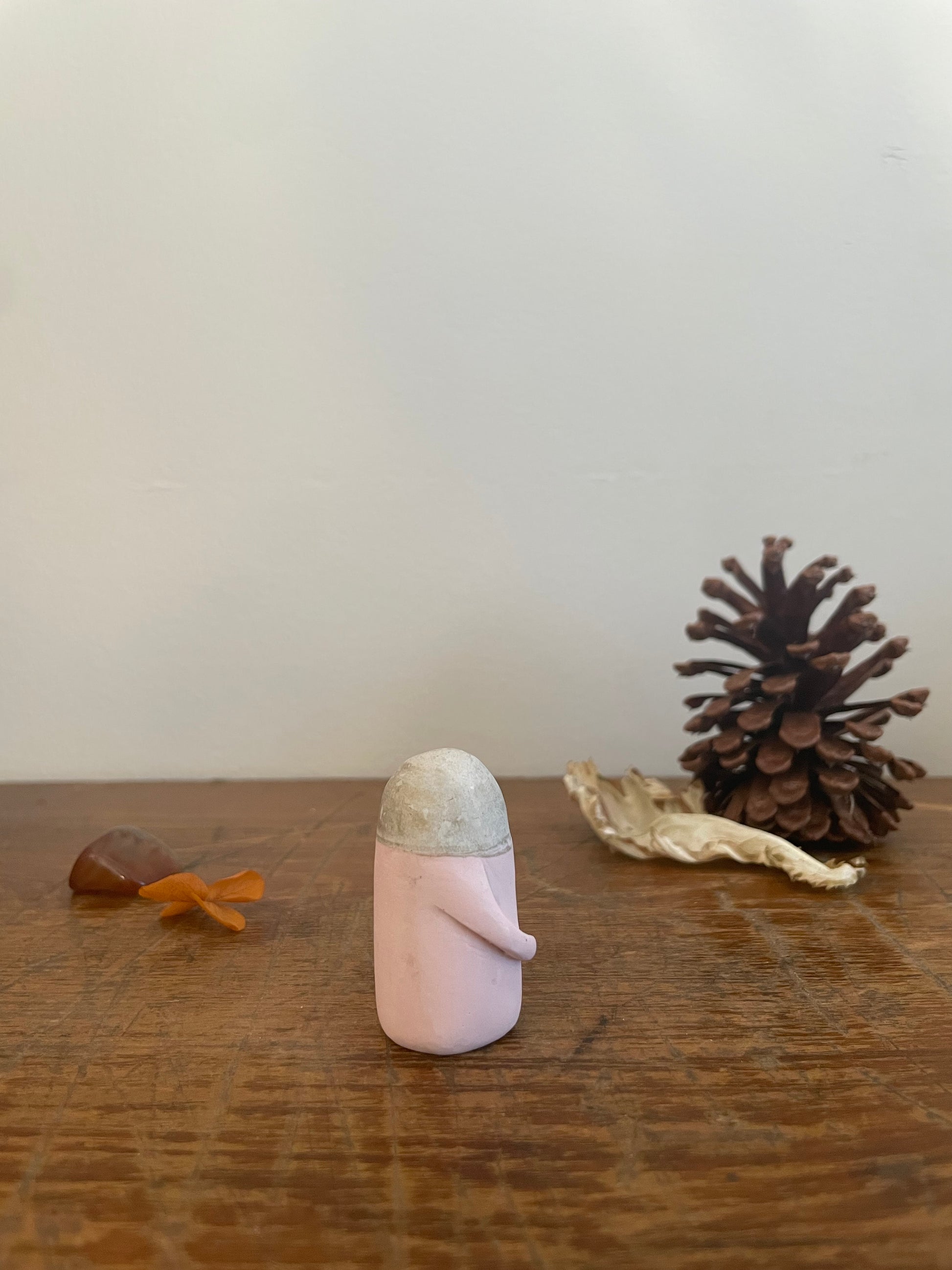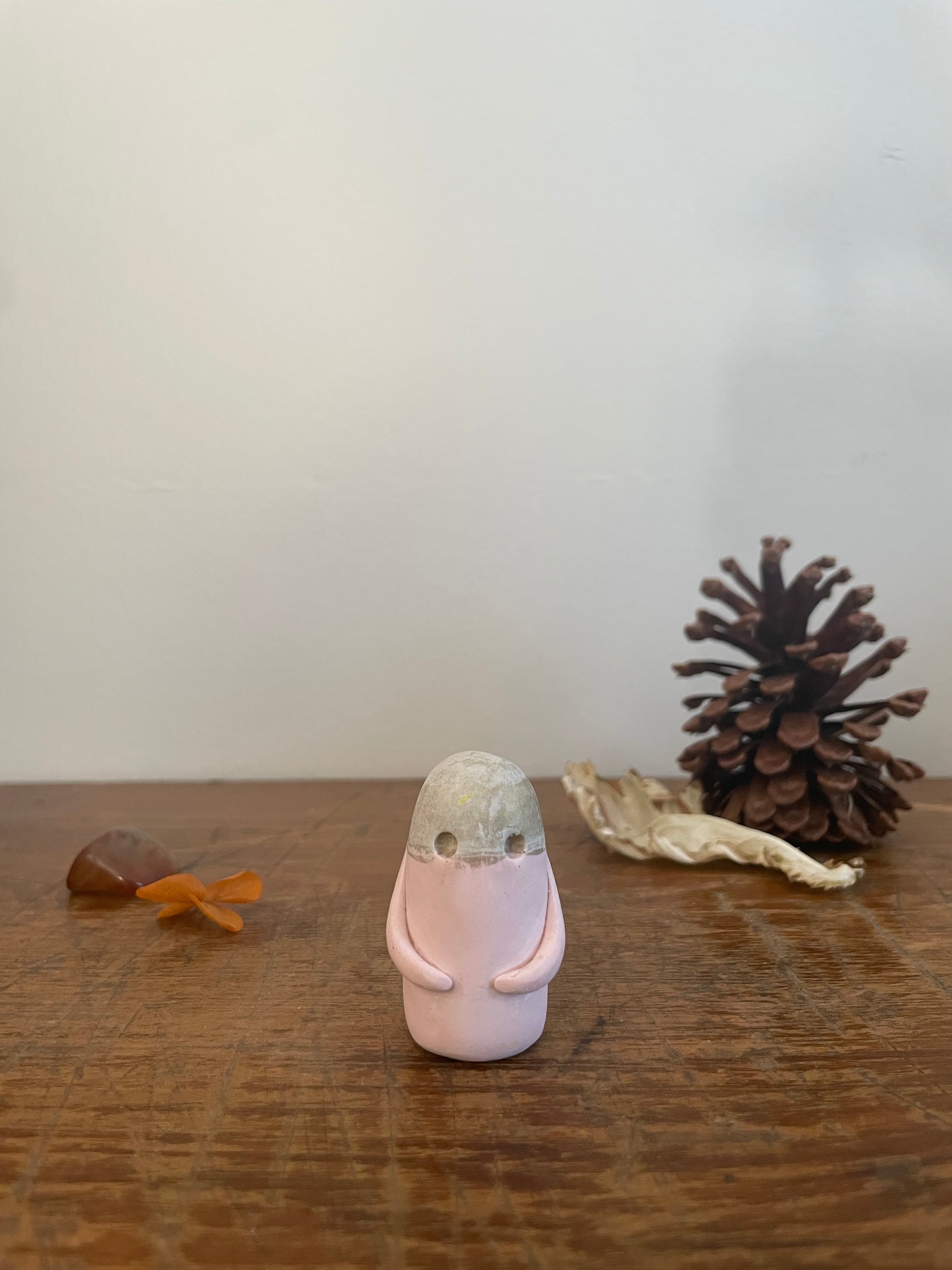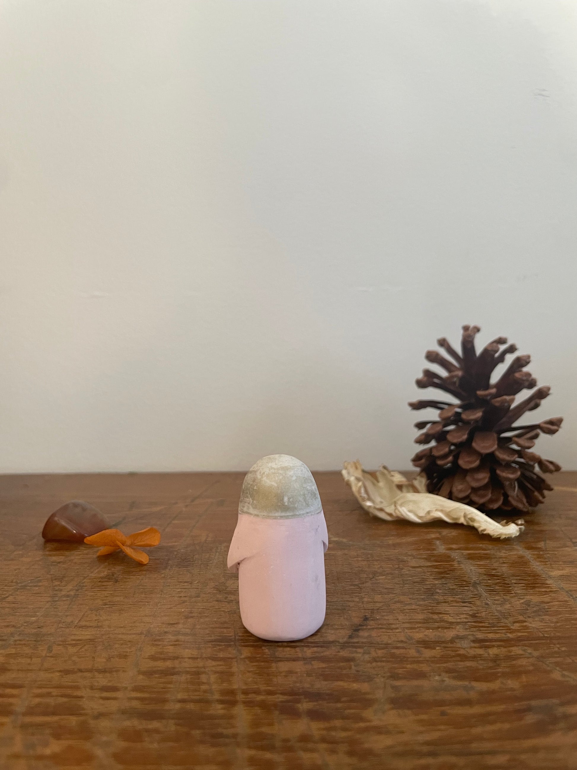 This Domie pictured features a Golden head (from the eyes up) that resembles stone. Below the eyes is a pastel pink colour and long arms that wrap around it's body. It is approximately 4.7cm tall.