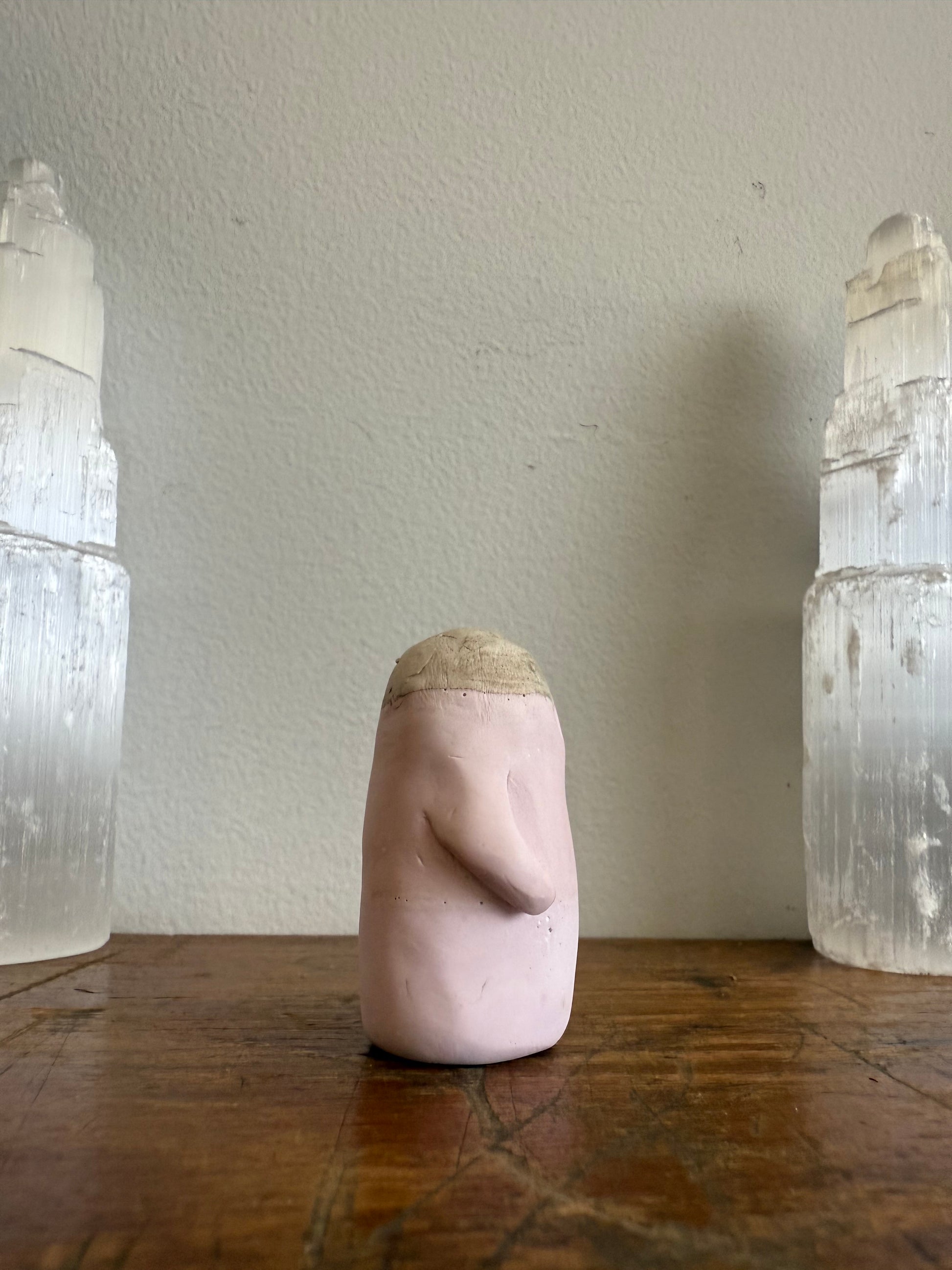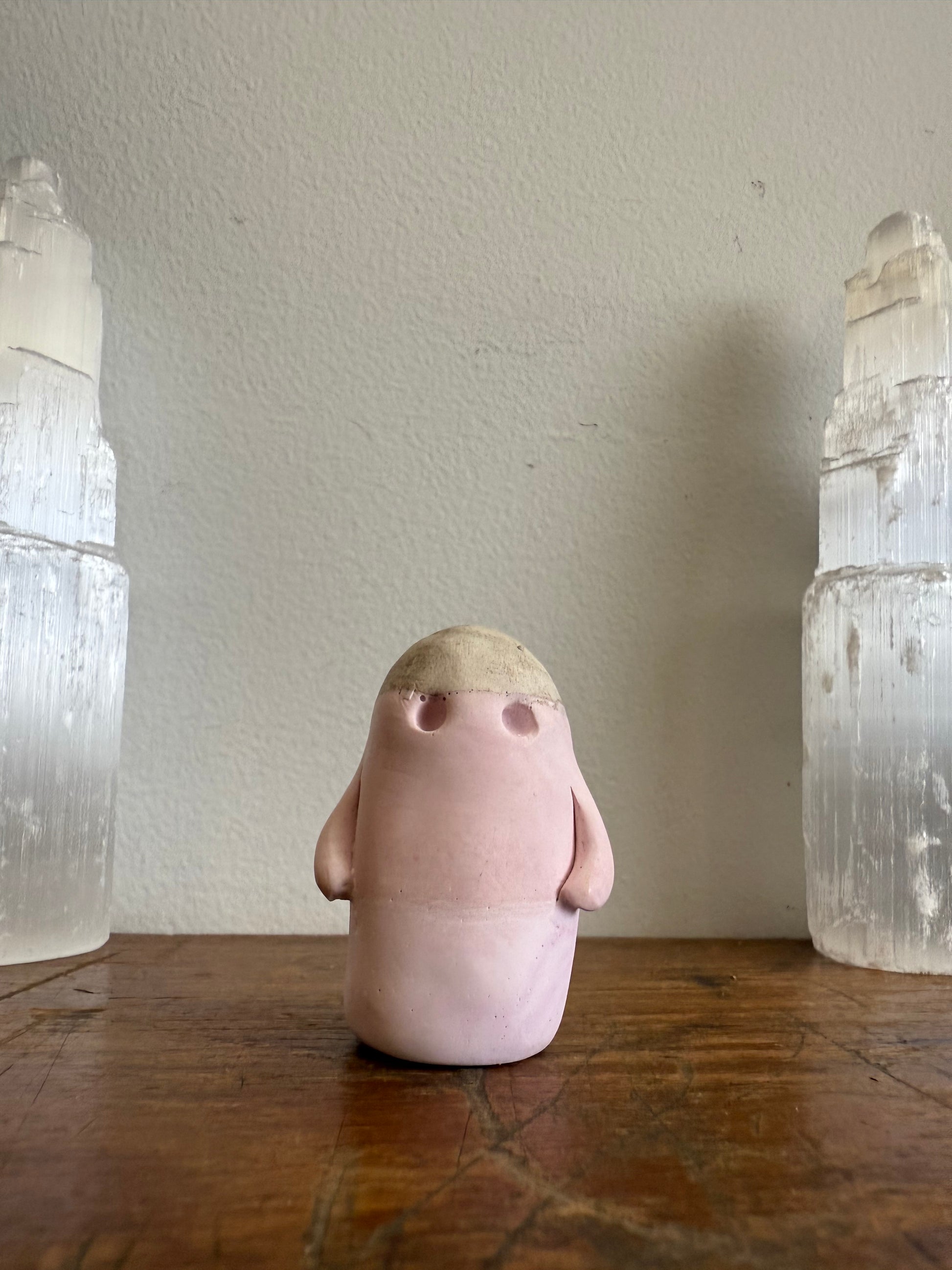 This Domie pictured features a Grey / Golden head (from the top of the eyes up) that resembles stone. Below the eyes is a pastel pink colour, finally the base is a pastel purple. with thin arms wrapping around it's body. It is approximately 5.5cm tall.
