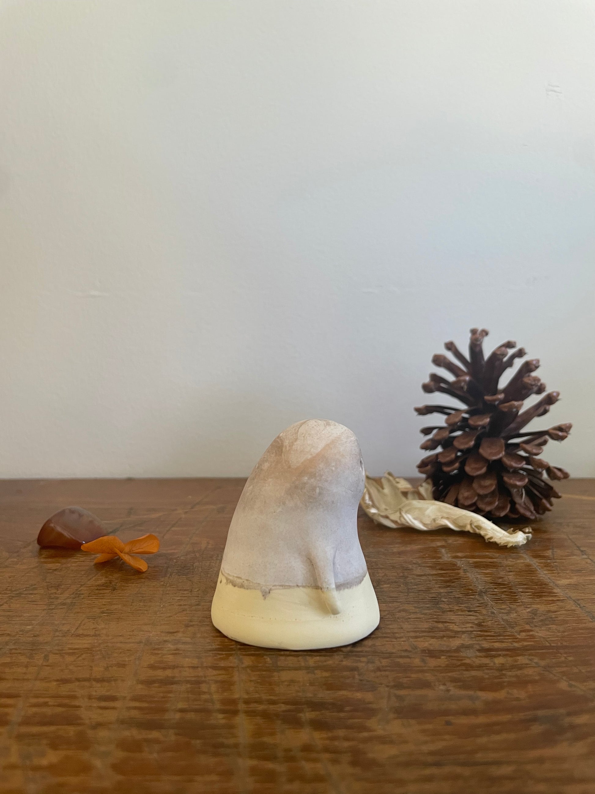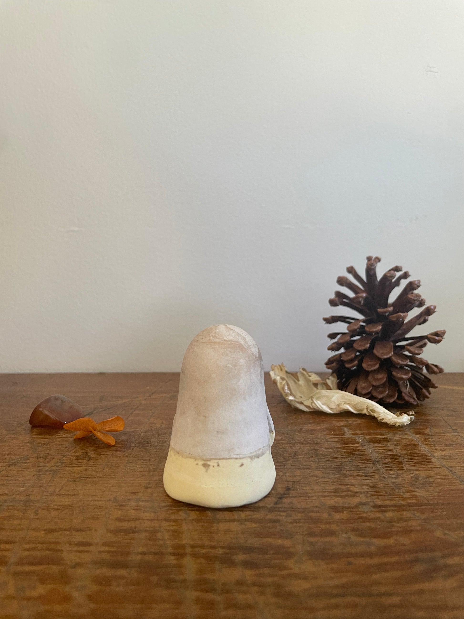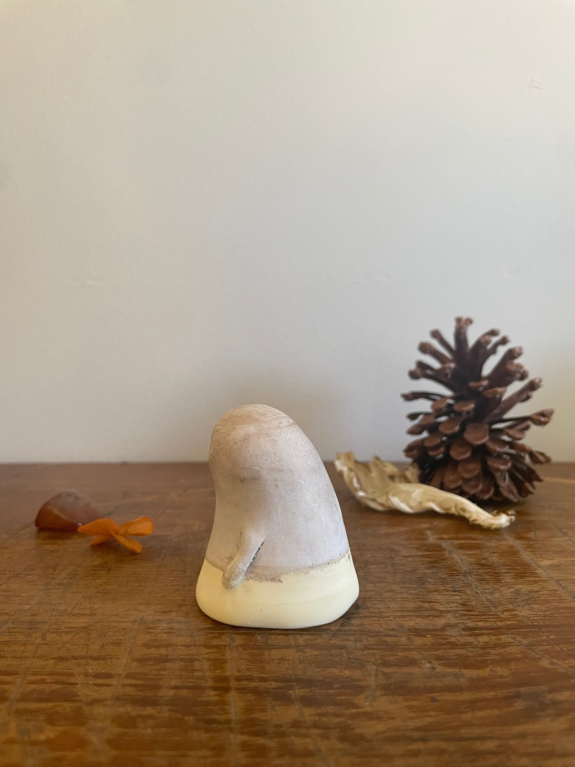 This Domie pictured features a Golden upper body (from the waist up) that resembles stone. The bottom section is a pastel pink yellow colour with medium arms resting at its side. It is approximately 6cm tall.