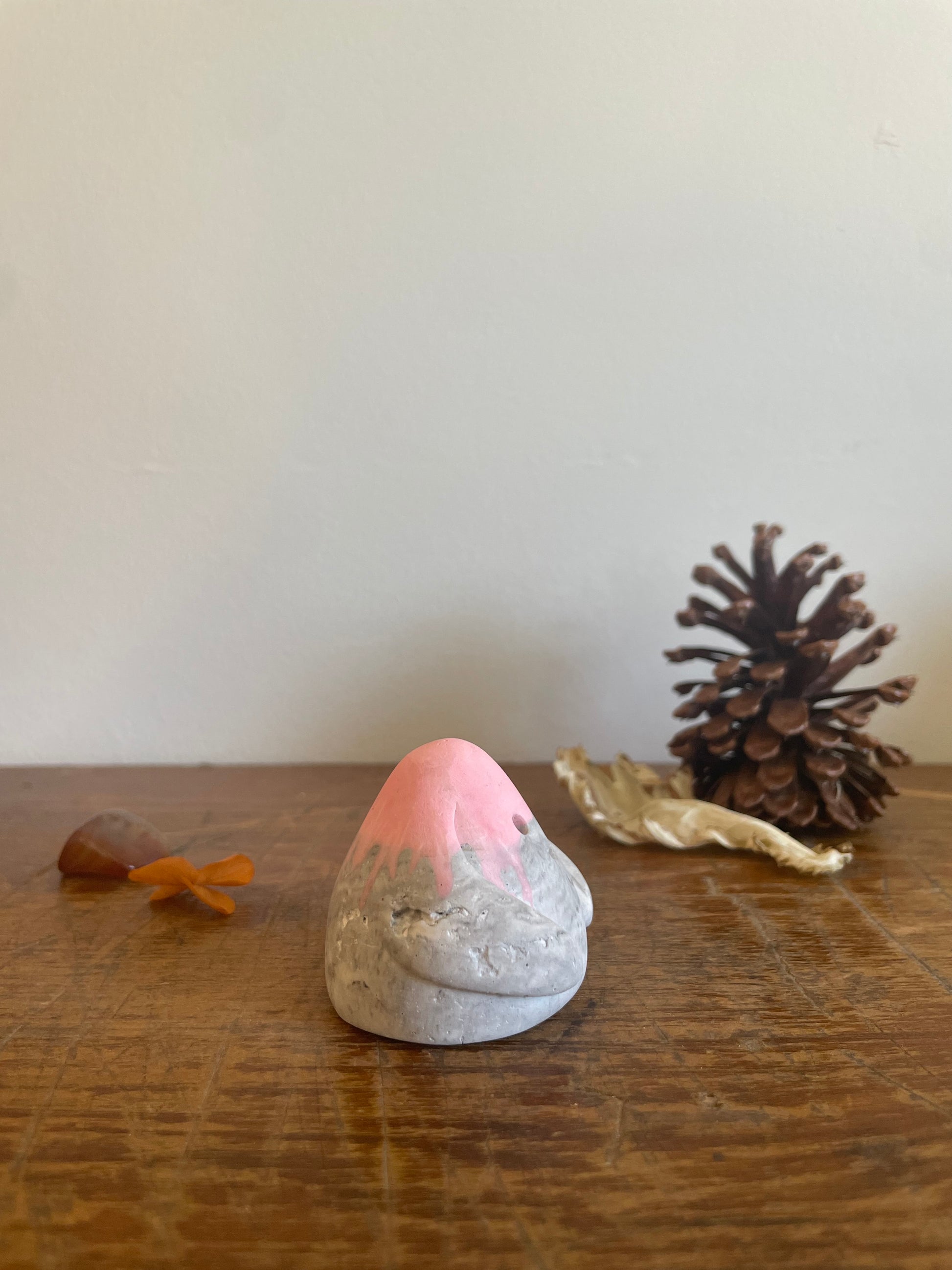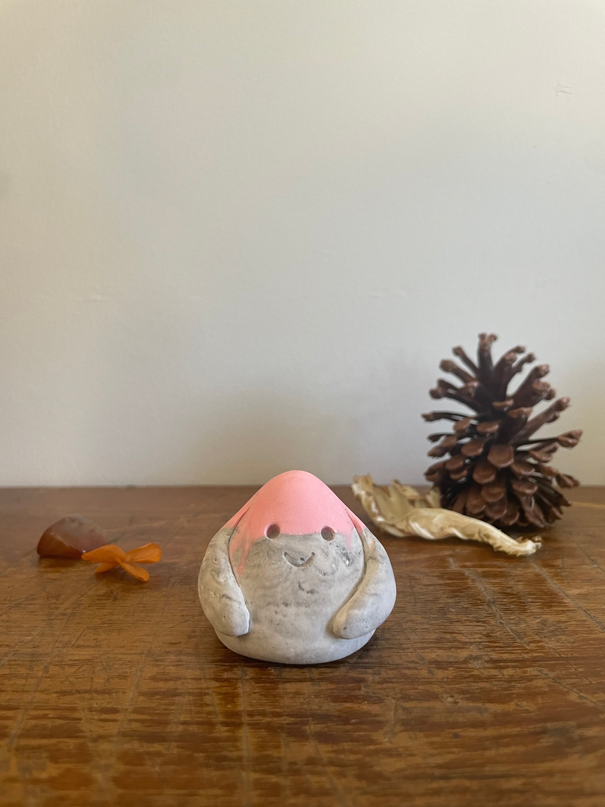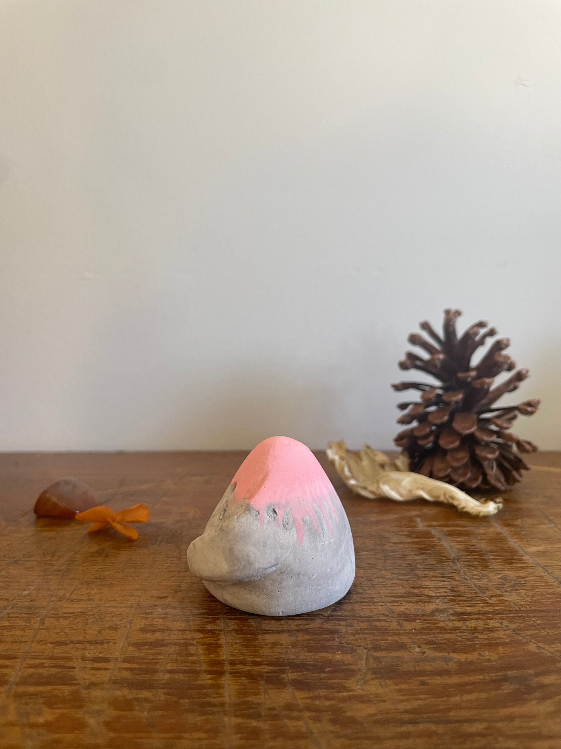 This Domie pictured features a Pastel Pink upper body (from the eyes up). The bottom section is a marbled grey and white swirl that resembles stone with medium thick arms wrapping around it's body . It is approximately 4.6cm tall.