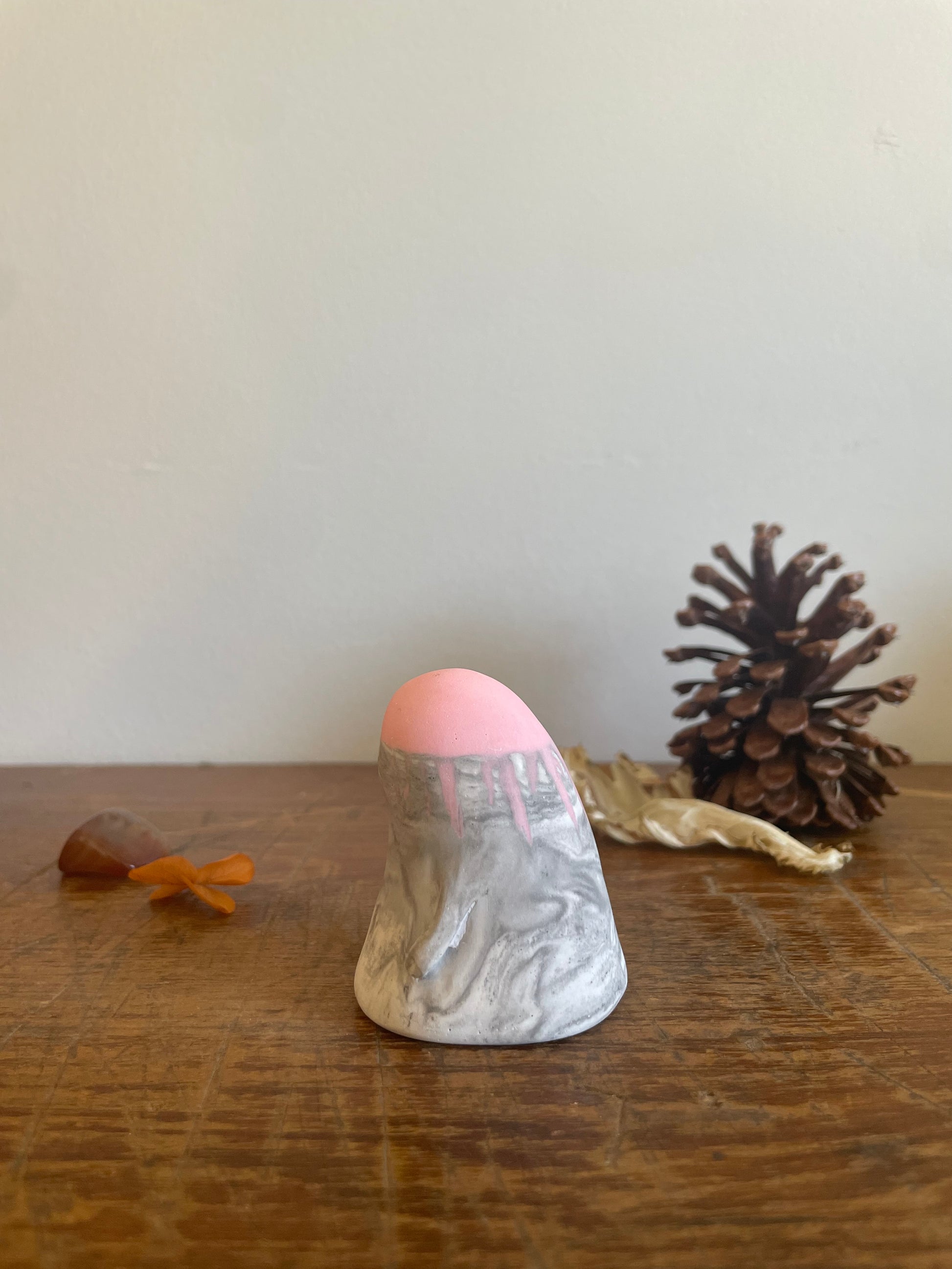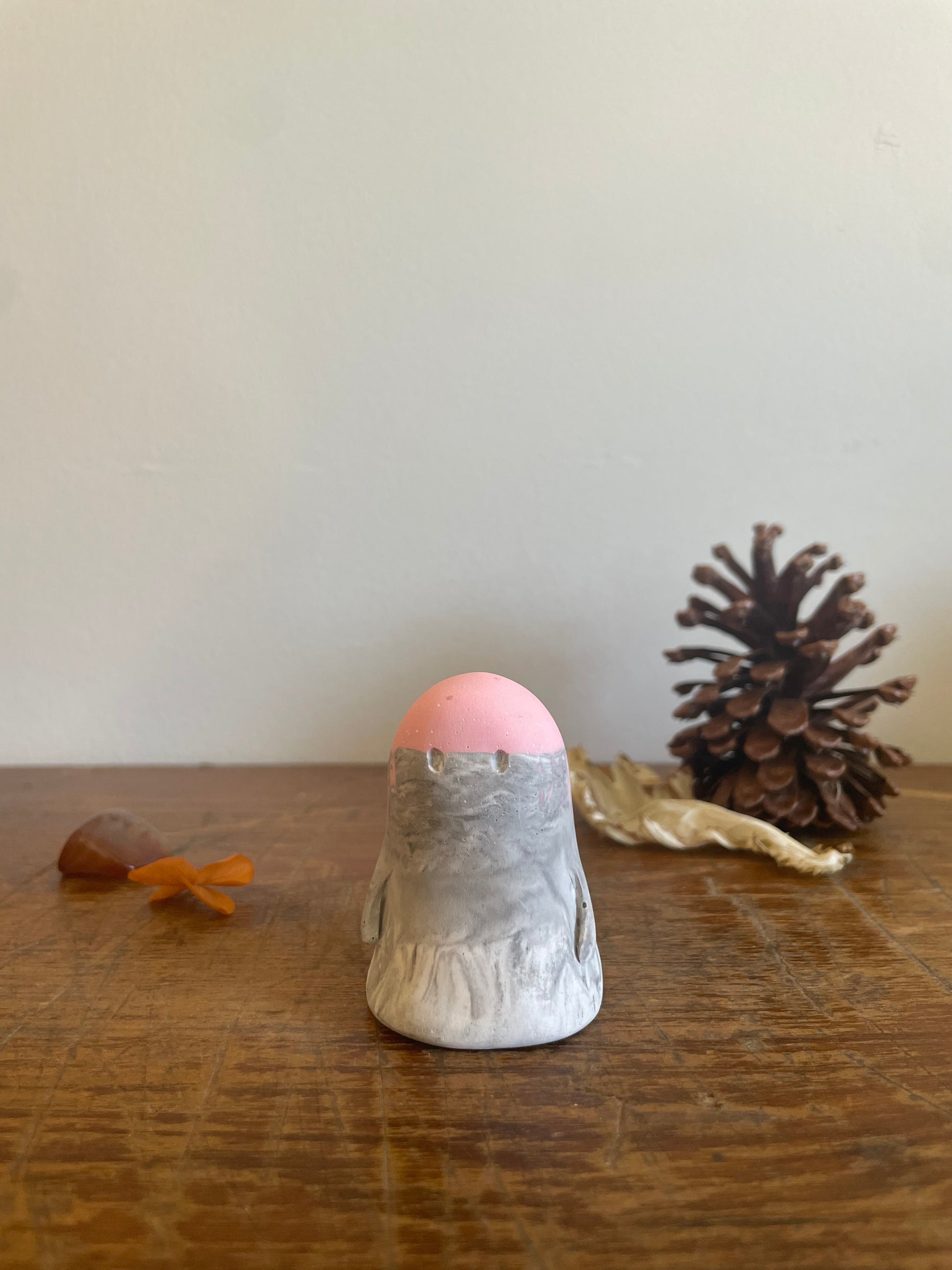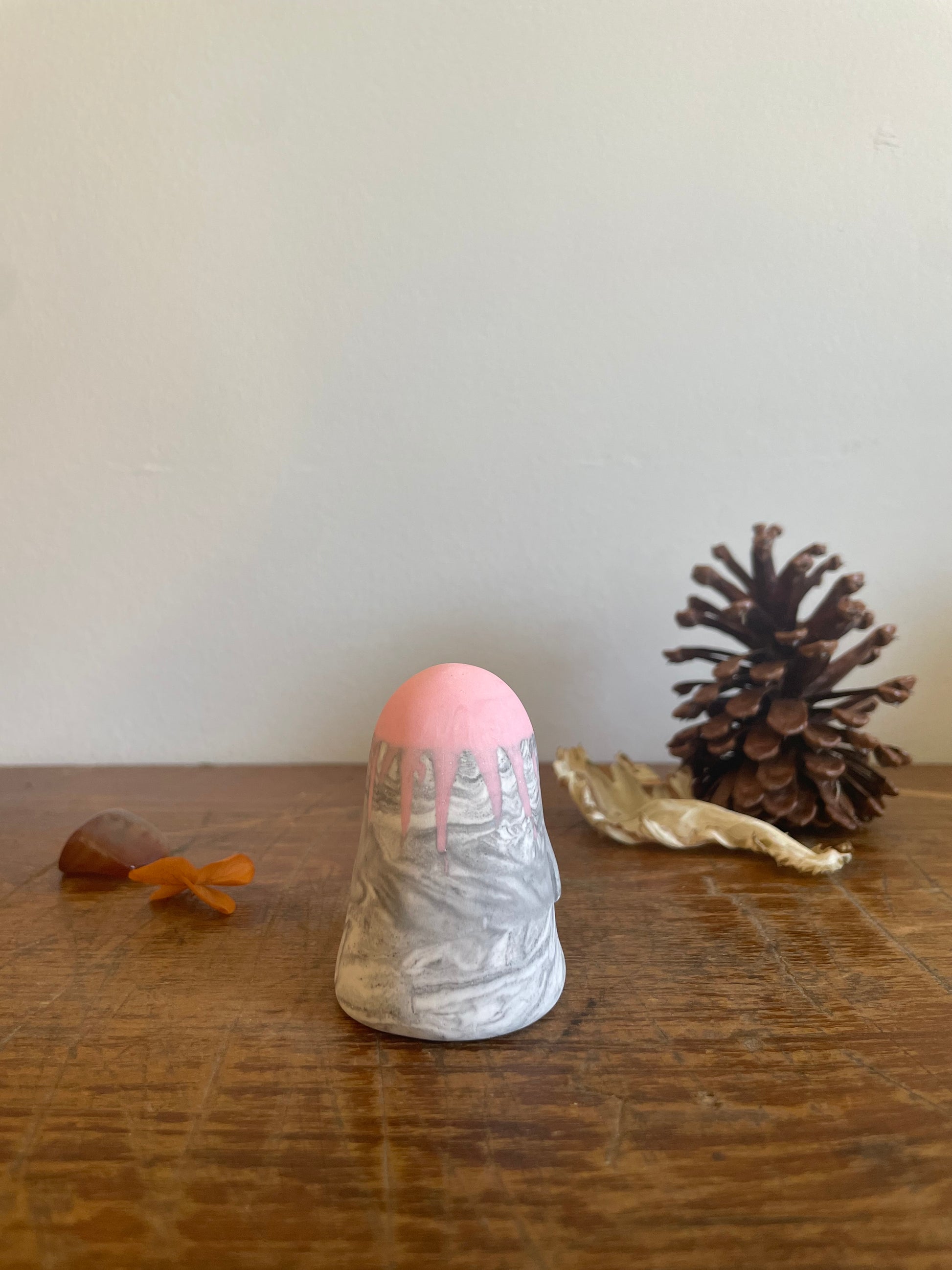 This Domie pictured features a Pastel Pink upper body (from the eyes up). The bottom section is a marbled grey and white swirl that resembles stone with medium arms that hang by it's side . It is approximately 6cm tall.