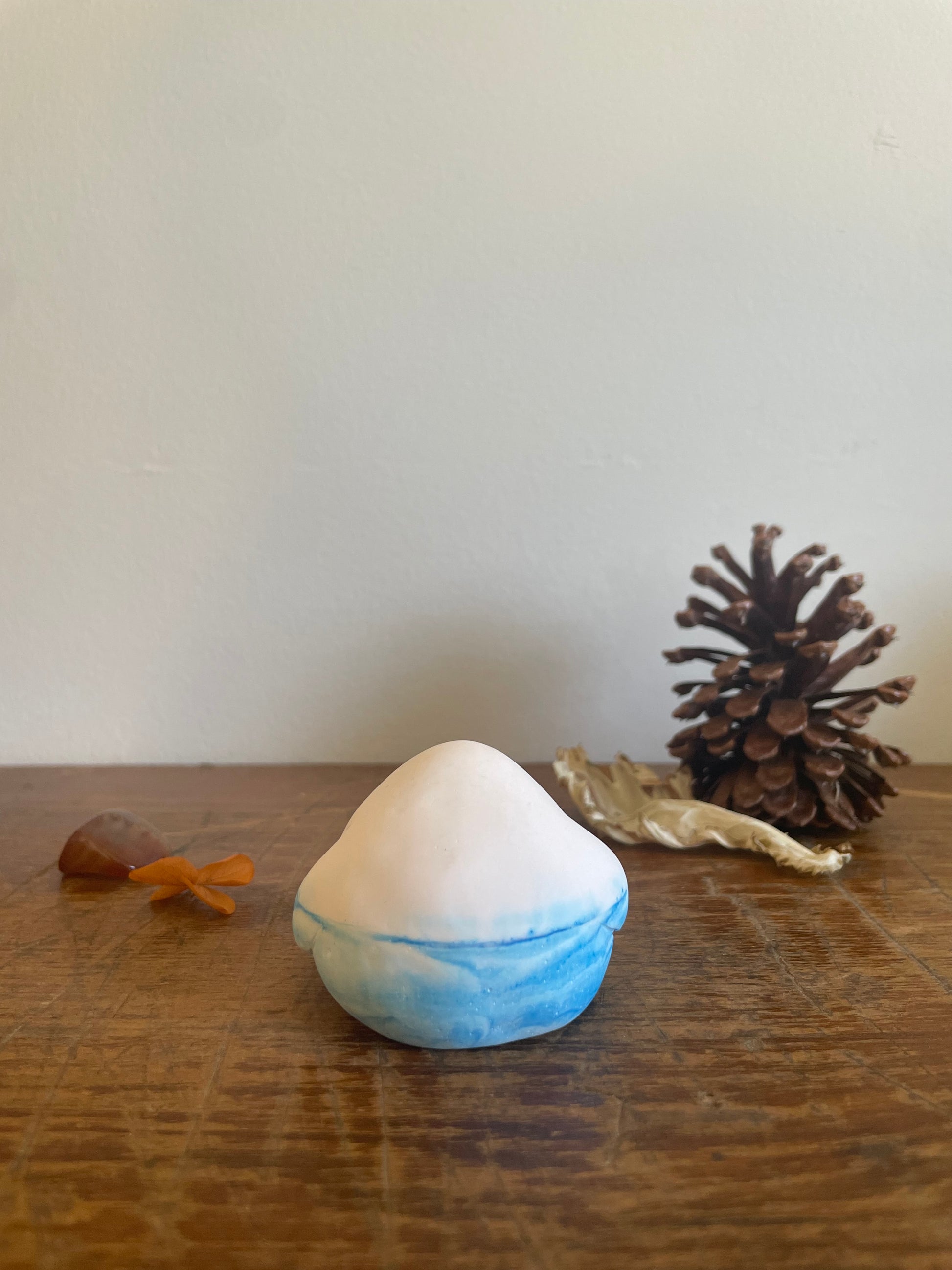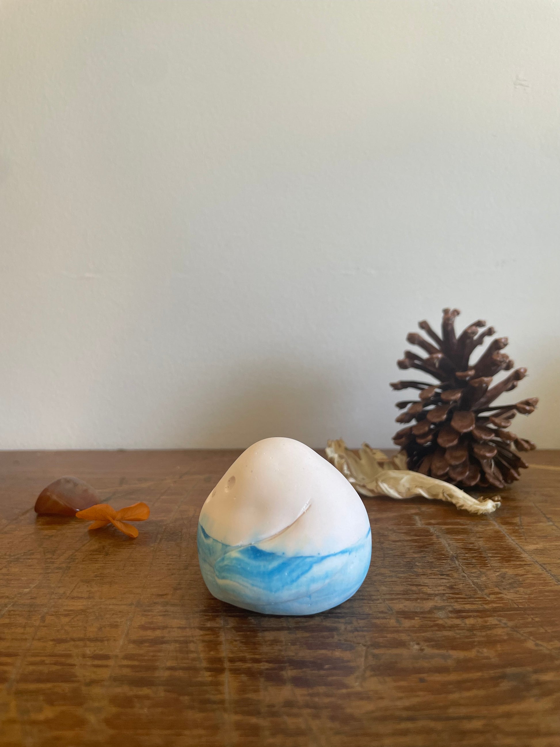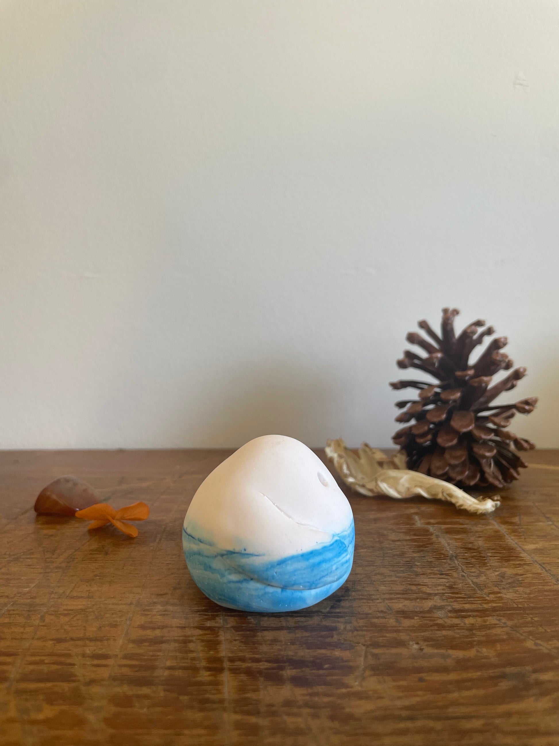 This Domie pictured features a White upper body (from the waist up). The bottom section is a marbled light and sky blue swirl that resembles a cloudy sky with thick arms that wrap around it's body. It is approximately 4.5cm tall.