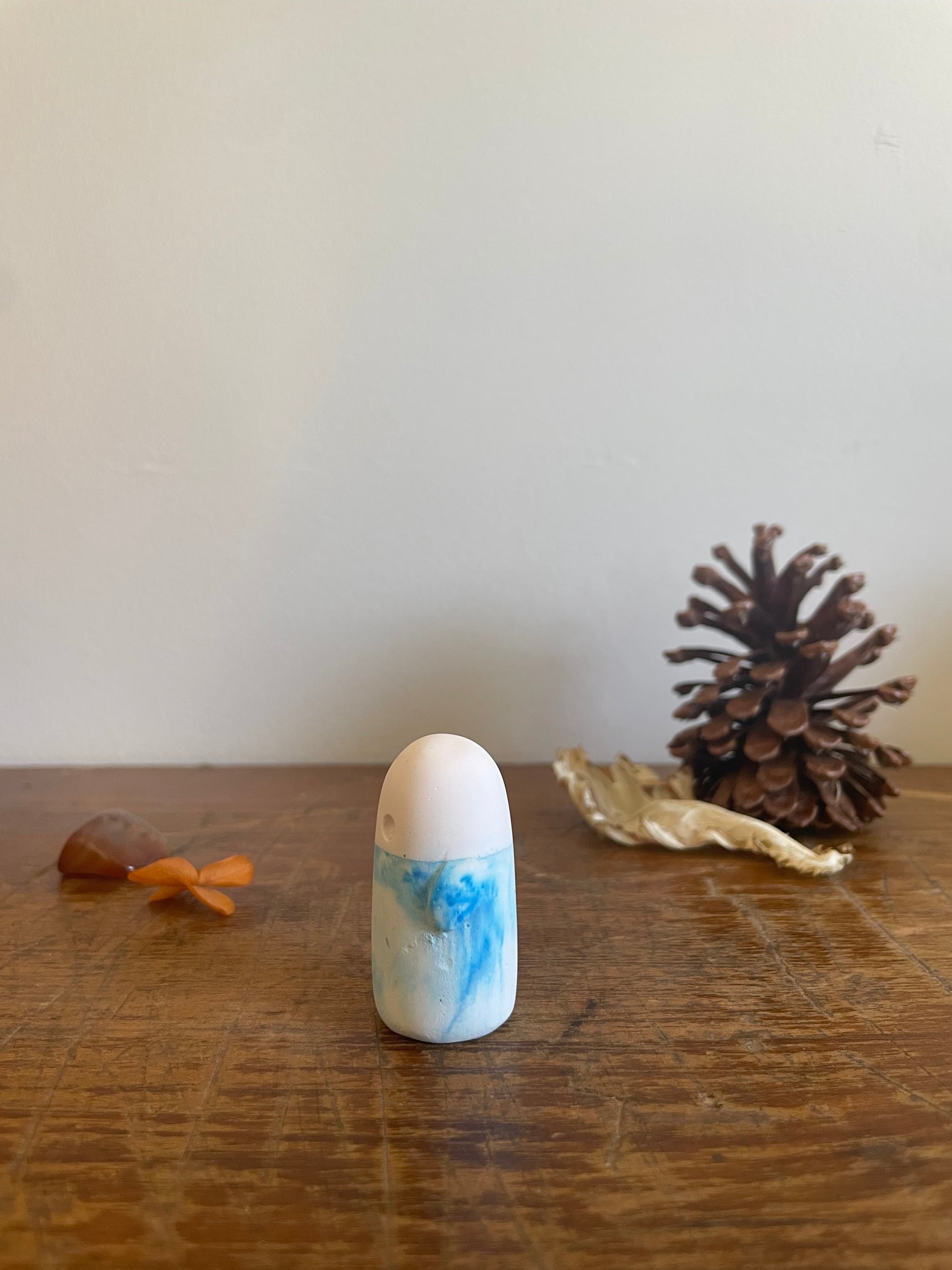 Thislittle Domie pictured features a White upper body (from the eyes up). The bottom section is a marbled light and sky blue swirl that resembles a cloudy sky with stumpy arms that hang by it's side . It is approximately 4.7cm tall.