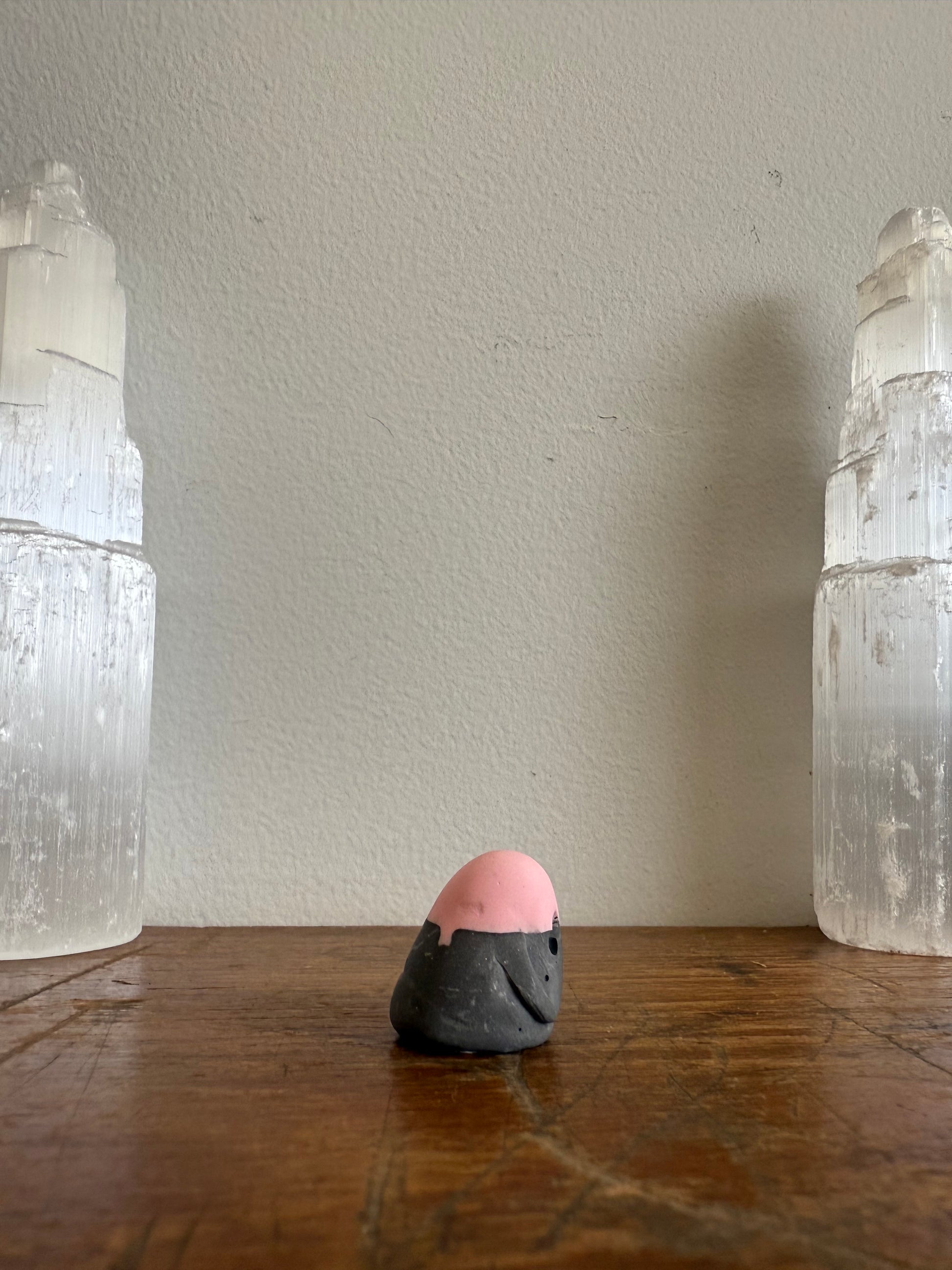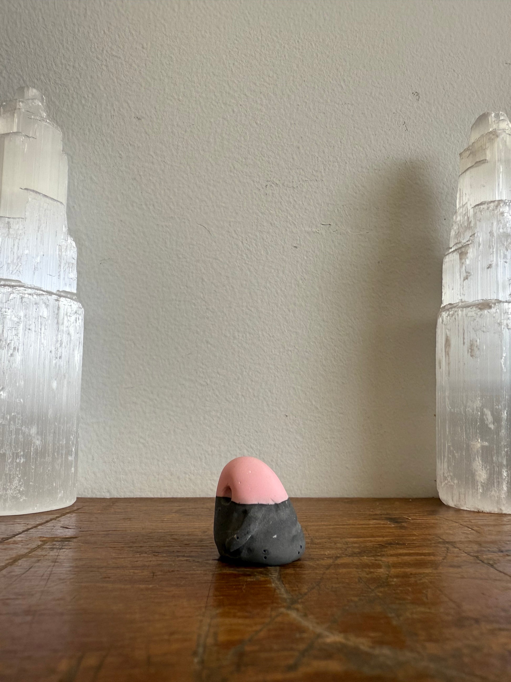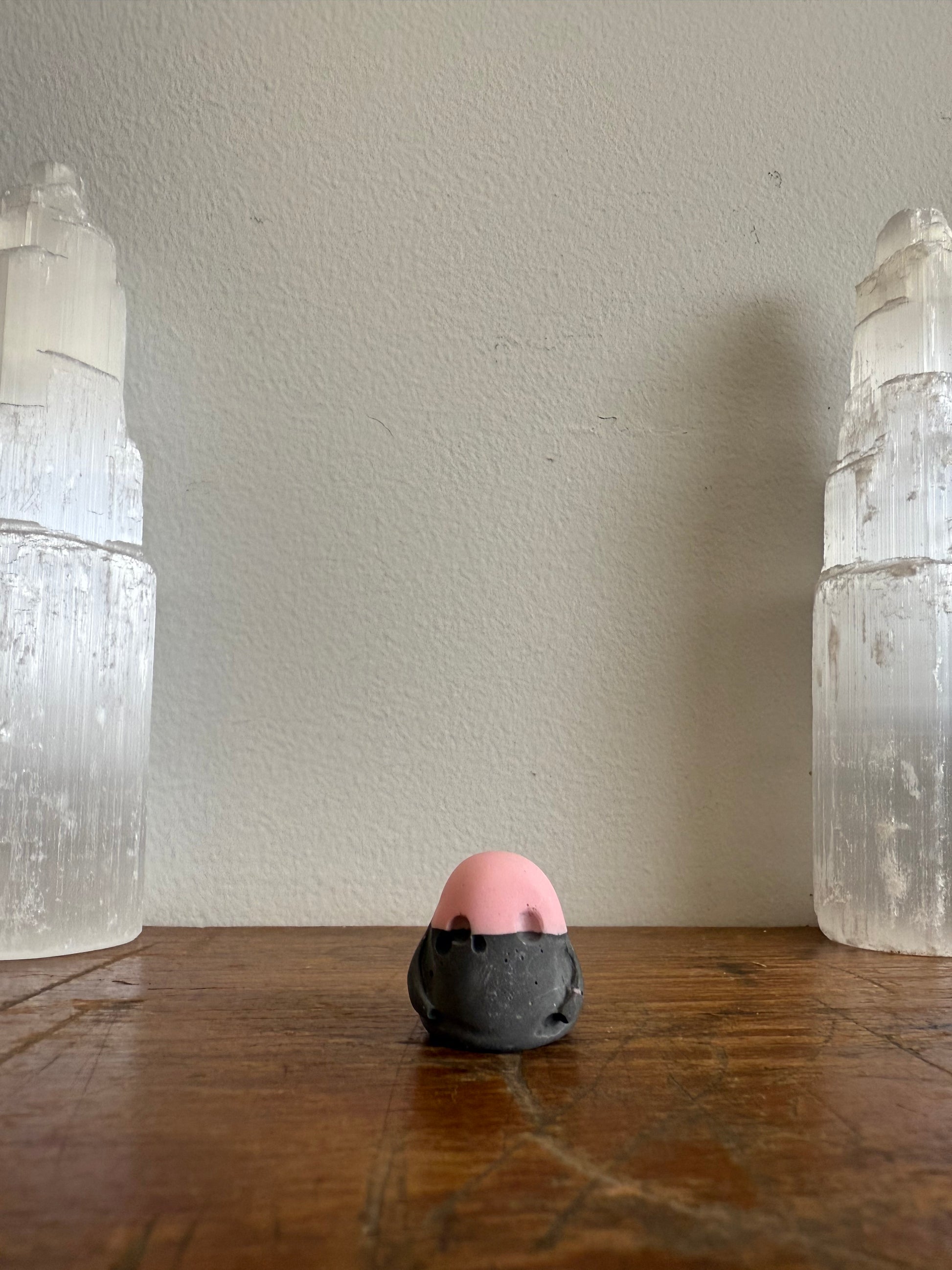This Domie pictured features a pink upper (from the eyes up) with a grey base. It has thin arms that wrap around it's body. It is approximately. It is approximately 2cm tall.
