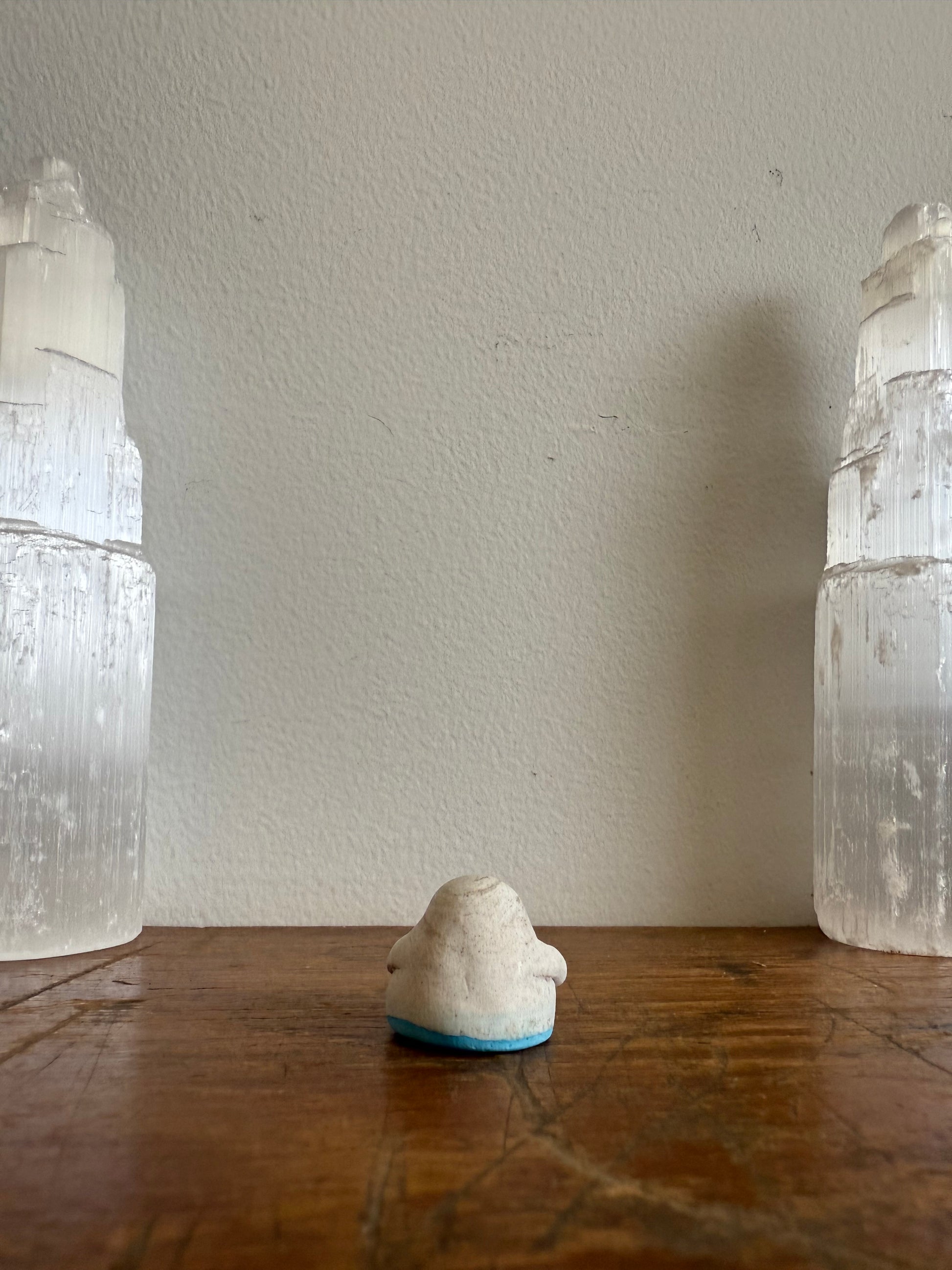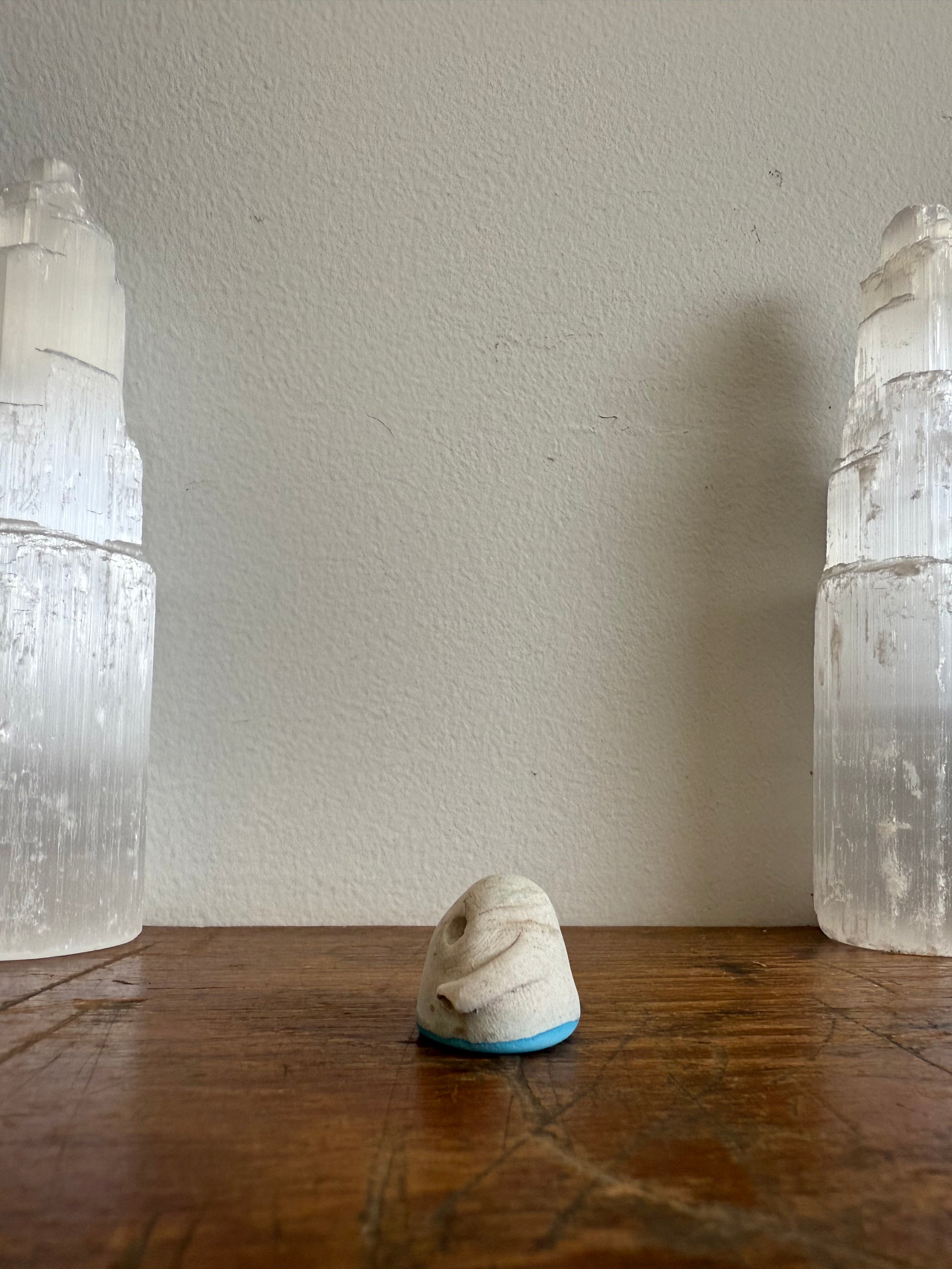 This Domie pictured features a small sky blue base and a light grey "stone" looking upper (with some gold swirls on the head). It has thin arms that wrap around its belly. It is approximately 2cm tall.