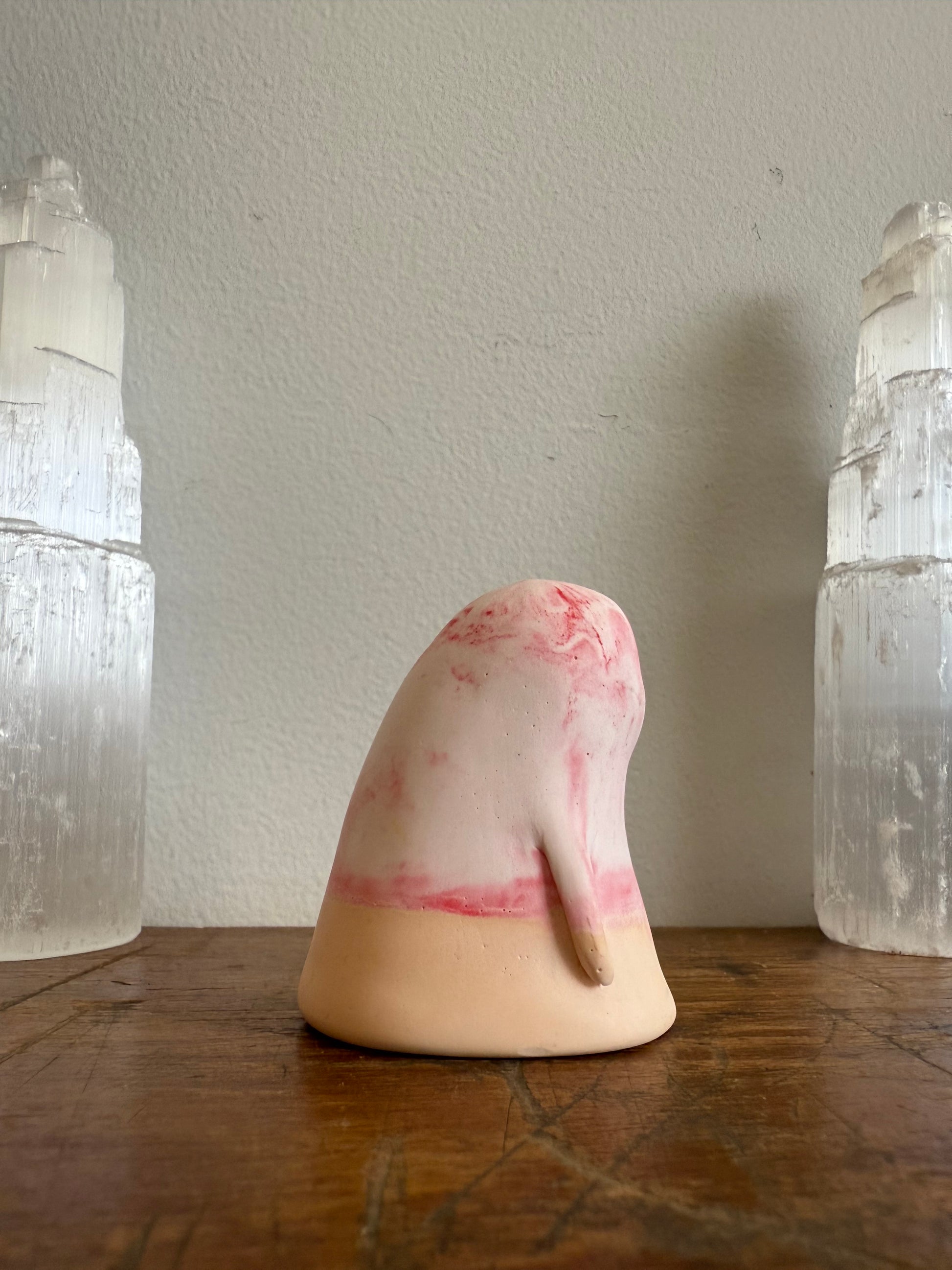 This Domie pictured features a cream base (from it's waist down) with a red and white swirl pattern all over it's body (from the waist up). It has thin arms that hang by it's body. It is approximately 6cm tall.