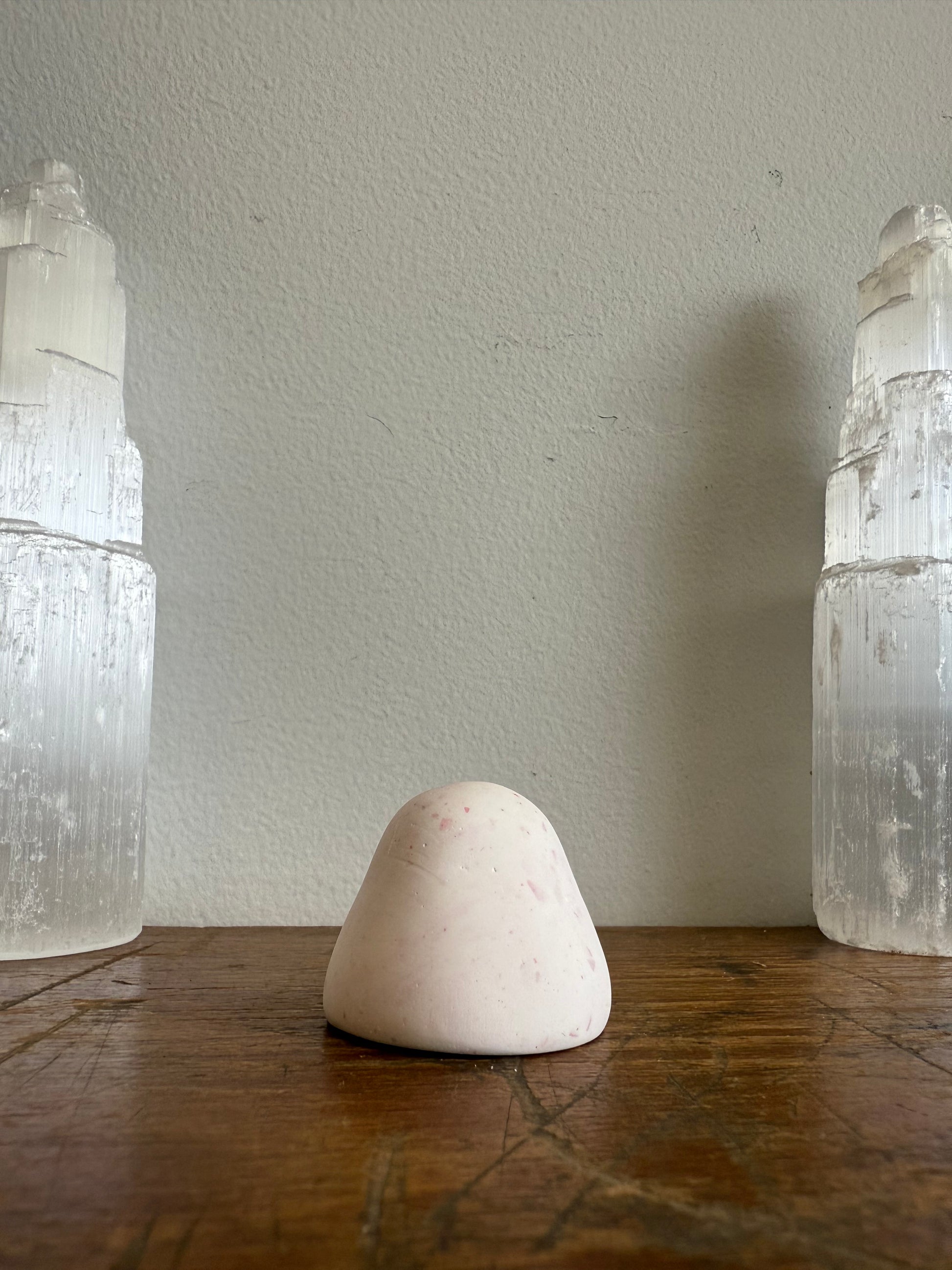 This Domie pictured features a white base colour, then there are speckles of red/pink throughout this little one. It has thin arms that wrap around its belly. It is approximately 3.4 cm tall.