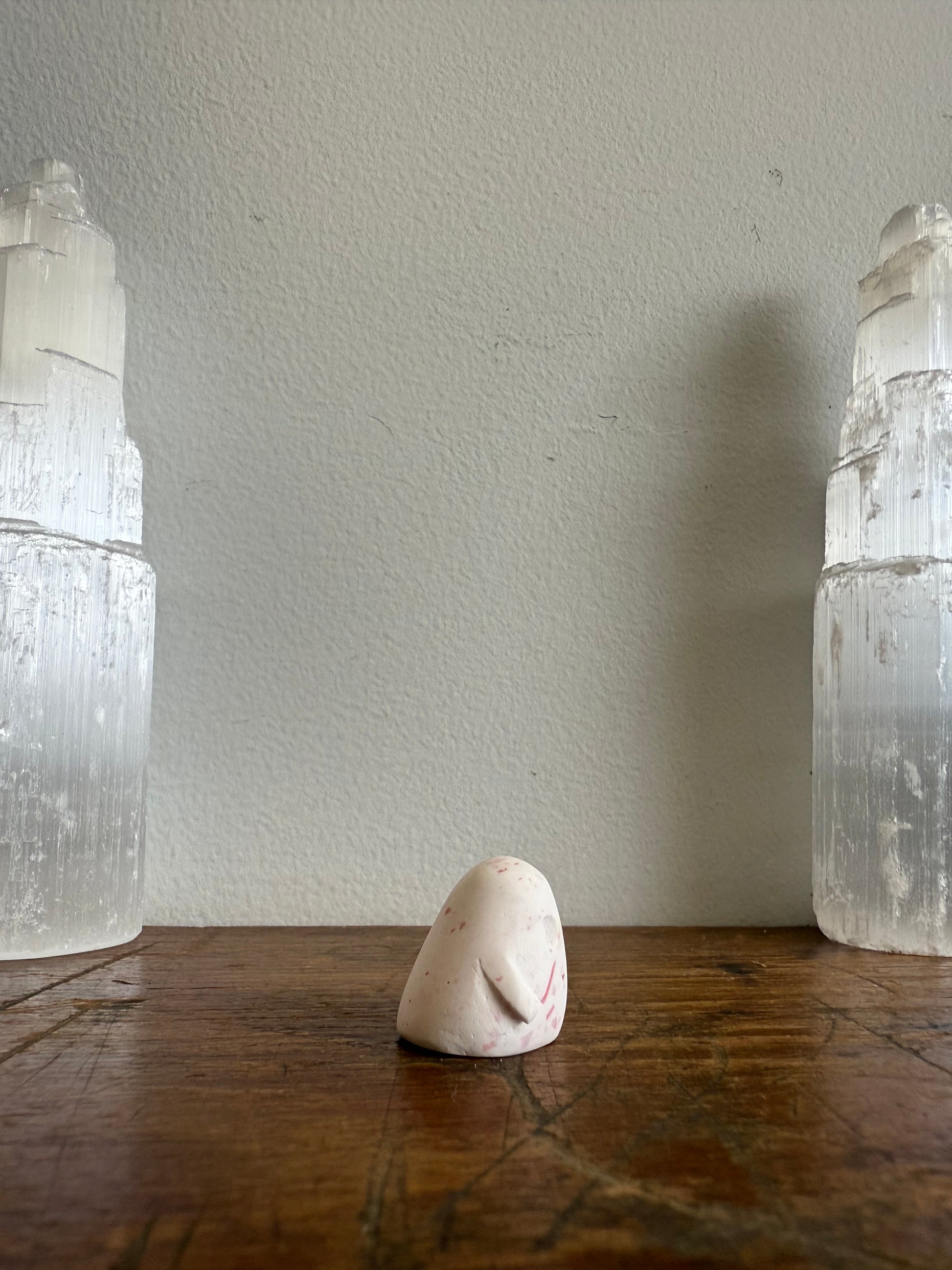 This Domie pictured features a white base colour, then there are speckles of red/pink throughout this little one. It has thin arms that wrap around its belly. It is approximately 2cm tall.