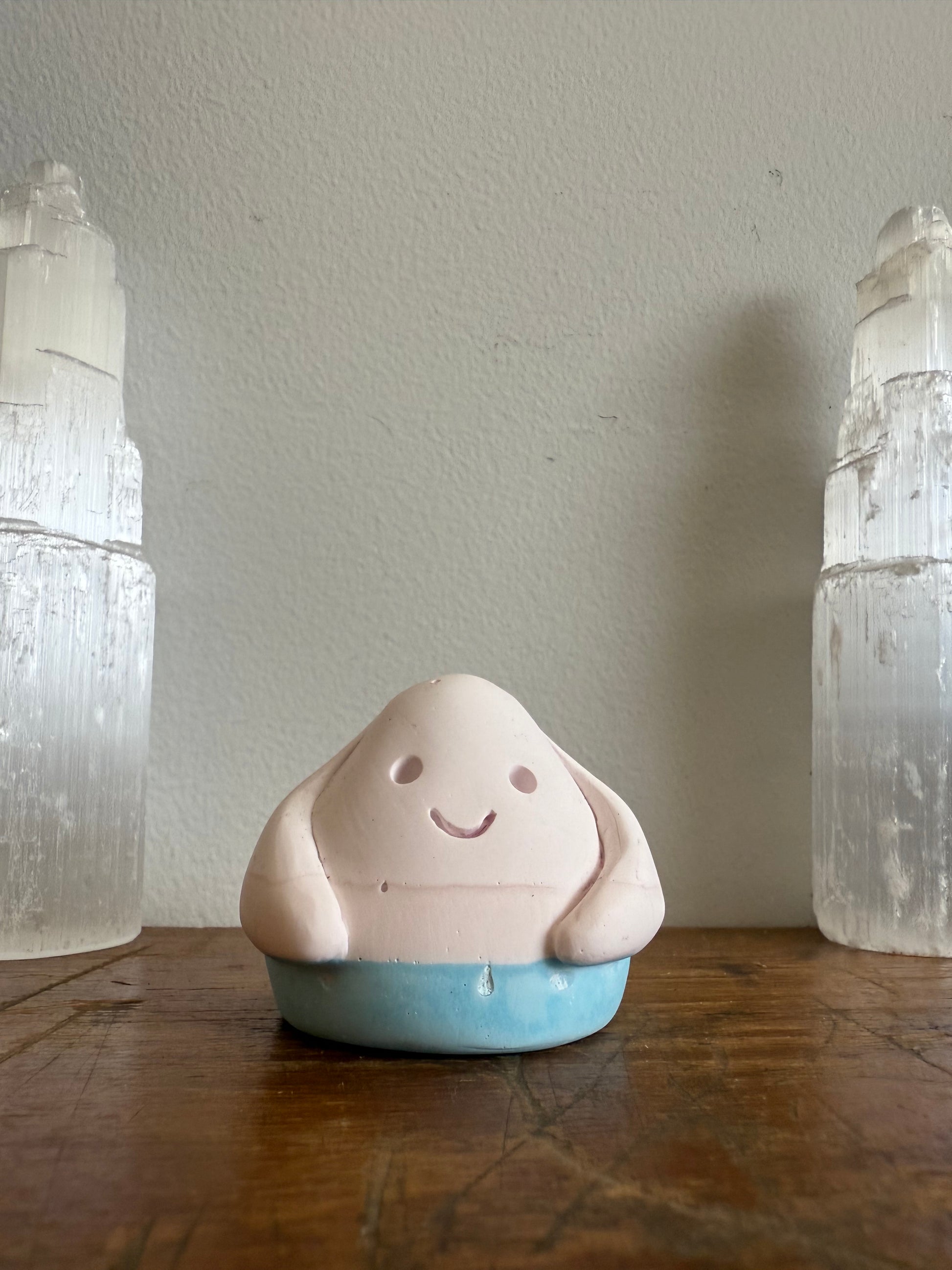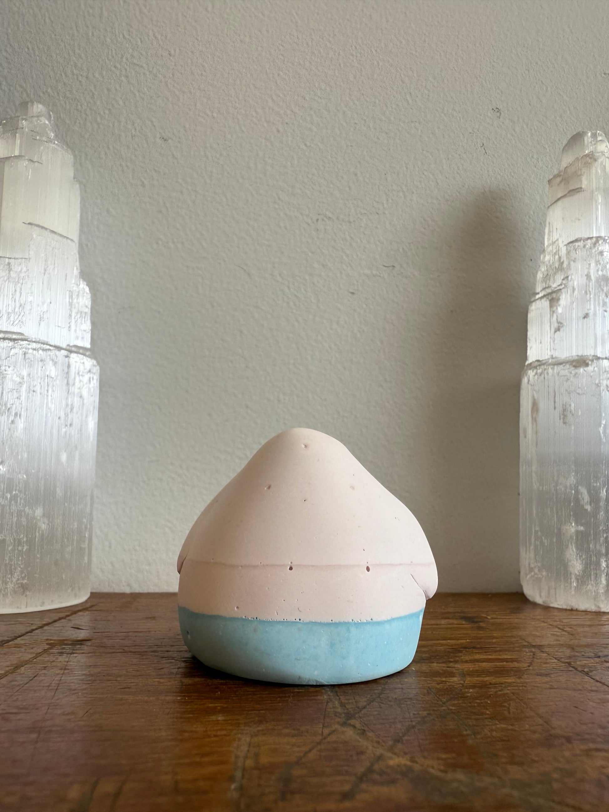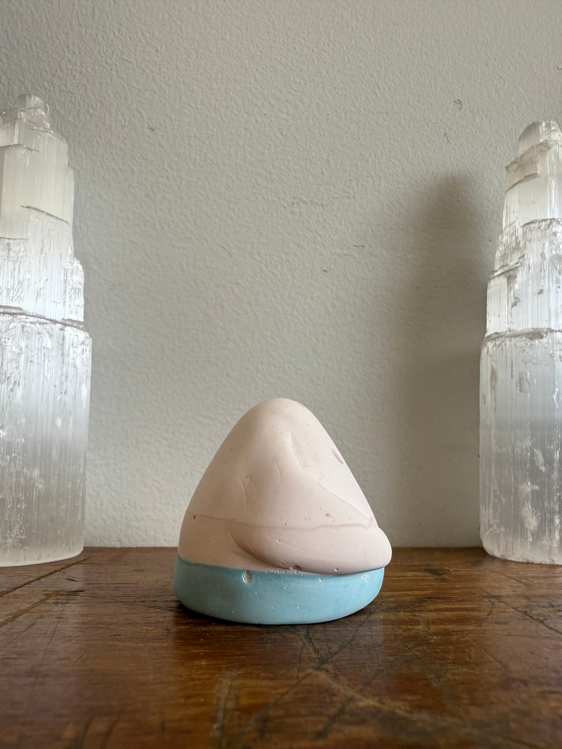 This Domie pictured features 3 separate colours on it's body. The head and face are a very pale Pink (Almost white), then the middle section is a slightly darker pink (but still very pale), finally the base is a sky blue. It has thick arms that wrap around it's body. It is approximately 4.5cm tall.