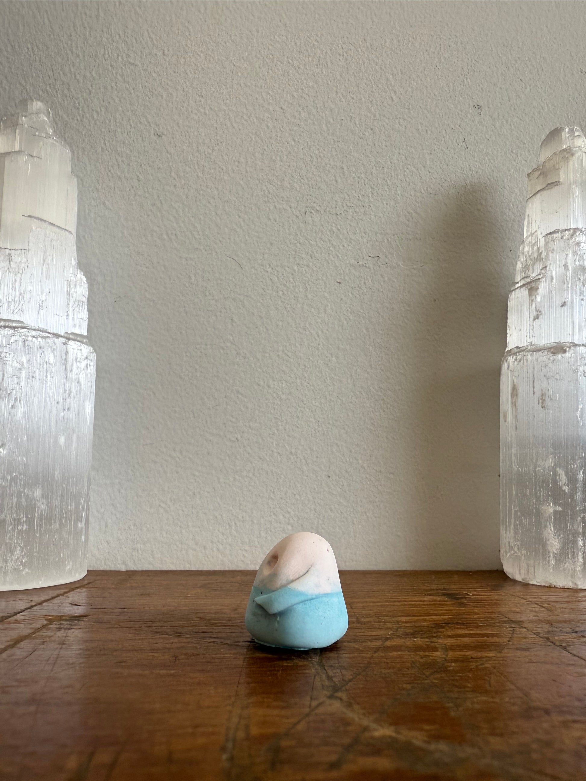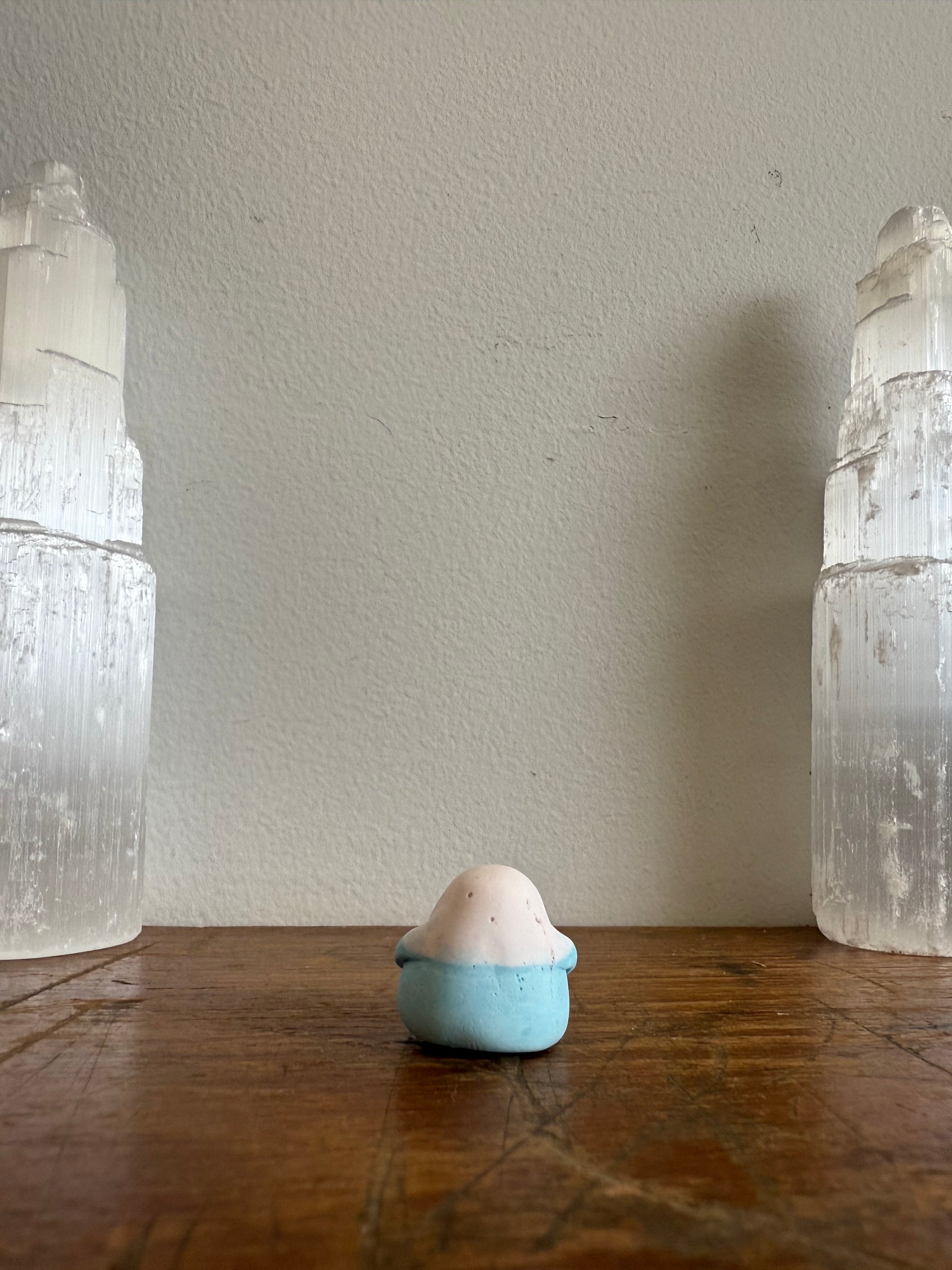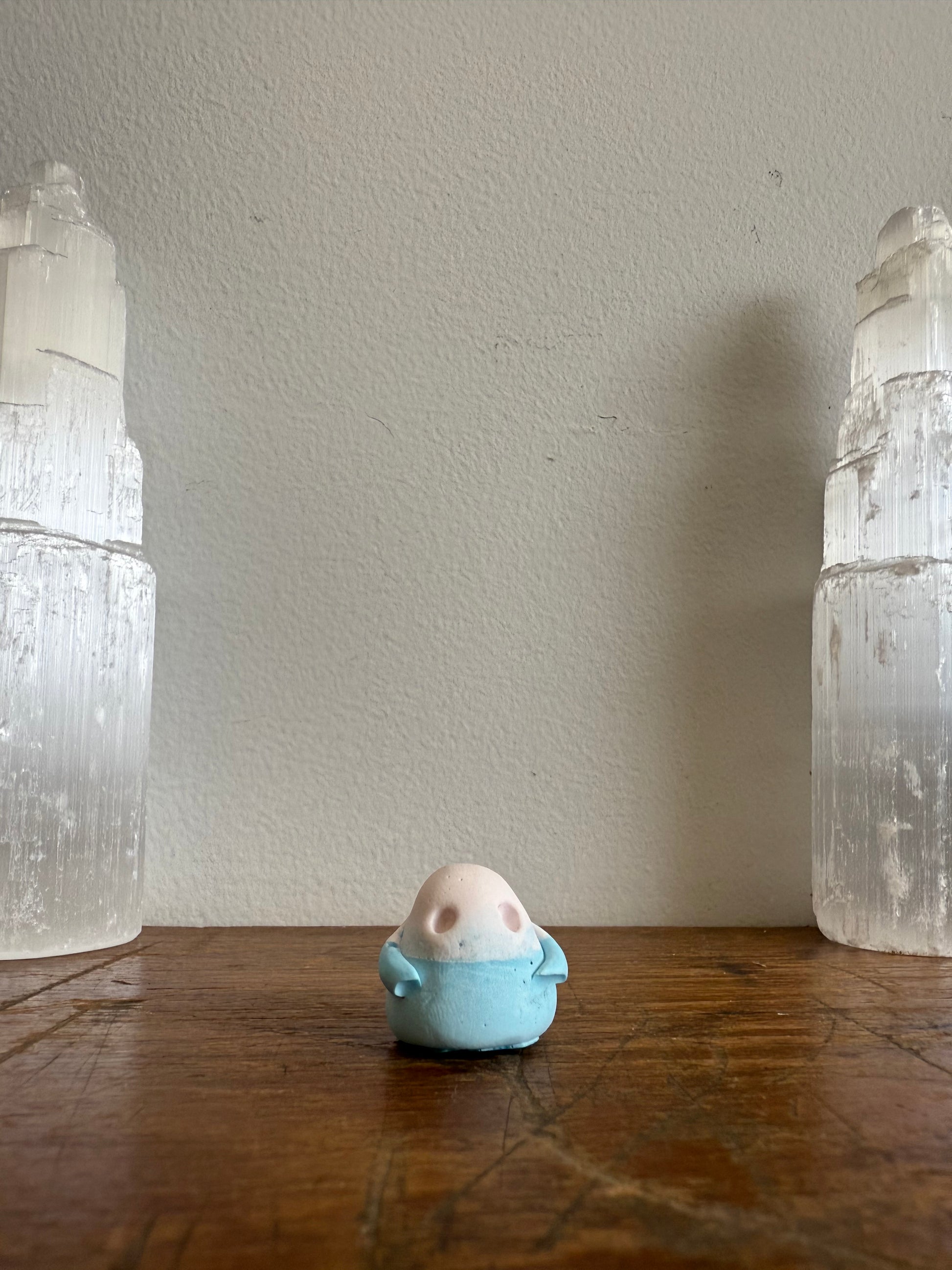 This Domie pictured features 2 separate colours on it's body. The head and face are a very pale Pink (Almost white), the base is a sky blue. It has thin arms that wrap around it's body. It is approximately 2cm tall.