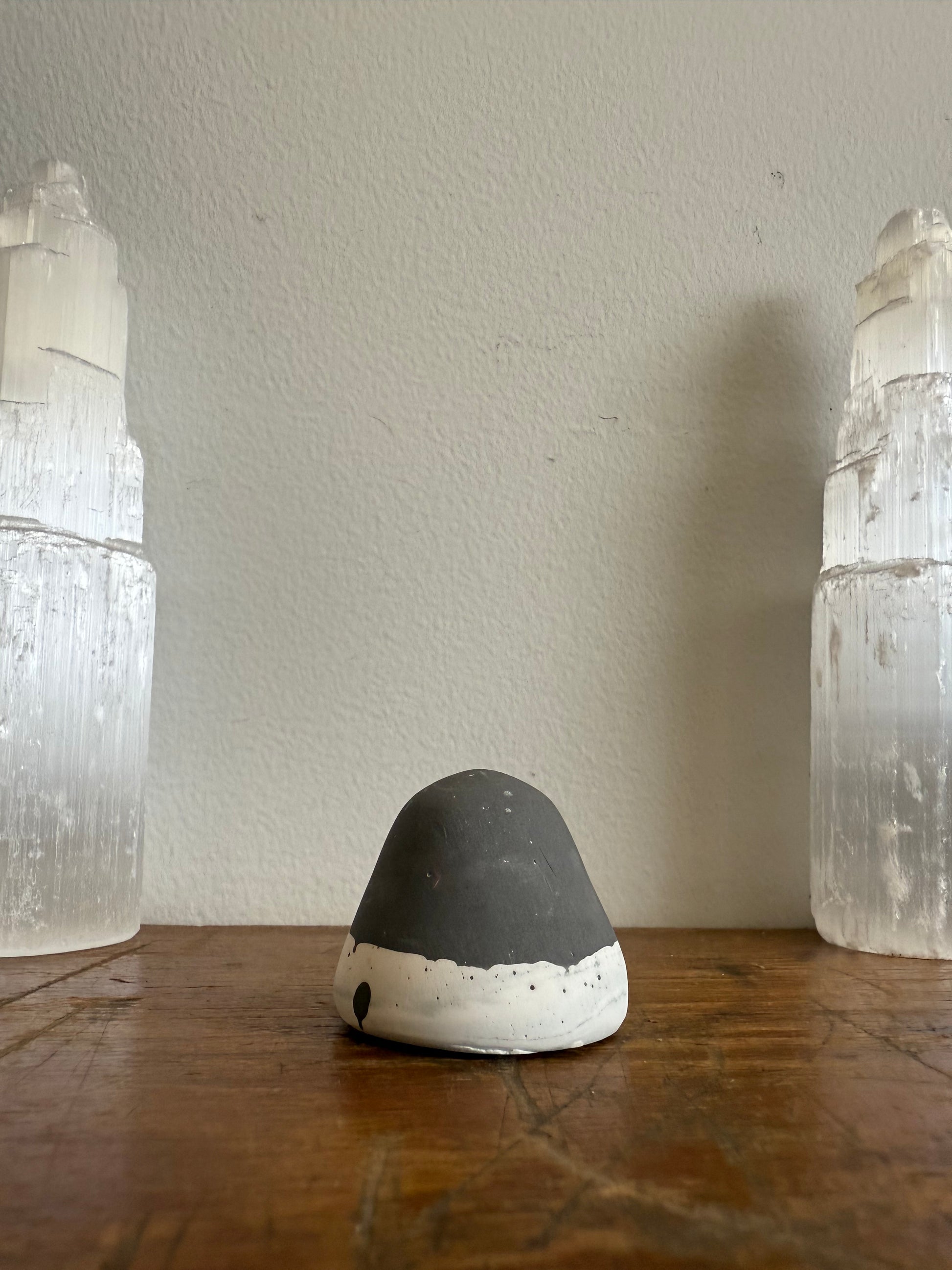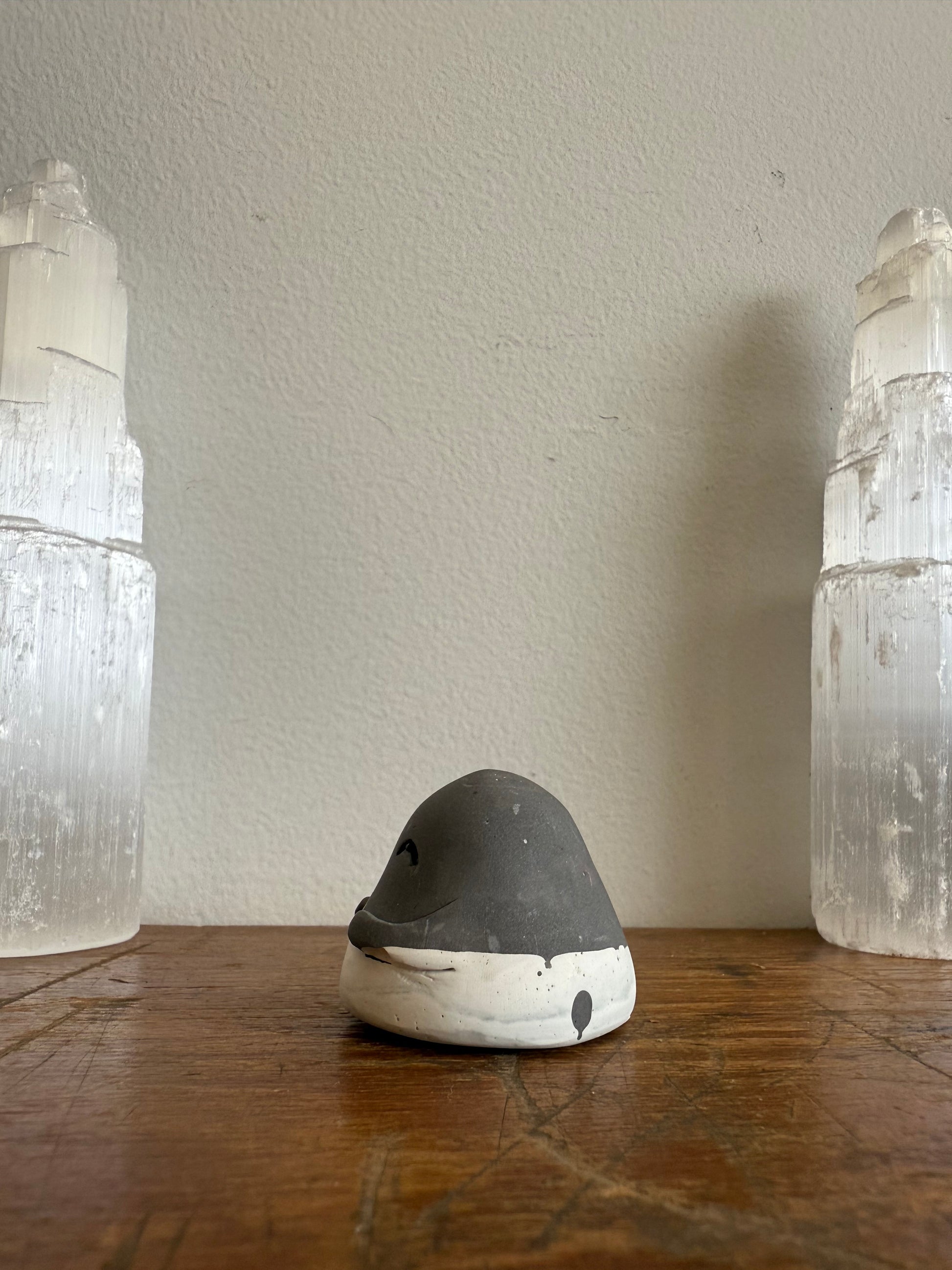 This Domie pictured features a small white (with dark speckled/swirly) base and a dark grey/black "stone" looking upper. It has thin arms that wrap around its belly. It is approximately 3.4 cm tall.