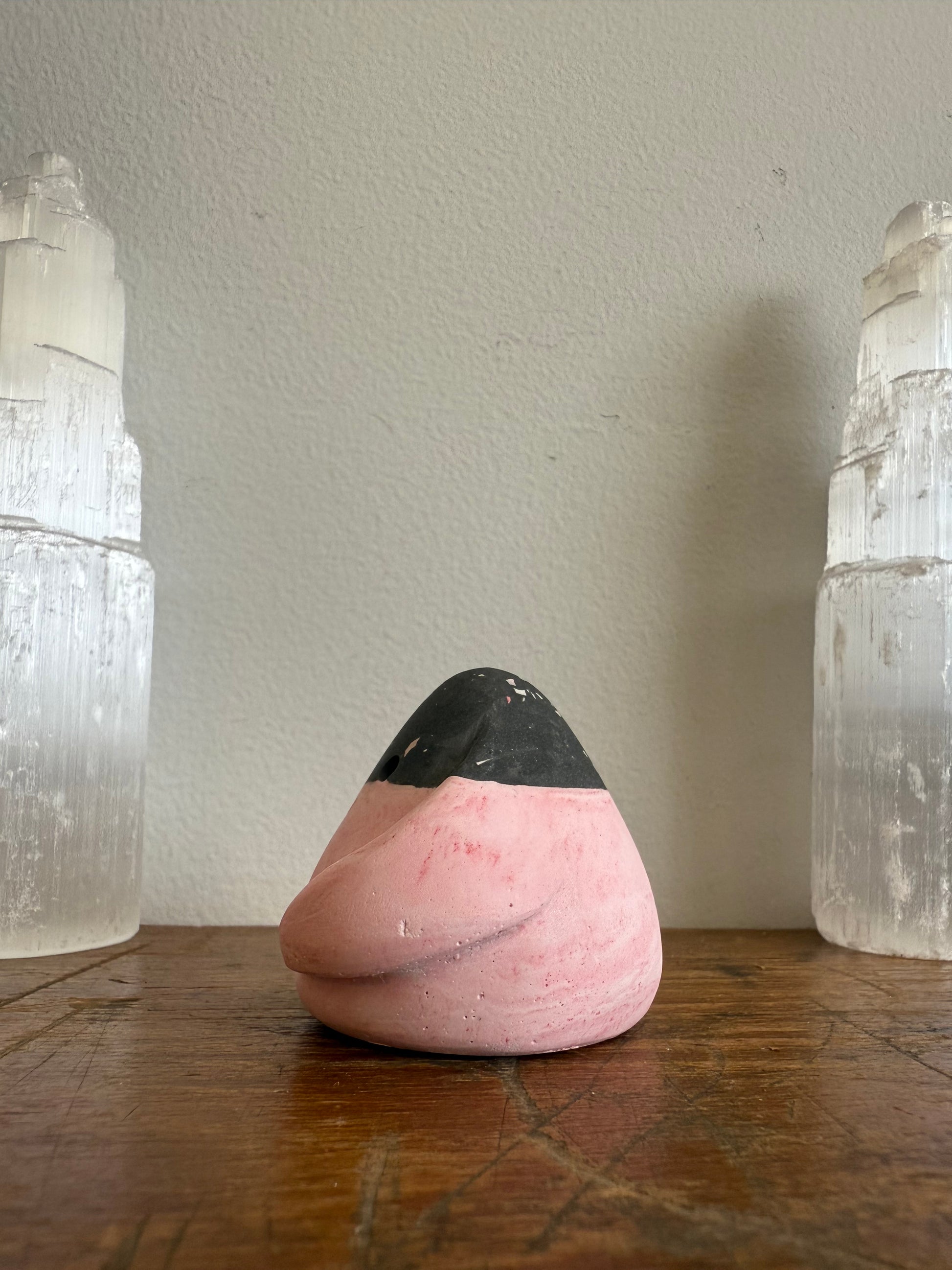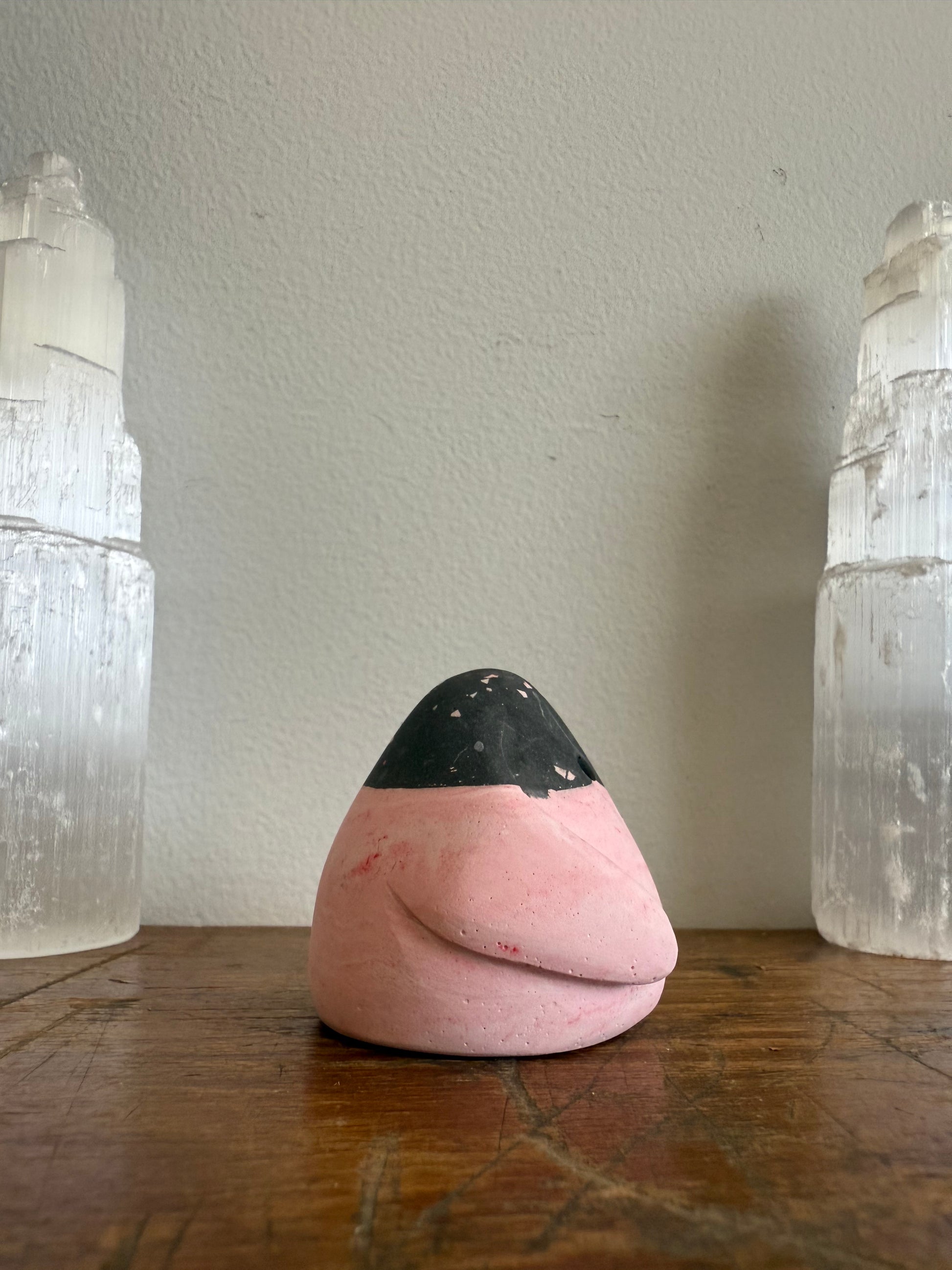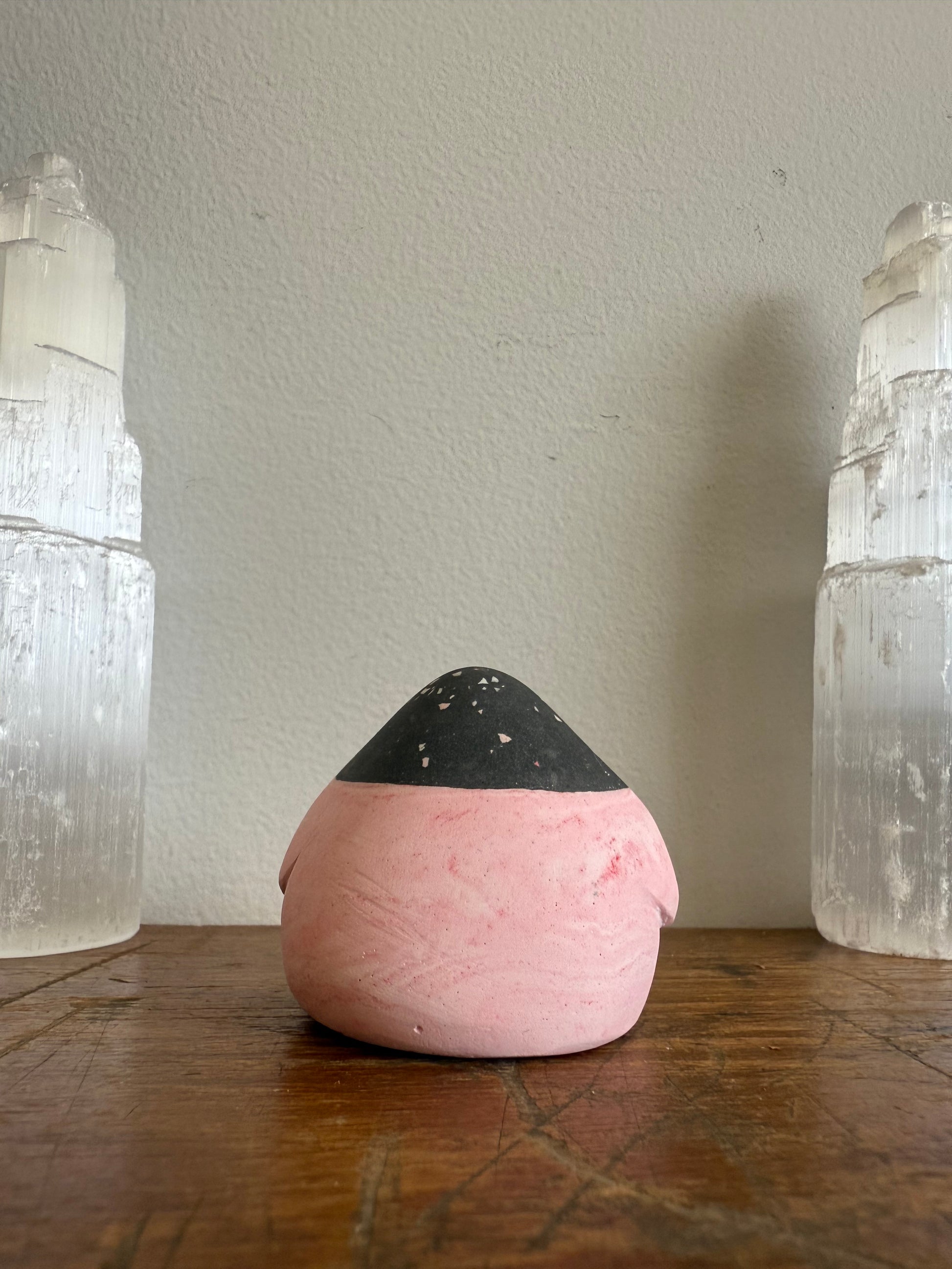 This Domie pictured features 2 colourful patterns; on top from the eyes up there is a dark grey/black colour with a pink and white speckle inside it. From the eyes down; there is a pink and white swirly pattern. It has thick arms that wrap around it's body. It is approximately 4.5cm tall.