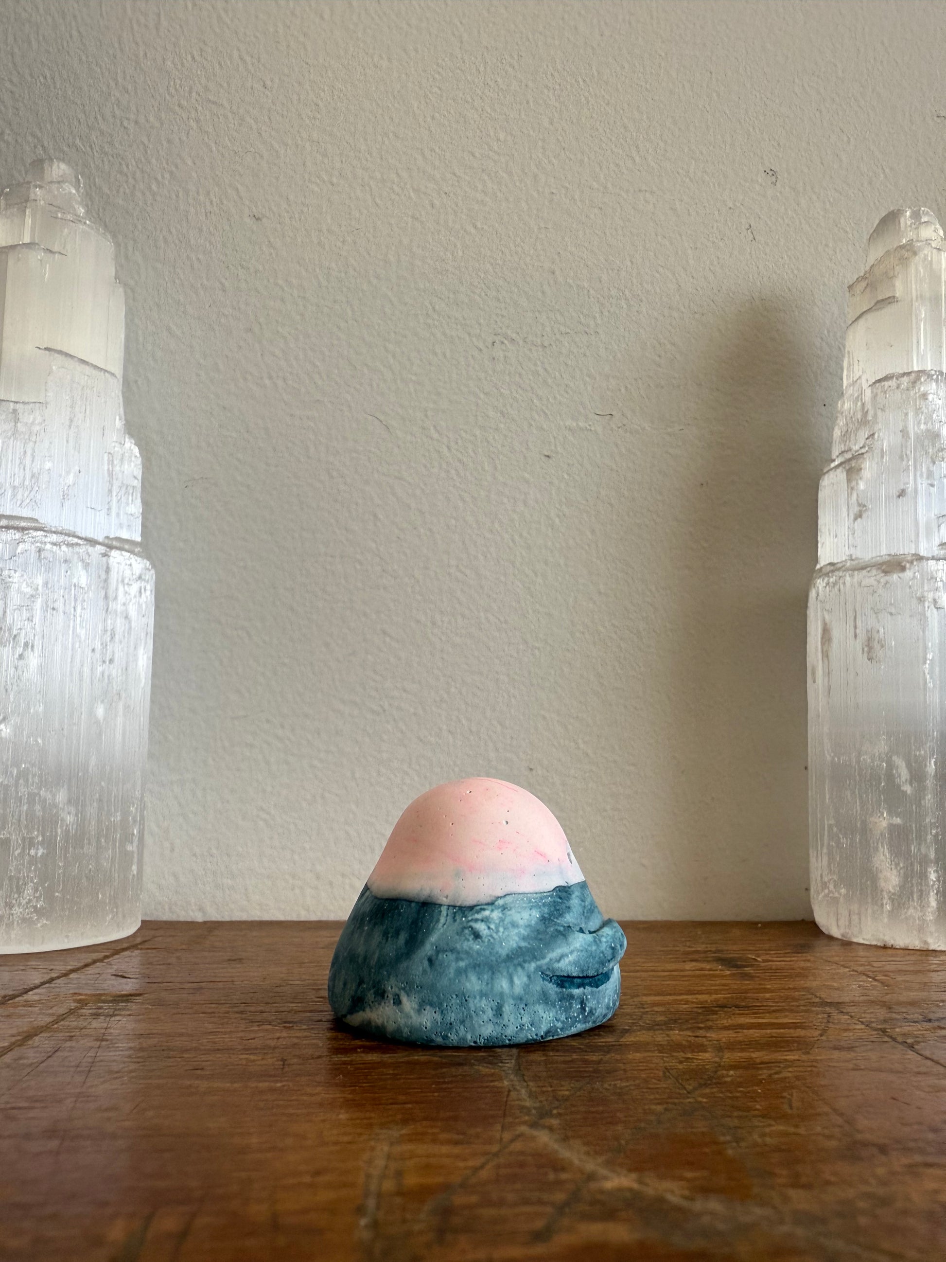 This Domie pictured features 2 swirly colours, the top (from eyes up) is a pastel/light Pink swirl, the base is a light blue/sky blue swirl with thin arms that wrap around its belly. It is approximately 3.4 cm tall.