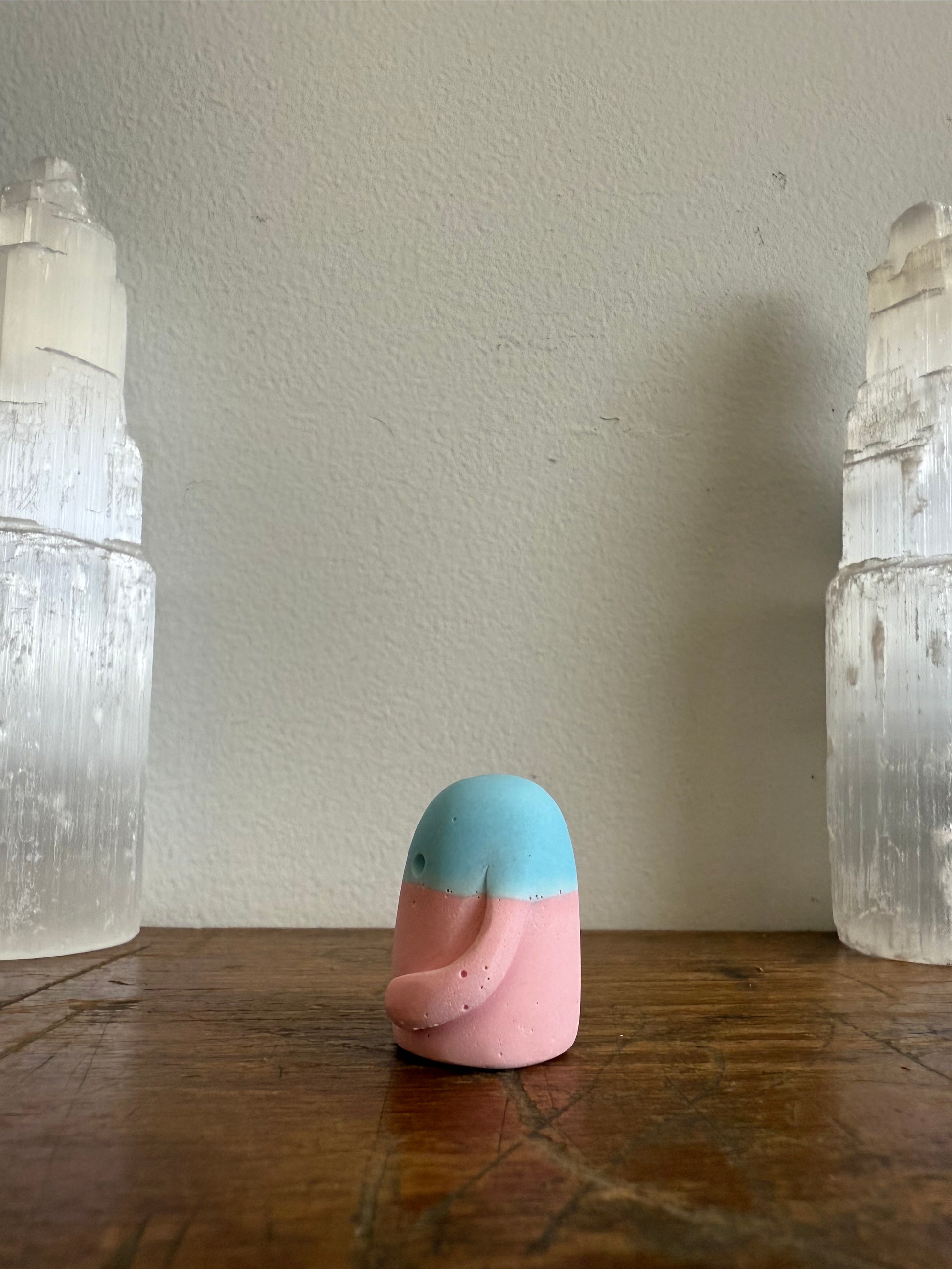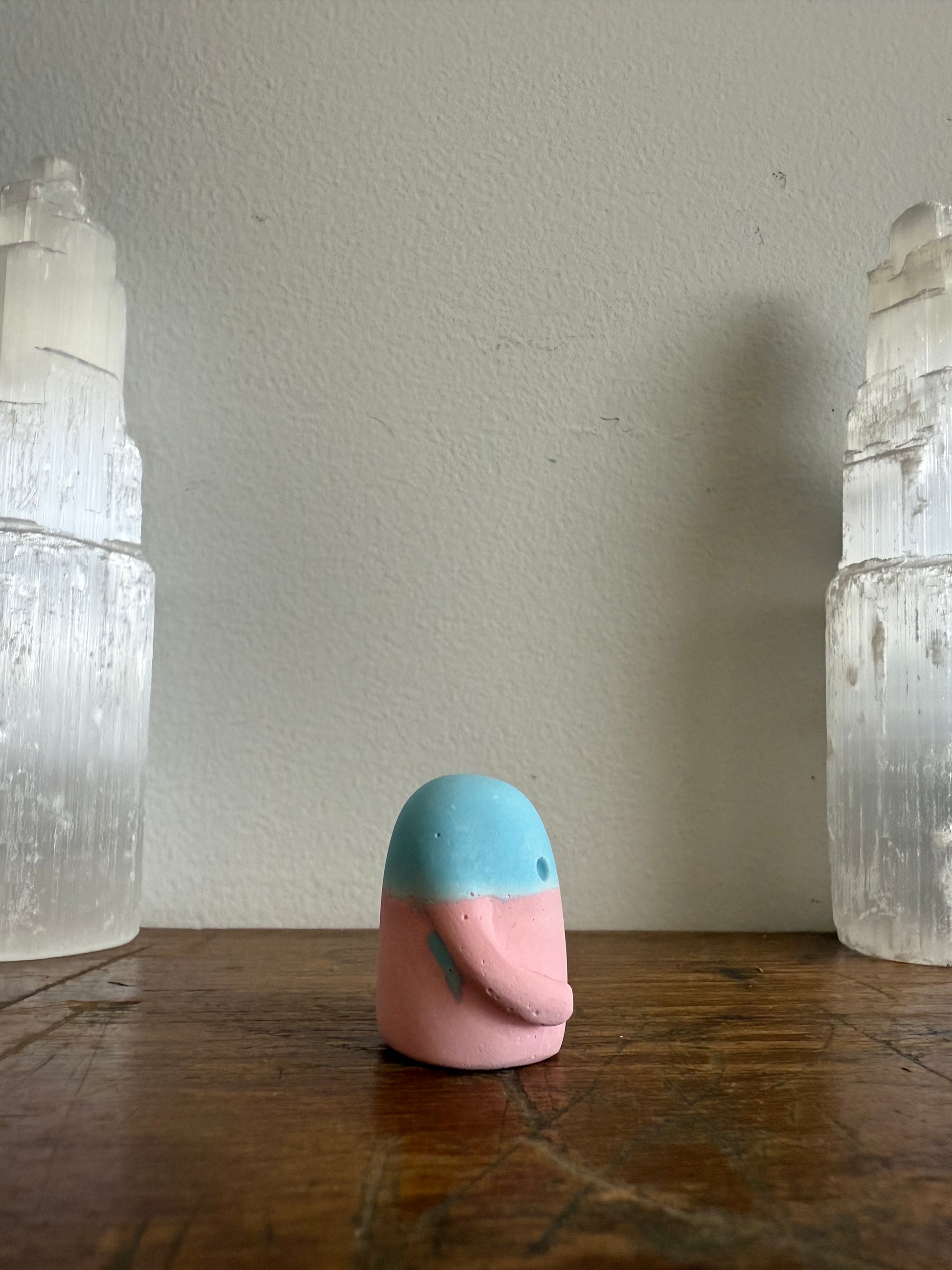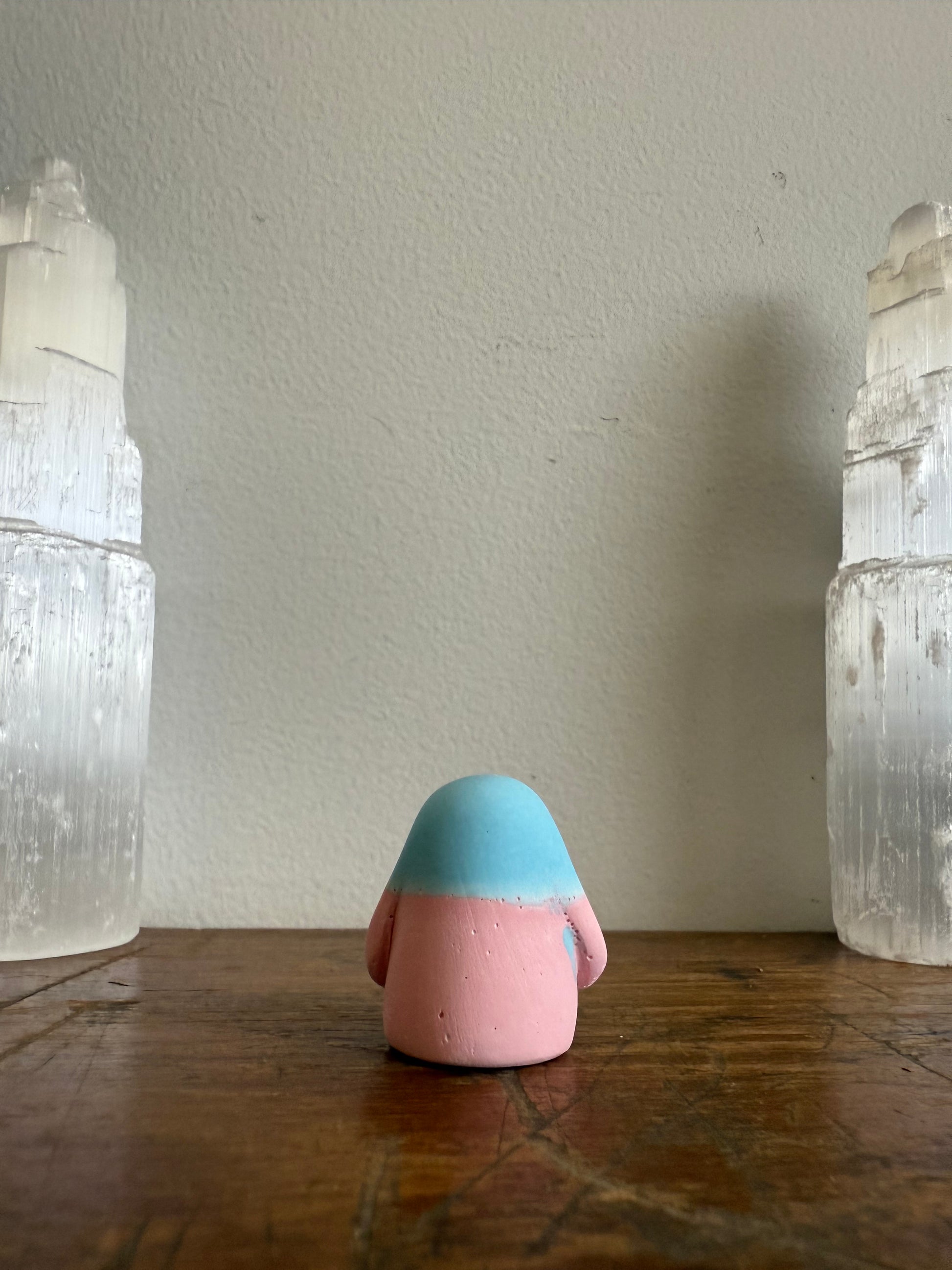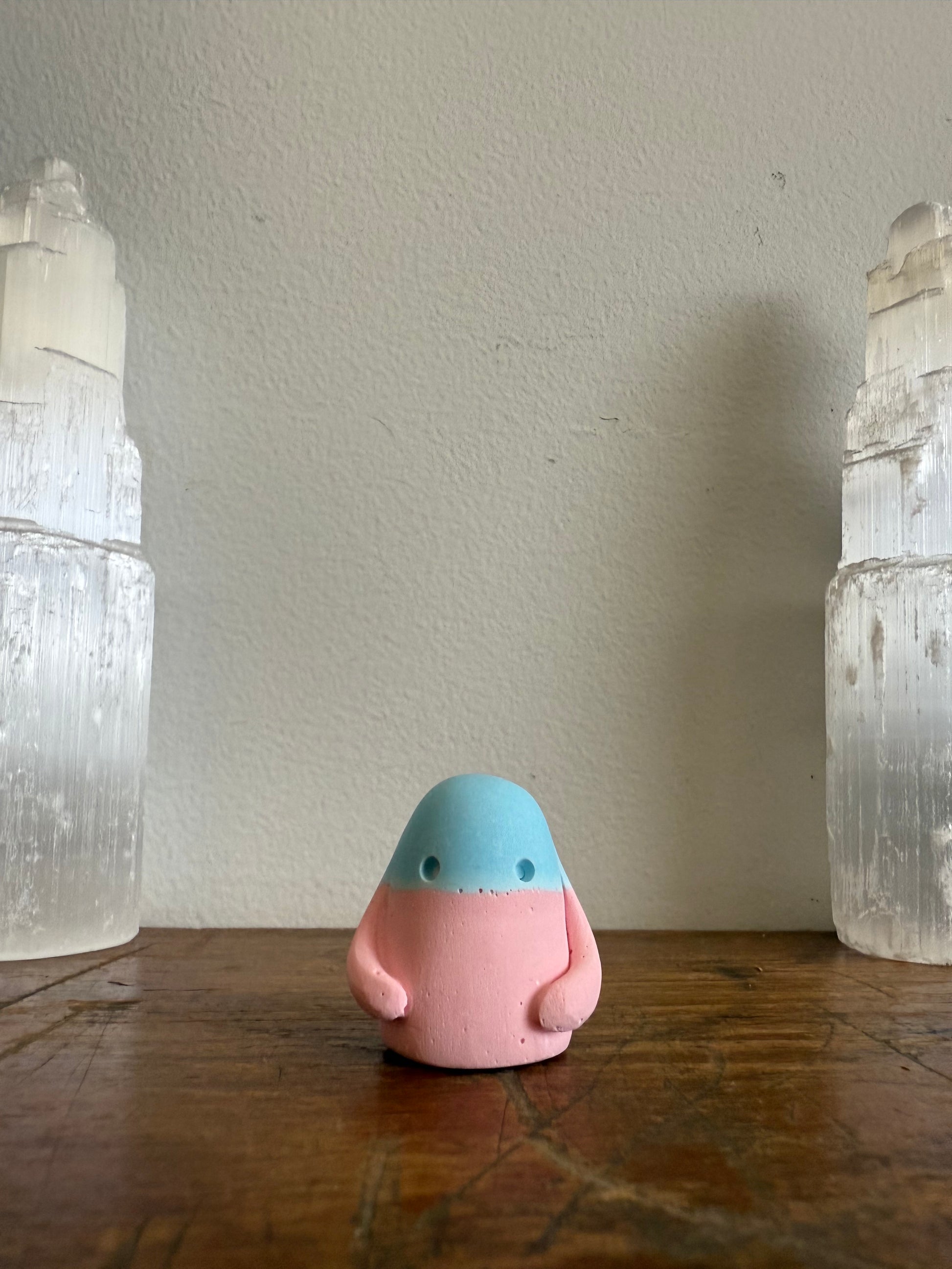 This Domie pictured features 2 different layers of colour. The top from the eyes up is a sky blue colour, from the eyes down it's pastel pink. It has thin arms that hang by it's body. It is approximately 3.1cm tall.