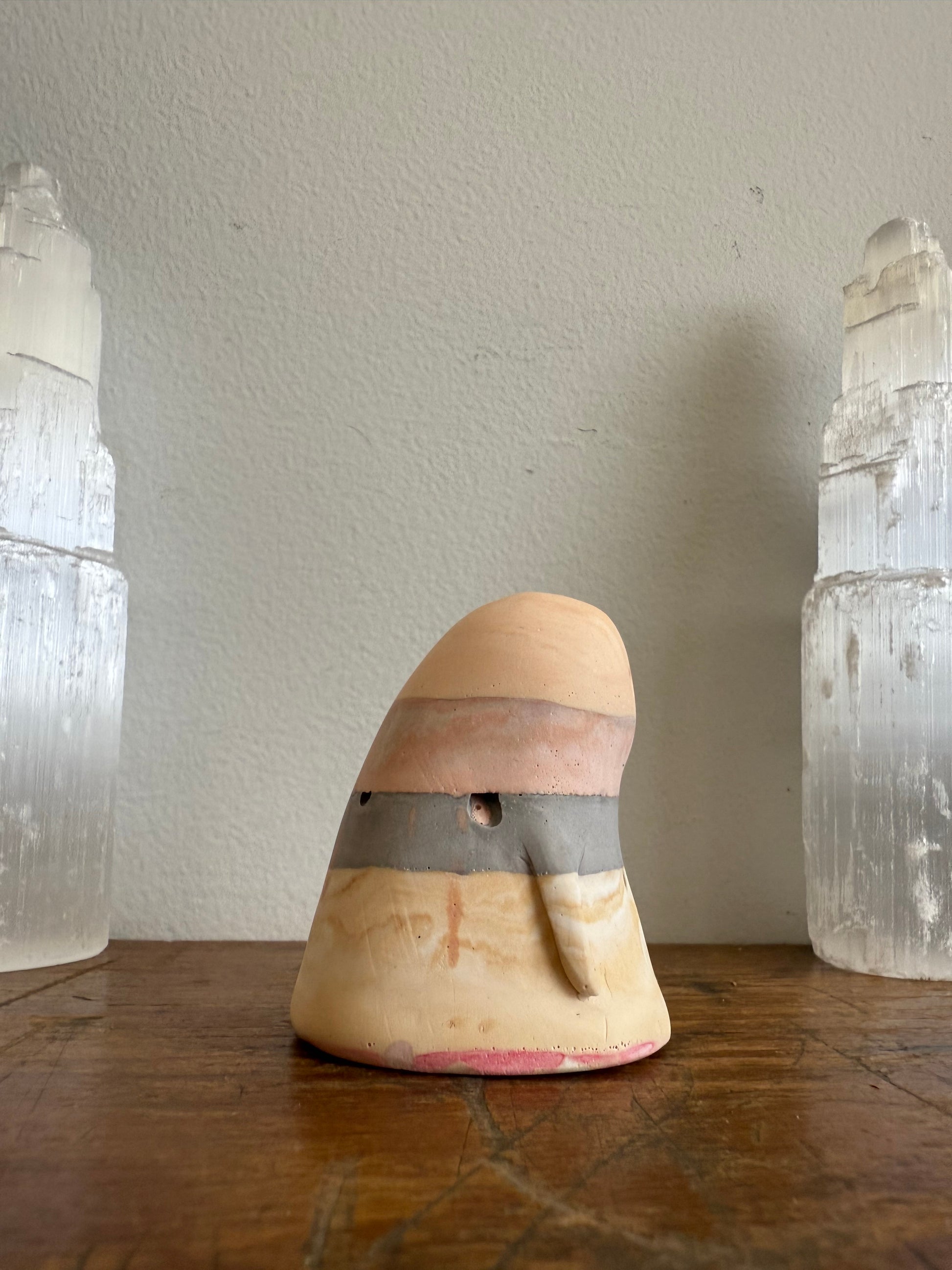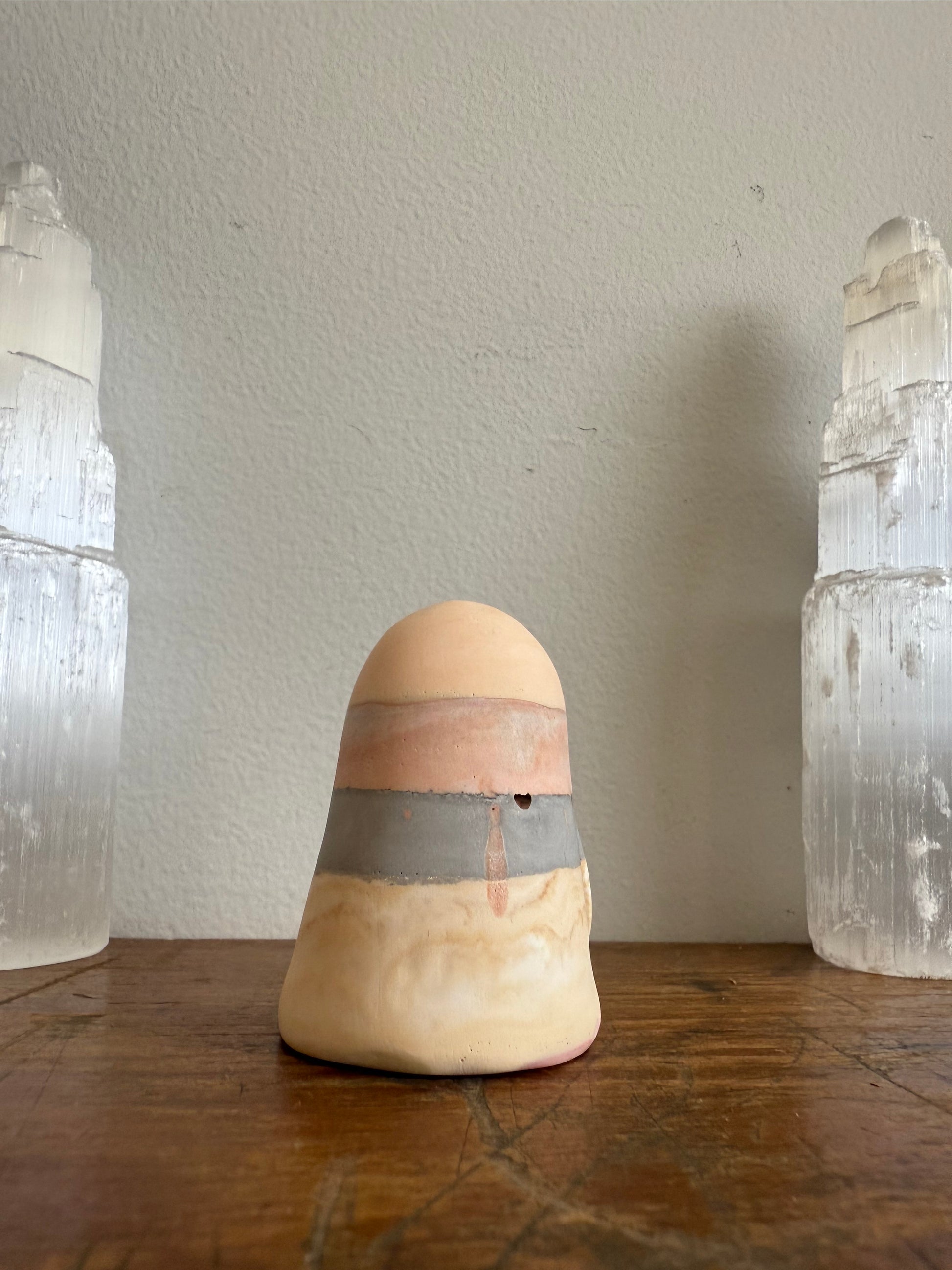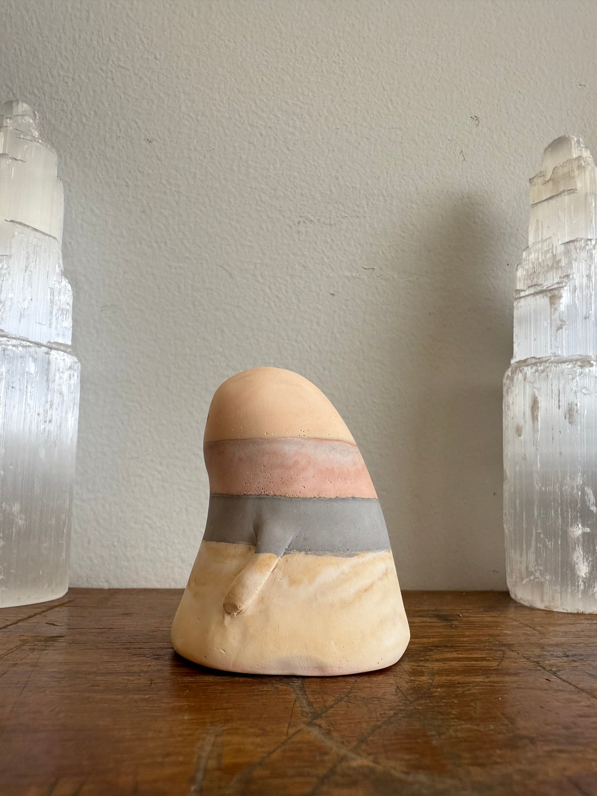 This Domie pictured features multiple different colour patterns; starting at the top theres a pale orange swirl, then a darker orange swirl pattern, below that is a solid grey, then the bottom layer is a swirly mustard/cream pattern. Under the bottom of the domie is a pink/white swirl. It has thin arms that hang by it's body. It is approximately 6cm tall.