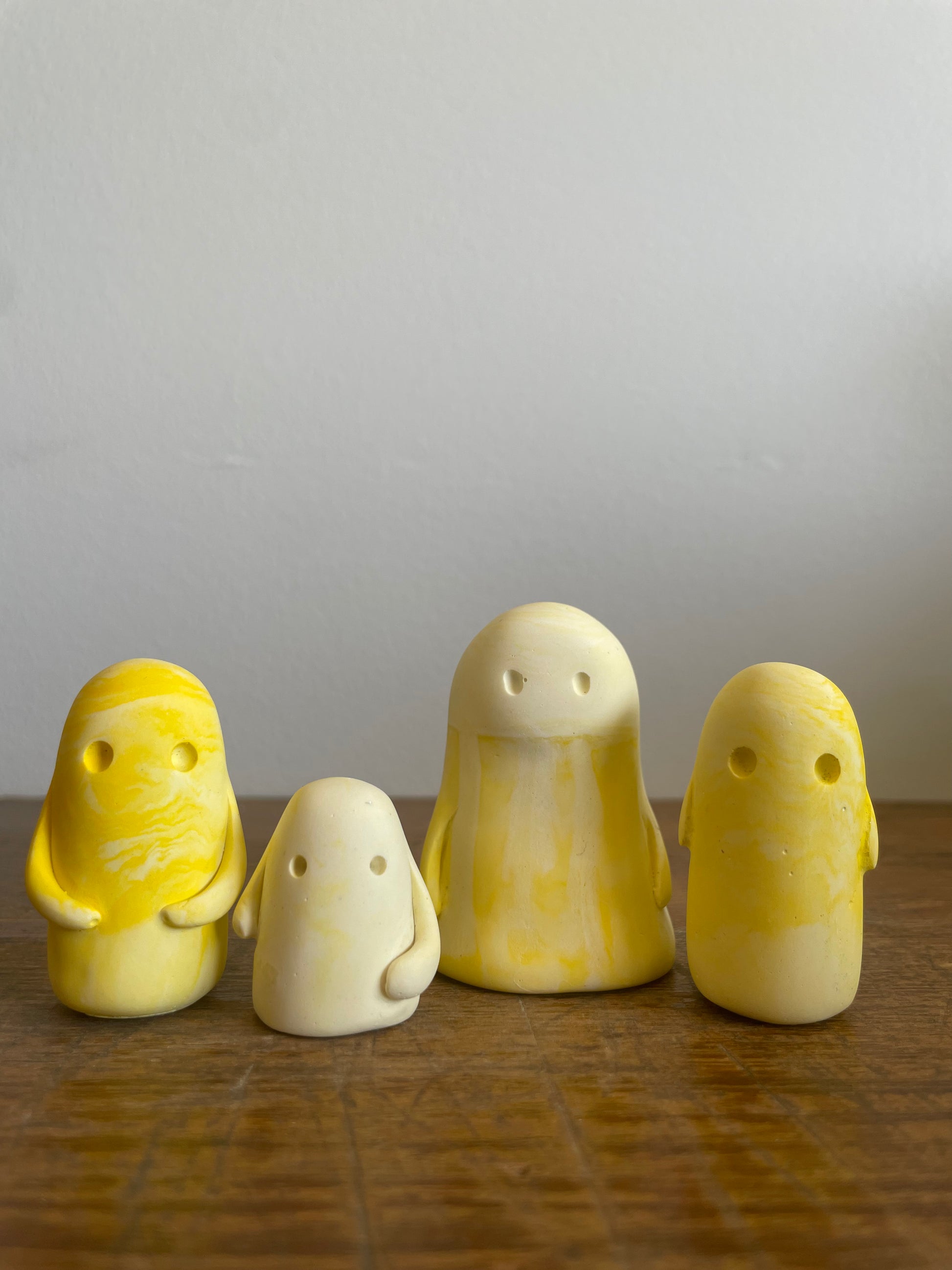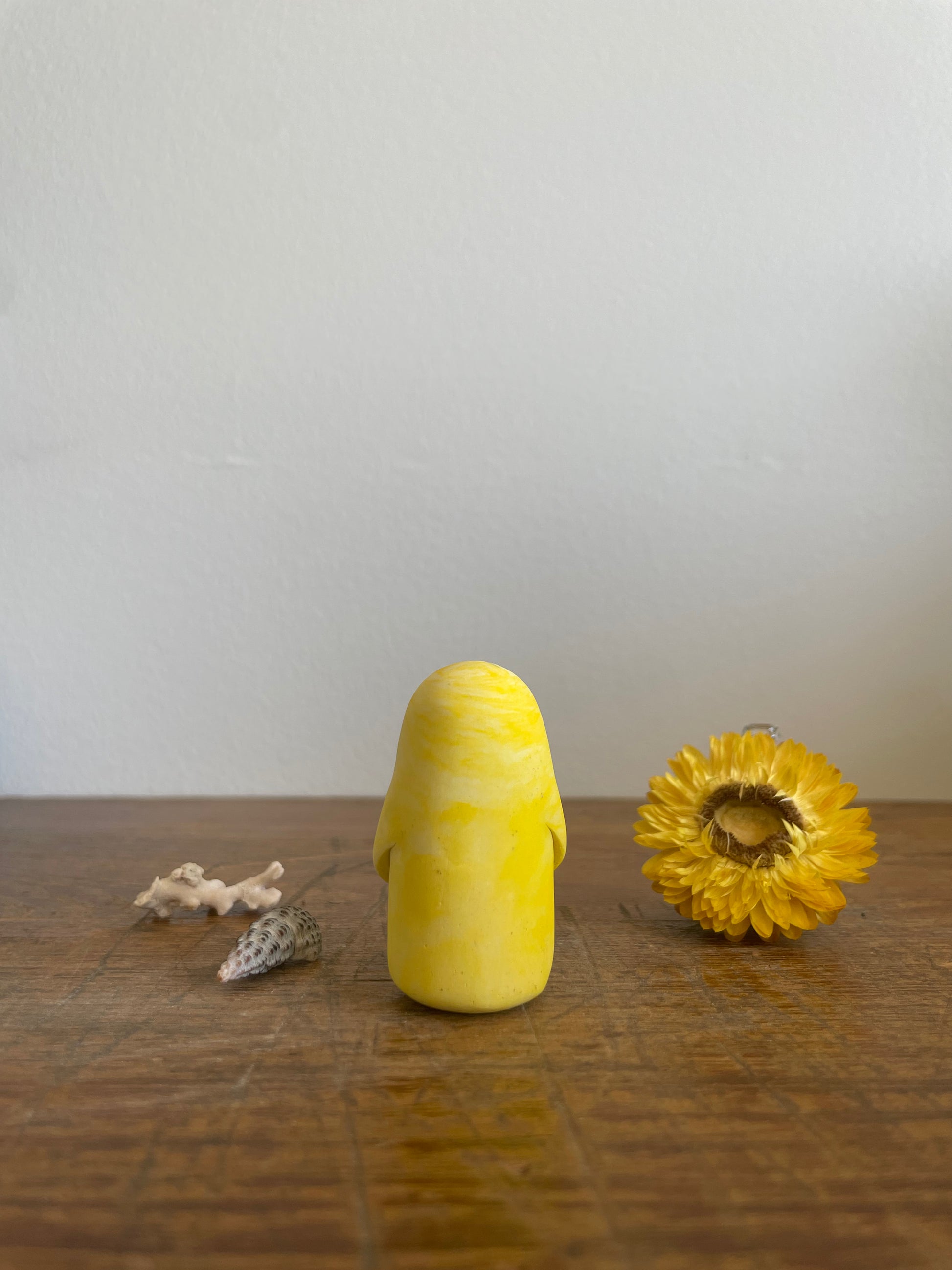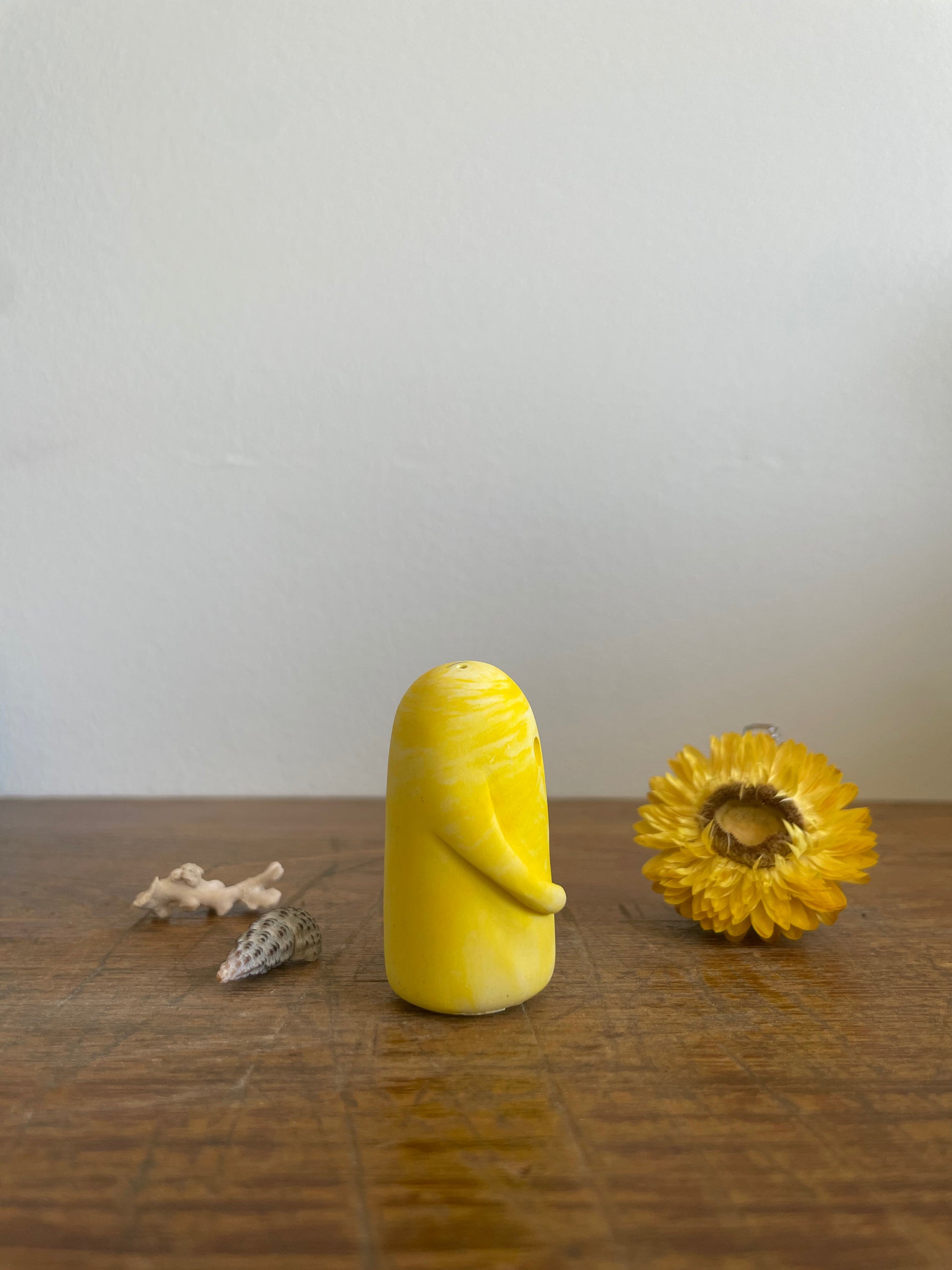 This Domie pictured features a bright yellow and white marbling colour on the body with long arms that wrap around its body. It is approximately 4.7 cm tall.