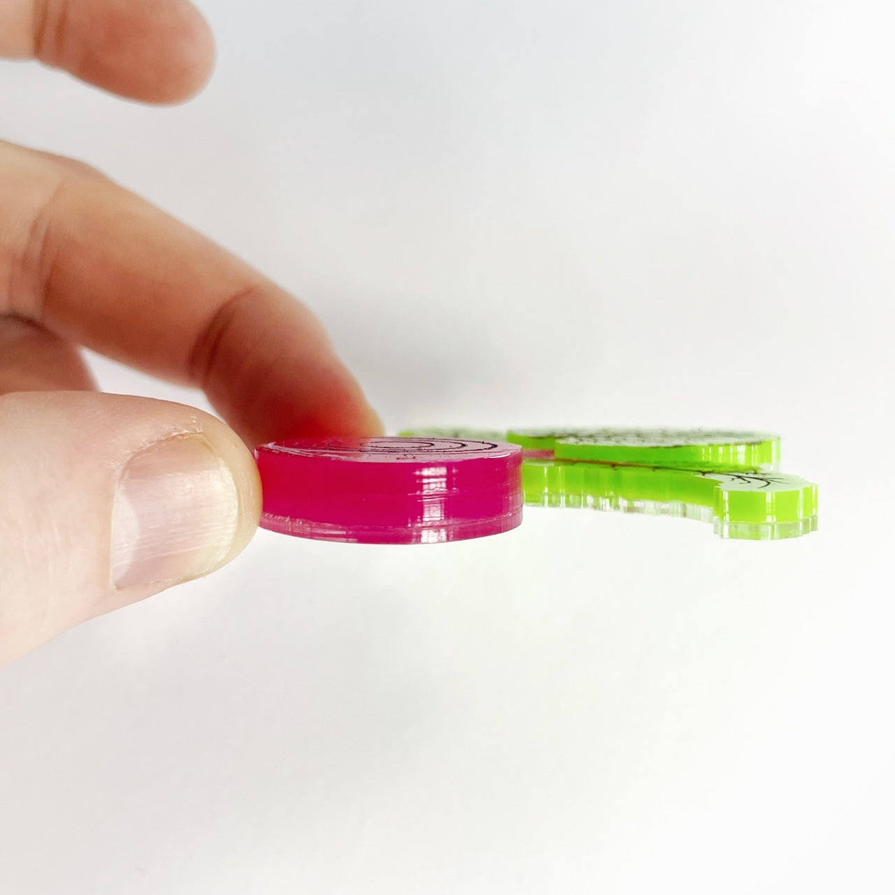 Bears....Beets....Battlestar Galactica. If they're good enough for Dwight, then who are we to dispute their awesomeness..? This simple but adorable design represents the beautiful colours that Autumn brings to it's vegetables and season. Made with layered Clear, Green and Hot Pink acrylics. It's all finished with a large brooch back. This brooch is designed, etched, handpainted and assembled lovingly by us.